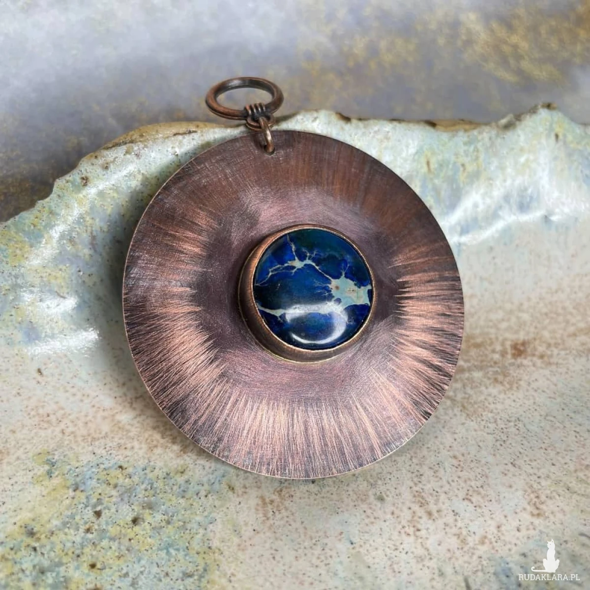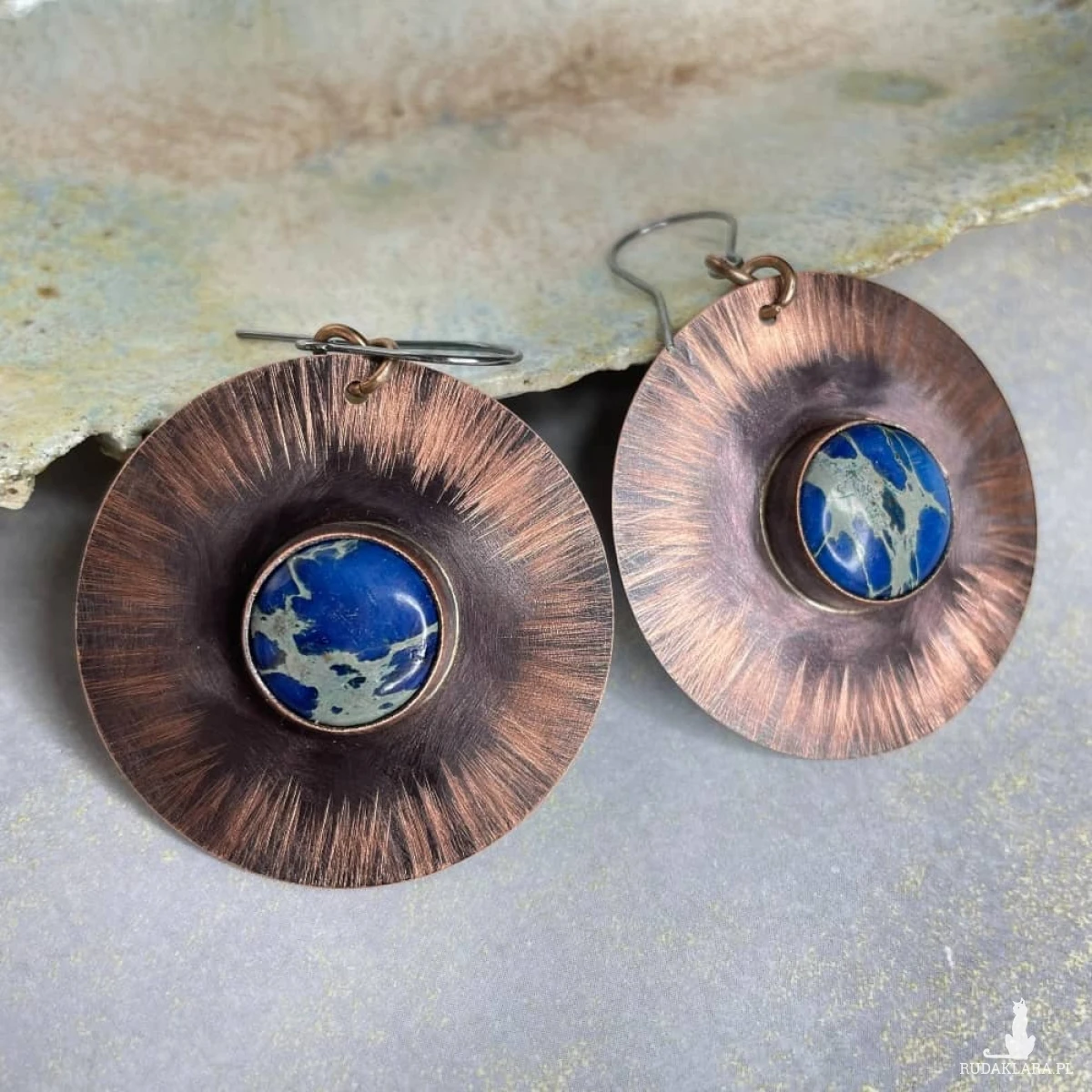 Komplet biżuterii z miedzianymi kołami i jaspisem cesarskim to idealny wybór dla miłośniczek charakterystycznego ciepła miedzi. Czerniona i fakturowana miedź podkreśla charakter dodatków, a intensywny kolor kamieni pięknie kontrastuje z metalicznym blaskiem. Bigle wykonano z czernionego srebra próby 925, co dodaje całości elegancji.