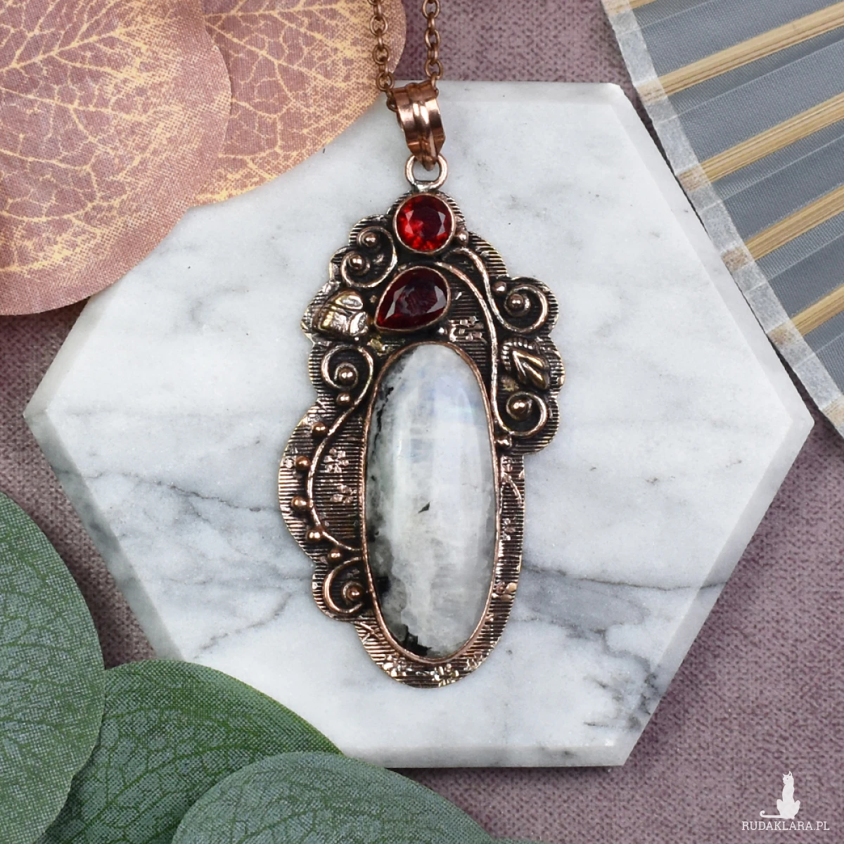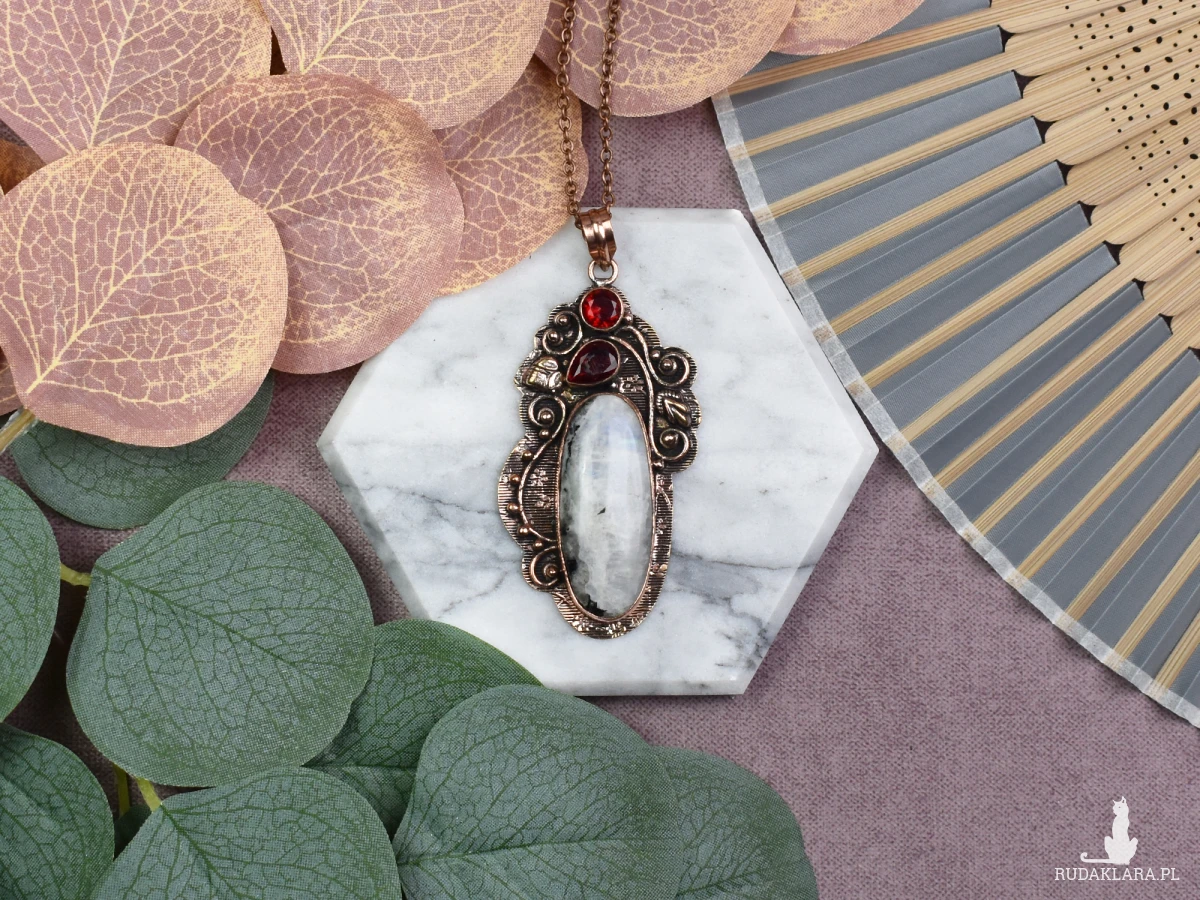 Piękny wisiorek z miedzi z kamieniem księżycowym i granatem to wyjątkowy dodatek do każdej stylizacji. Kamień księżycowy dodaje mu delikatności, emanując subtelnym blaskiem, podczas gdy granat dodaje głębi koloru i elegancji. Dodatkowo, kamień księżycowy jest uznawany za symbol intuicji i ochrony, przynosząc równowagę emocjonalną, podczas gdy granat jest kojarzony z energią, pasją i determinacją. To nie tylko ozdoba, lecz także talizman łączący estetykę z głębszym znaczeniem.