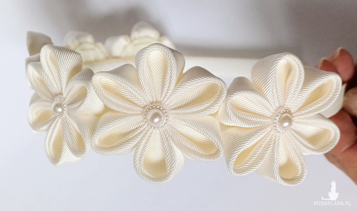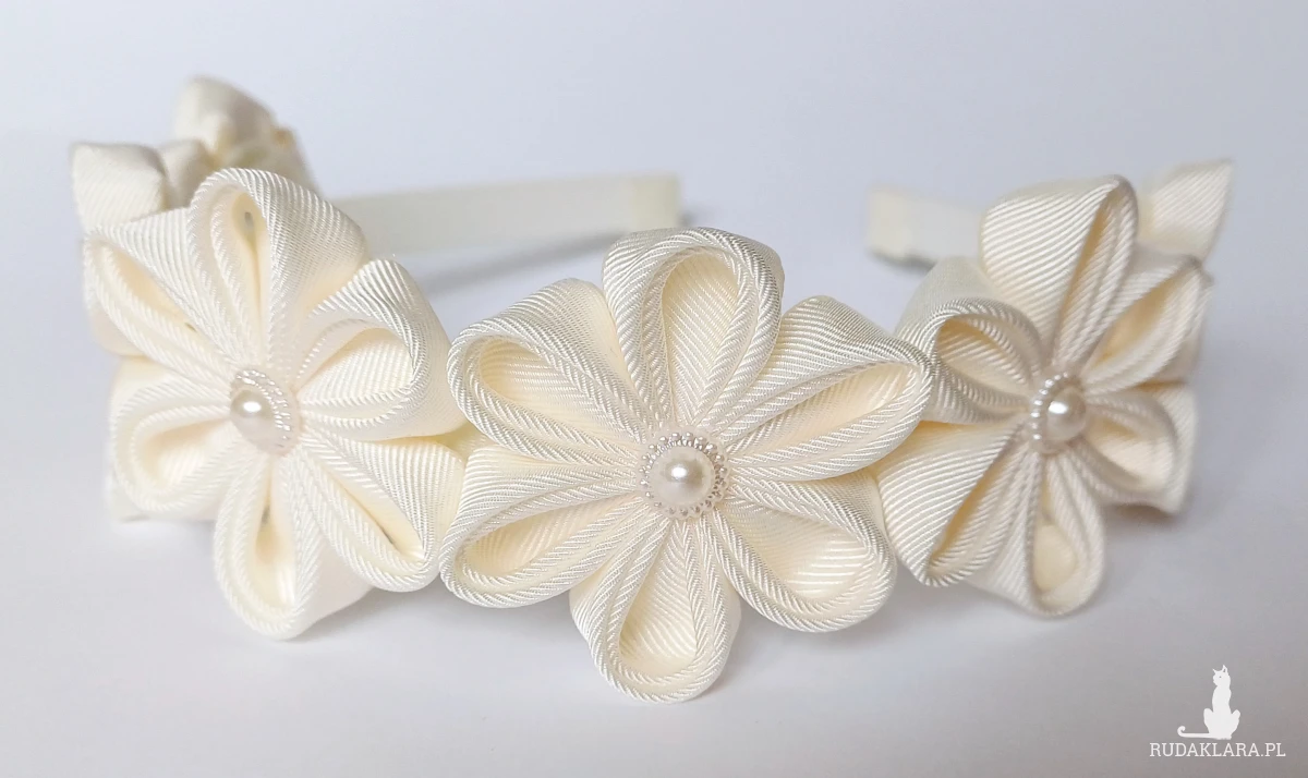 Urocza opaska na włosy dla małych księżniczek, ale również dla dorosłych, którzy chcą się poczuć wyjątkowo. Kwiaty na opasce wykonuję z tasiemek tradycyjną japońską techniką tsumami i były częścią ozdobnych szpilek - kanzashi. Dzisiaj ta technika służy mi do tworzenia współczesnych ozdób na włosy twojego dziecka. Opaska do włosów jest ozdobiona wykonanymi ręcznie kwiatami ze wstążki. Baza opaski jest plastikowa z ząbkami - rozmiar uniwersalny rozciąga się na 12-17 cm. Pojedynczy kwiat ma 5cm średnicy i jest wykonany z wysokiej jakości wstążki produkcji hiszpańskiej. Wstążka rypsowa, 100% poliestru. W tym wariancie w kolorze kremowym. Środek to białe półperełki z plastiku. Od strony głowy każdy kwiat jest podklejony filcem, tak aby zapewnić komfort w trakcie noszenia - dzięki temu też ząbki nie drażnią wrażliwej skóry dzieci.
