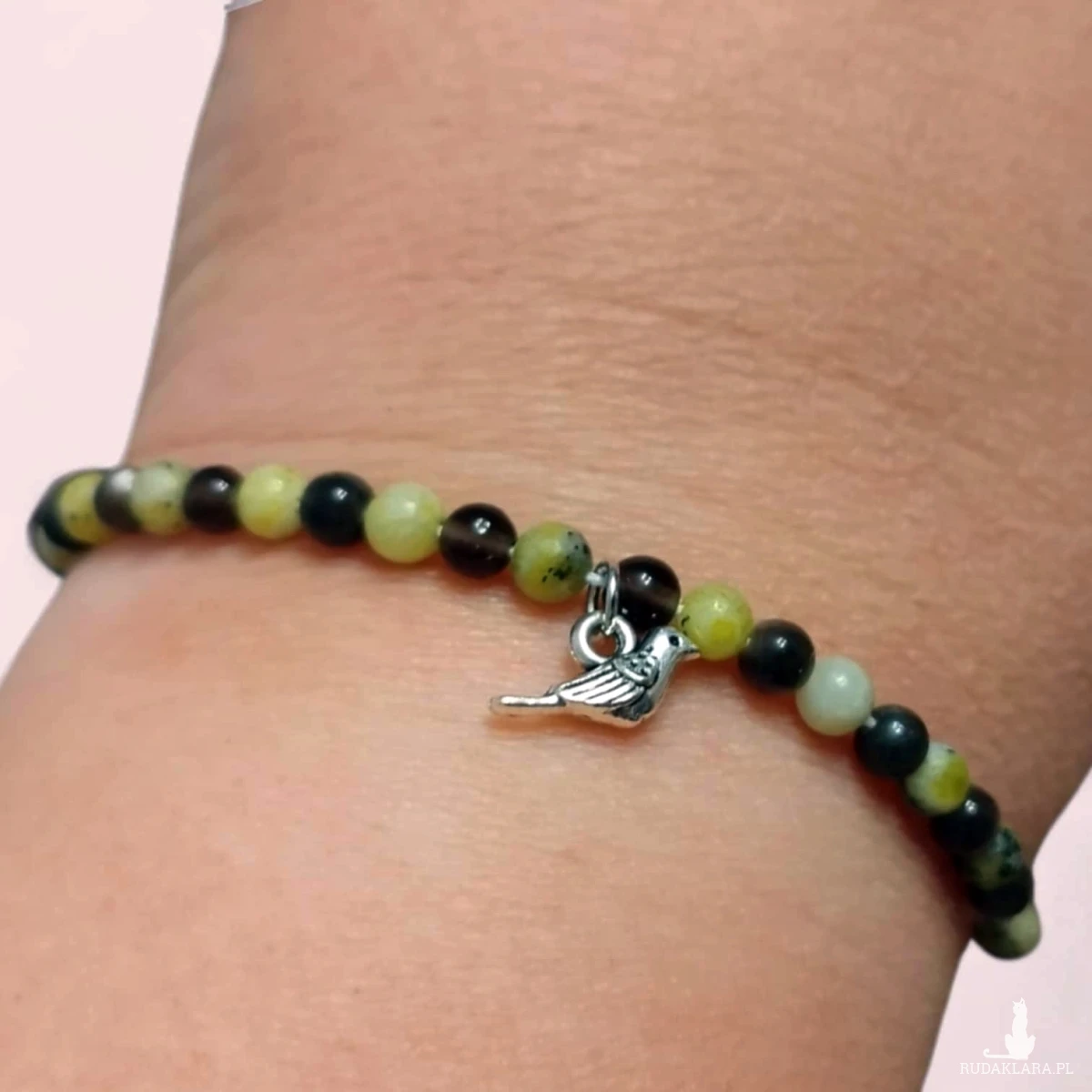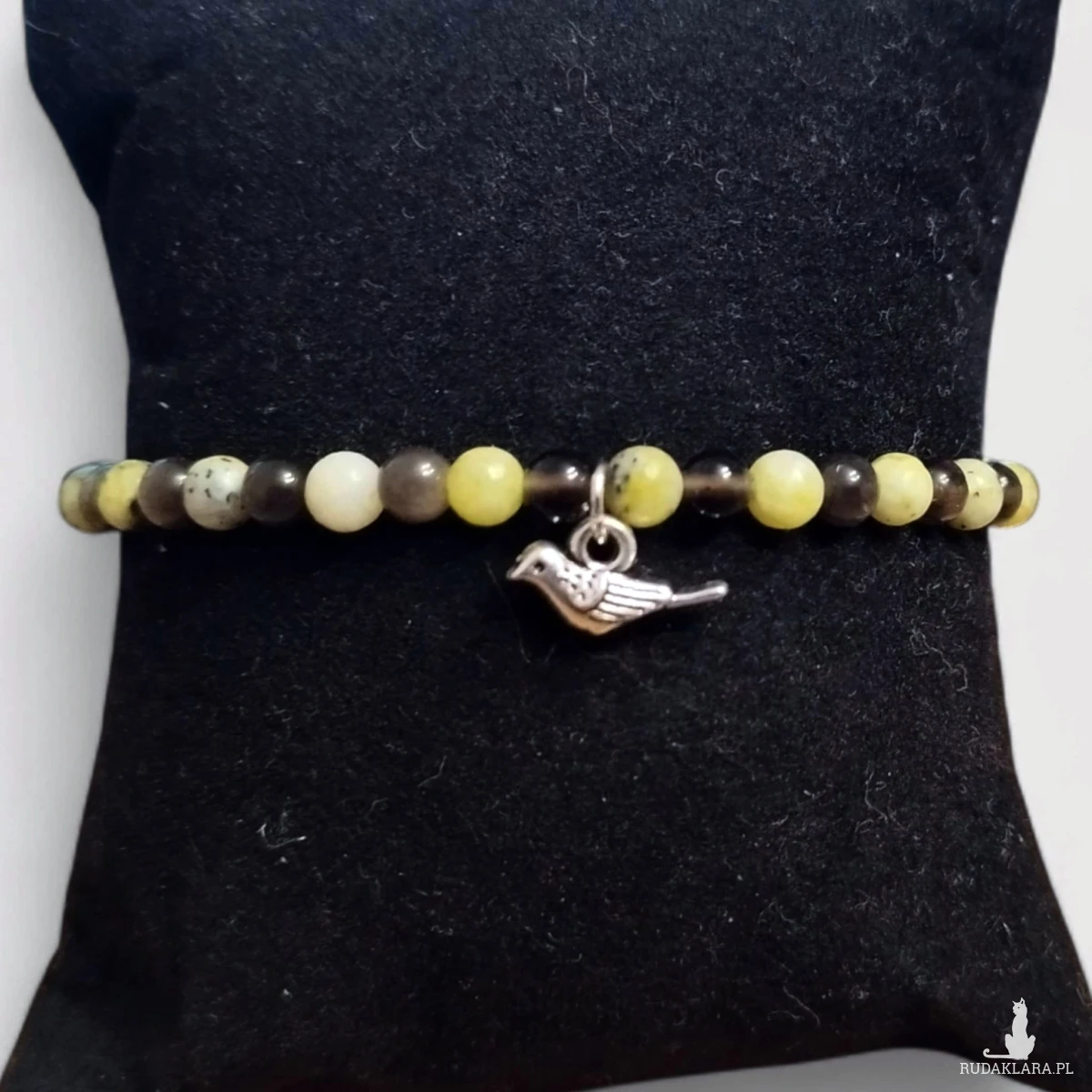 Bransoletka z naturalnych kamieni obsydianu i żółtego jaspisu to elegancka i wyjątkowa biżuteria. Ciekawe kolory kamieni oraz zawieszka z ptakiem dodają jej uroku i tworzą z niej ciekawą i oryginalną ozdobę.