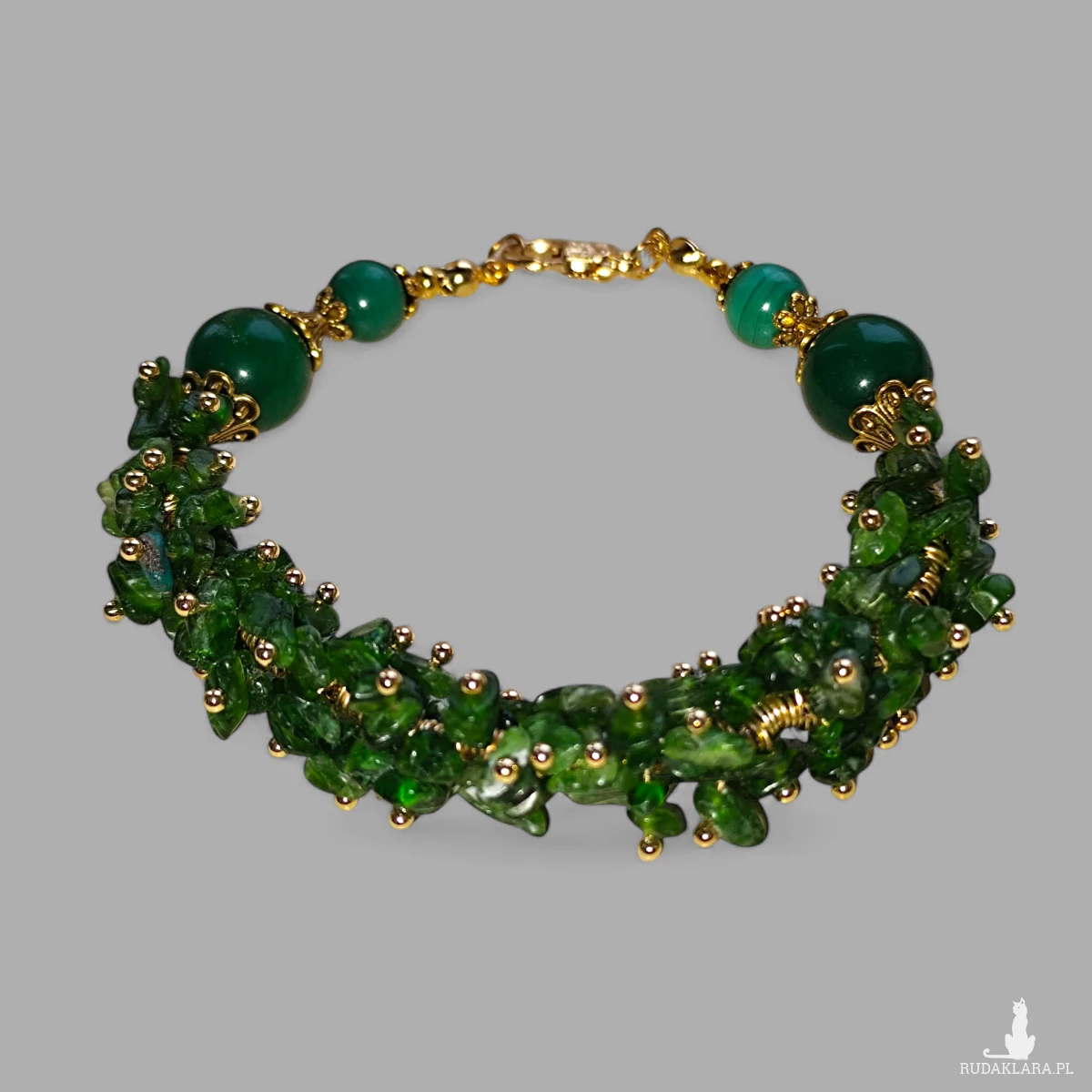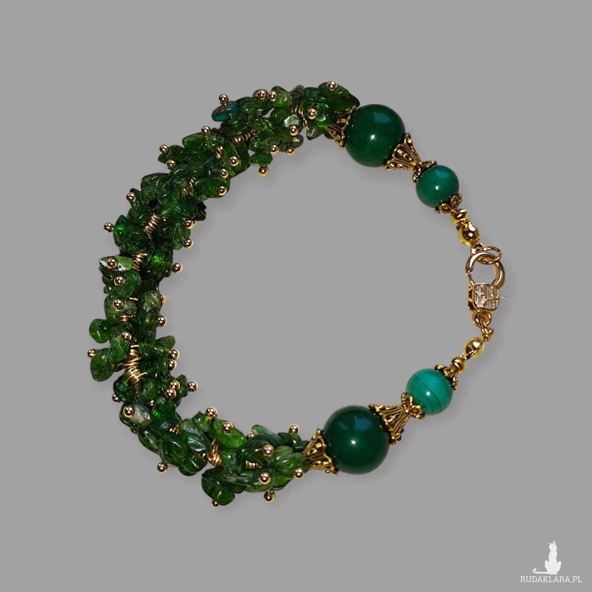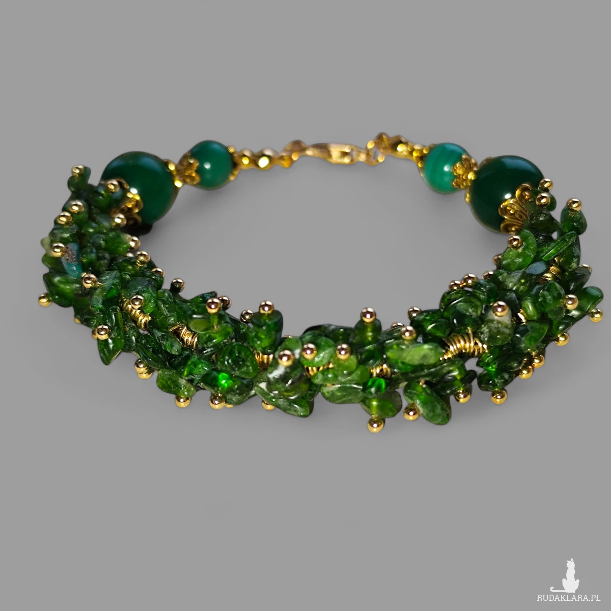 Wyjątkowa, ręcznie wykonana bransoletka, która łączy w sobie intensywną zieleń cennych kamieni naturalnych z eleganckimi, złotymi akcentami.