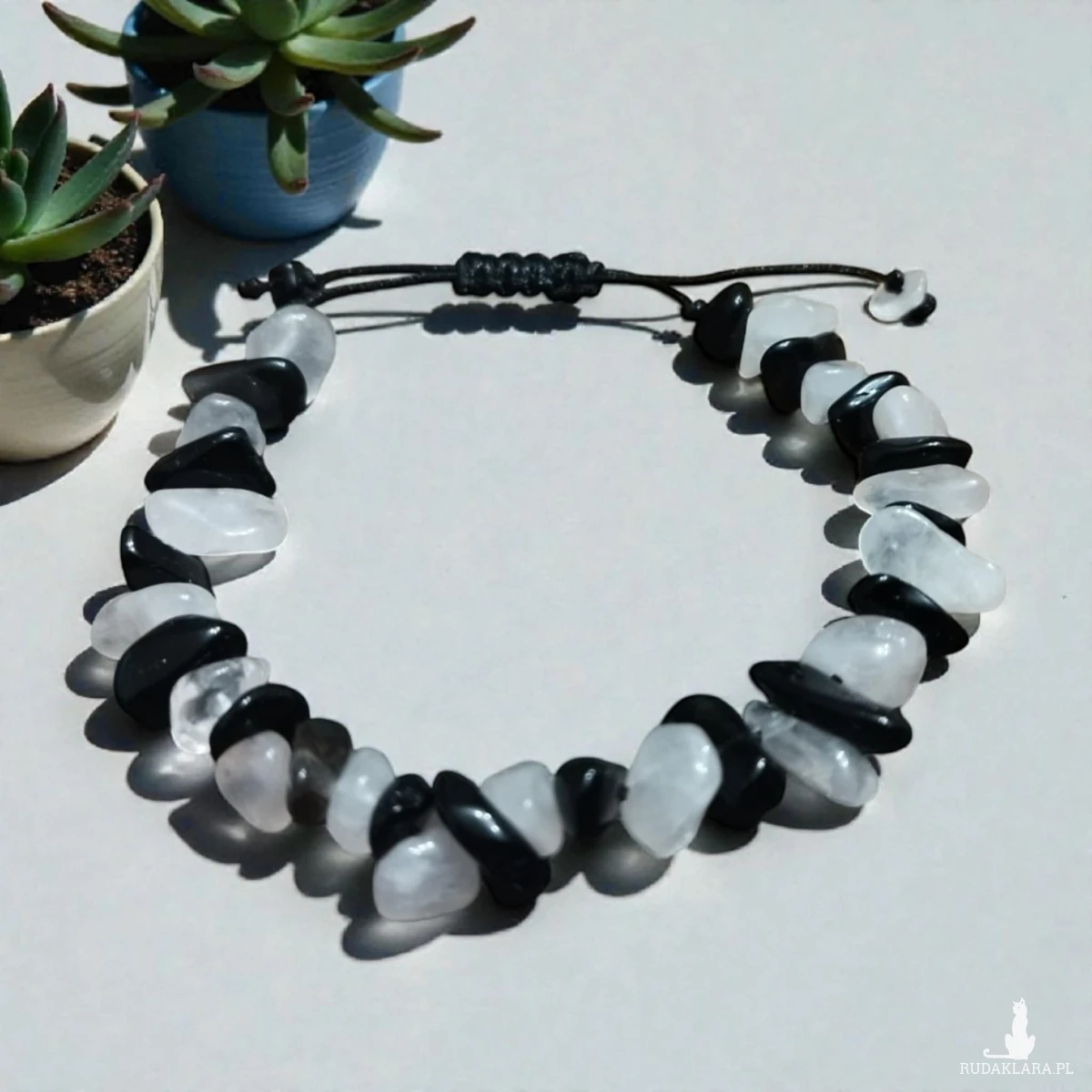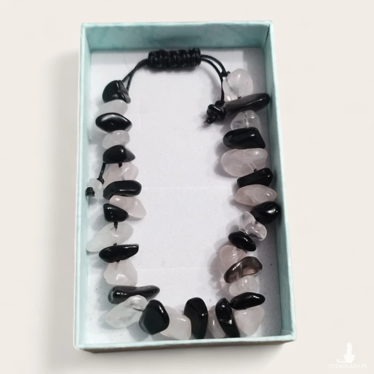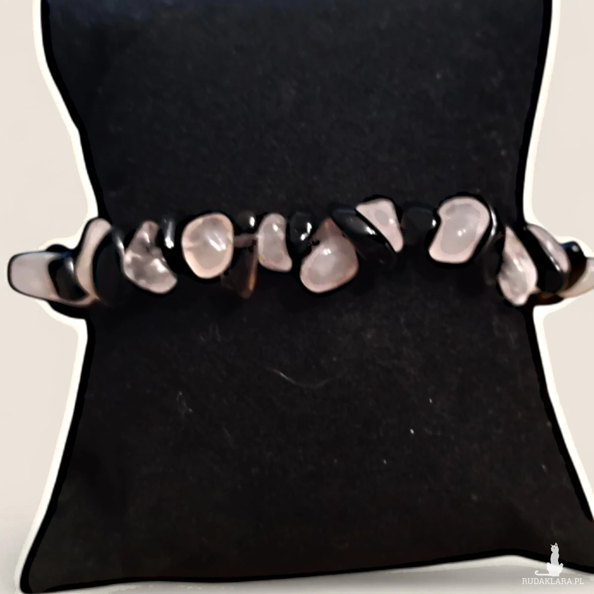 Bransoletka z naturalnych kamieni onyxu i różowego kwarcu to elegancka i wyjątkowa biżuteria. Nieregularny kształt kamieni oraz połączenie koloru czarnego z delikatnym różem dodają jej uroku i tworzą z niej ciekawą i oryginalną ozdobę.