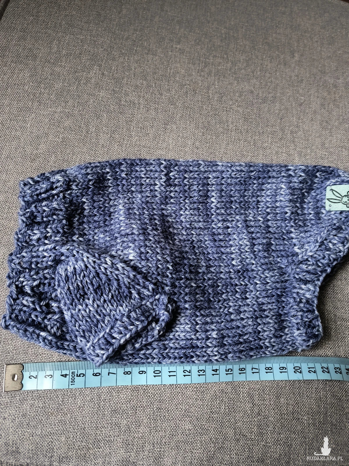 Sweterek dla psa, kota wełna 75% i akryl 25%. Bardzo ciepły włóczka skarpetkowa. Długość całkowita 27 cm, długość pod brzuchem 21 cm, obwód 30 cm. Mierzony na płasko bez rozciągania.