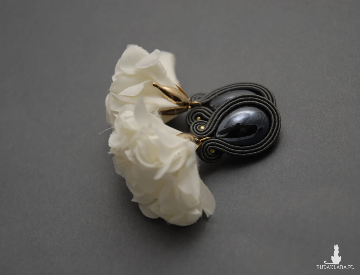 oferuję kolczyki lub klipsy zrobione techniką sutasz, ozdobione fasetowanymi szklanymi kaboszonami i kwiatkami z materiału