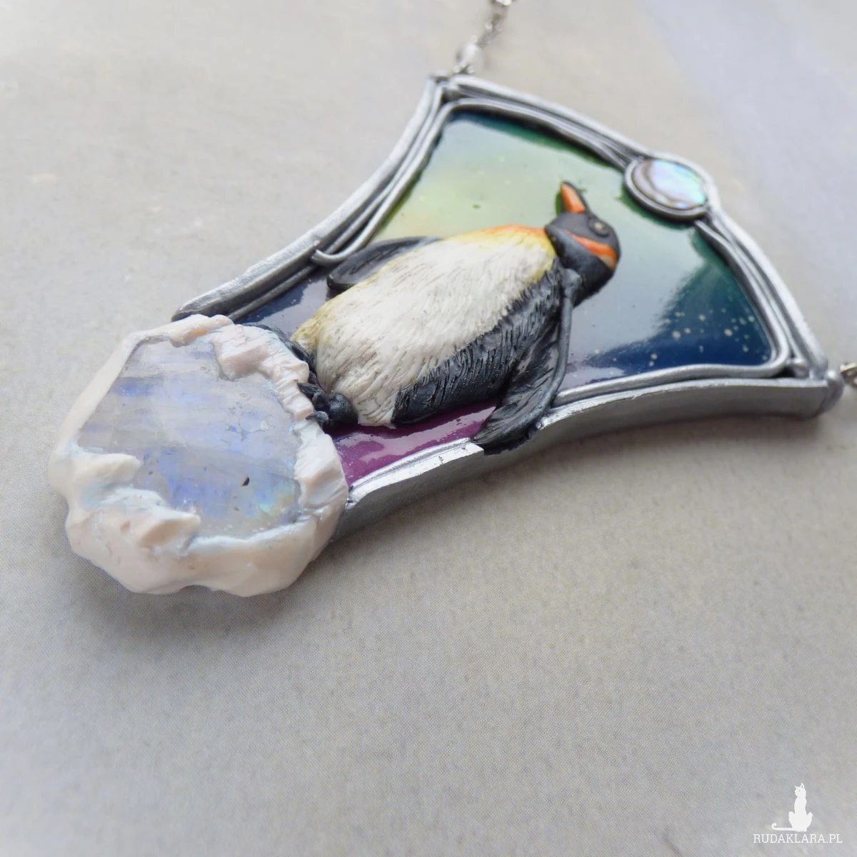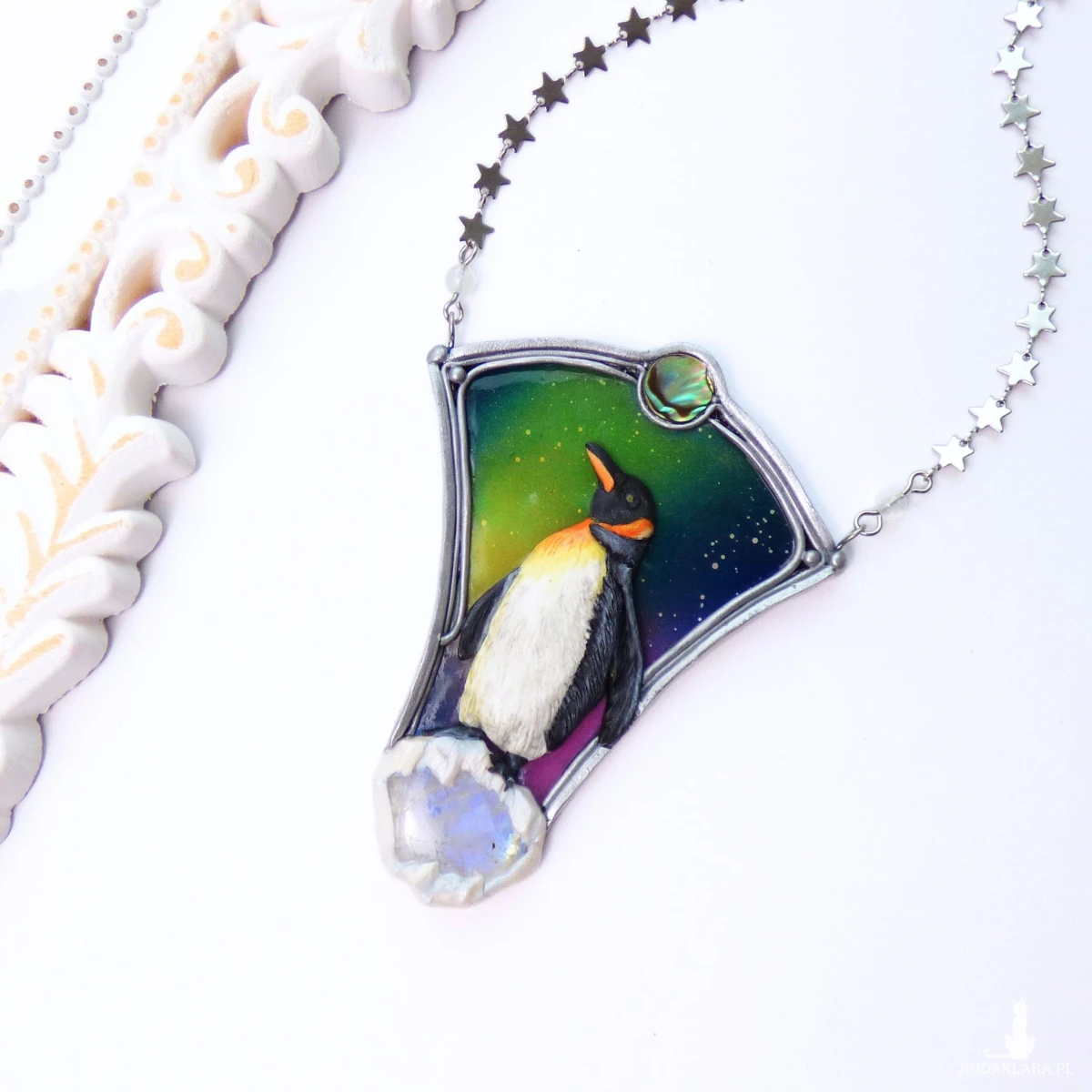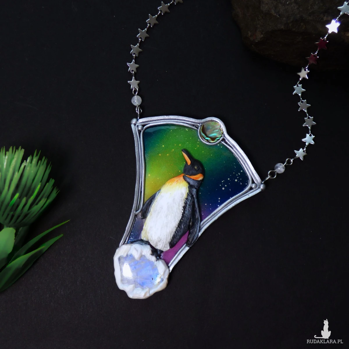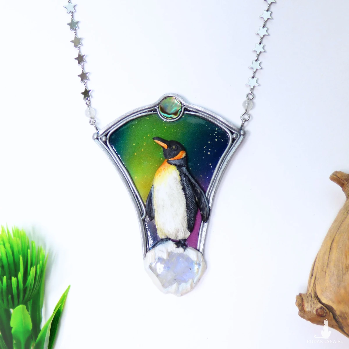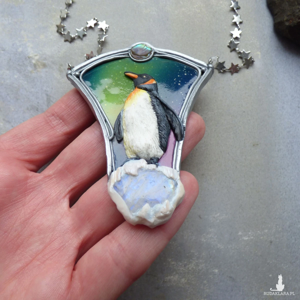 Artystyczny naszyjnik „Pingwin pod zorzą” to ręcznie wykonana miniatura w formie mikrorzeźby. Centralnym motywem jest realistyczny pingwin, modelowany z dbałością o najmniejszy detal, umieszczony na tle wielobarwnej zorzy polarnej. Kamień księżycowy osadzony w dolnej części naszyjnika subtelnie odbija światło, mieniąc się na niebiesko, przywołuje skojarzenia z lodem. Nad zorzą umieściłam mieniącą się monetę muszli paua w odcieniach zieleni. Całość zawiesiłam na łańcuszku, którego ogniwka to miniaturowe gwiazdy - idealnie komponuje się on z klimatem nocnego nieba. W łańcuszek wplotłam również dwie kulki kamienia księżycowego.