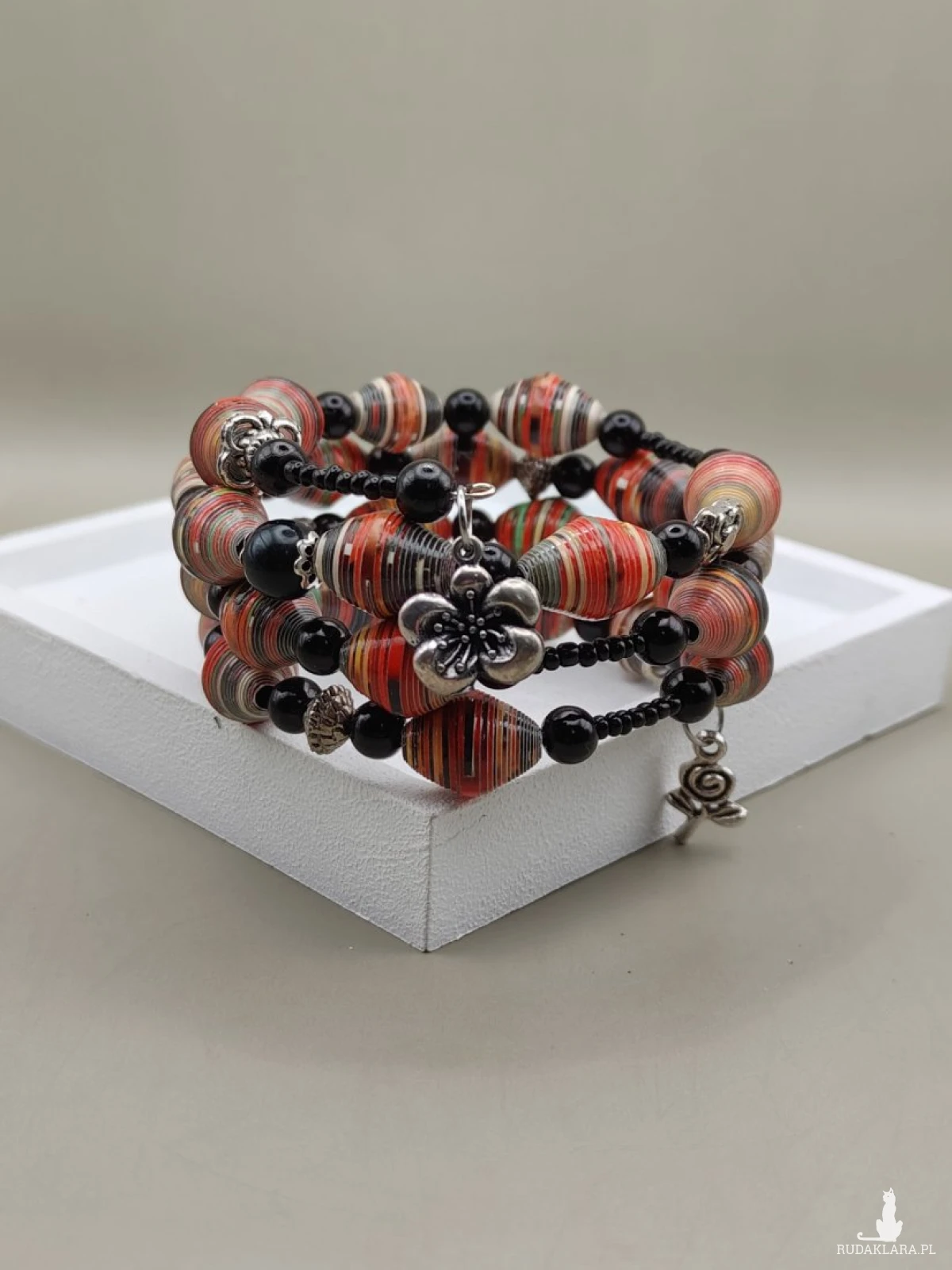 Wyrazista, ręcznie wykonana bransoletka, która przyciąga spojrzenia od pierwszej chwili. Intensywne odcienie czerwieni, czerni i ciepłych beży tworzą dynamiczną, a jednocześnie harmonijną kompozycję. Wielowarstwowa forma pięknie oplata nadgarstek, nadając stylizacji charakteru i artystycznego pazura. Srebrne zawieszki – kwiat i róża – dodają całości subtelnej symboliki natury i kobiecej siły. To biżuteria dla osób, które lubią wyróżniać się detalami i cenią unikatowe dodatki handmade.