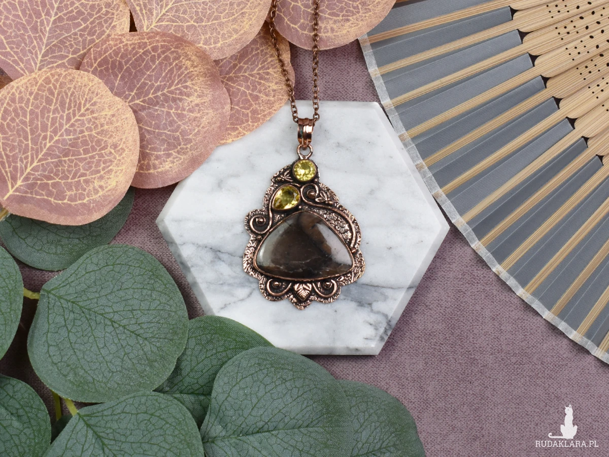 Elegancki wisiorek z miedzi, jaspisem i cytrynem to niezwykła biżuteria, która łączy w sobie estetykę i pozytywną energię. Jaspis, znany ze swoich właściwości stabilizujących, dodaje wisiorkowi ziemiennego piękna, podczas gdy cytryn wzbogaca go o promienne światło i radość. Nosząc ten wyjątkowy wisiorek, nie tylko podkreślisz swoją indywidualność, ale także zyskasz wsparcie kamieni, które tradycyjnie przypisuje się zwiększeniu siły witalnej, spokoju i optymizmu.