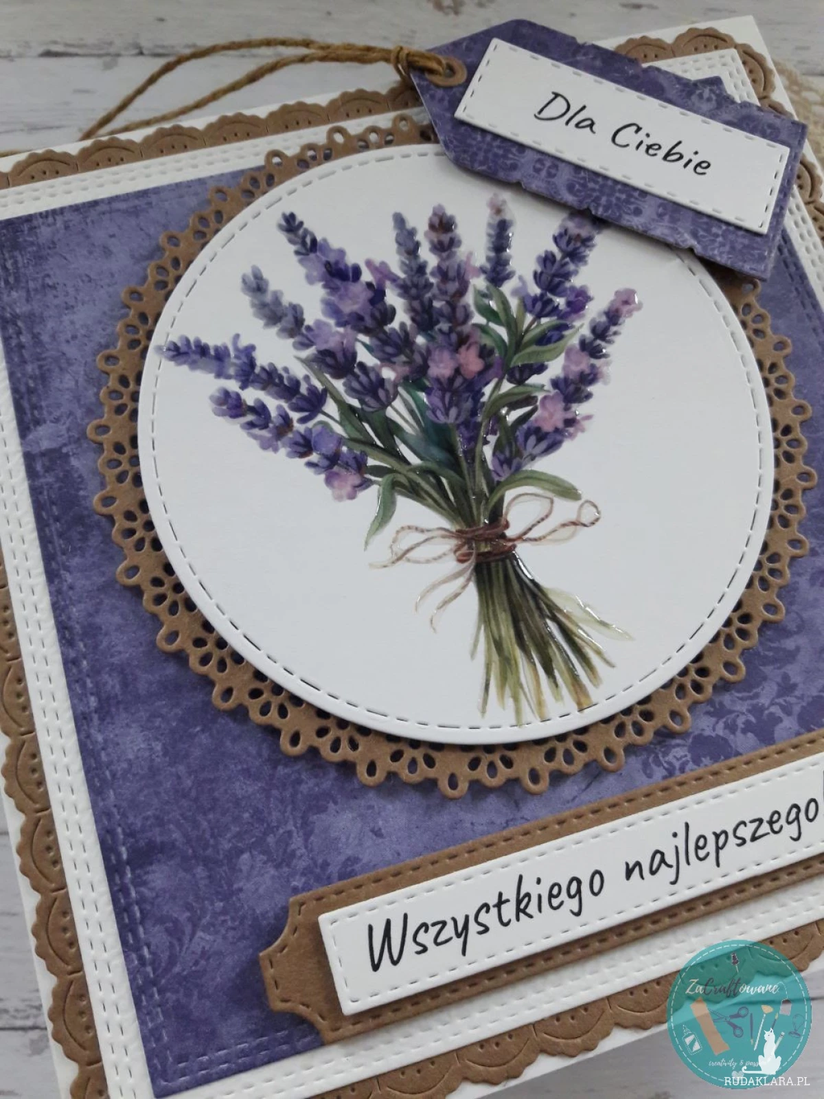 Ręcznie robiona kartka urodzinowa z bukietem lawendy wykonana metodą scrapbookingu z wykorzystaniem profesjonalnych materiałów i z dbałością o każdy szczegół.
