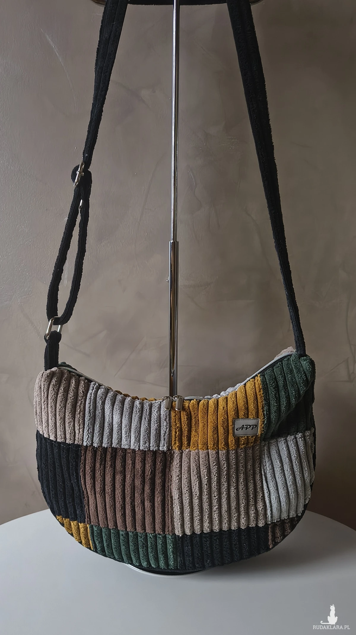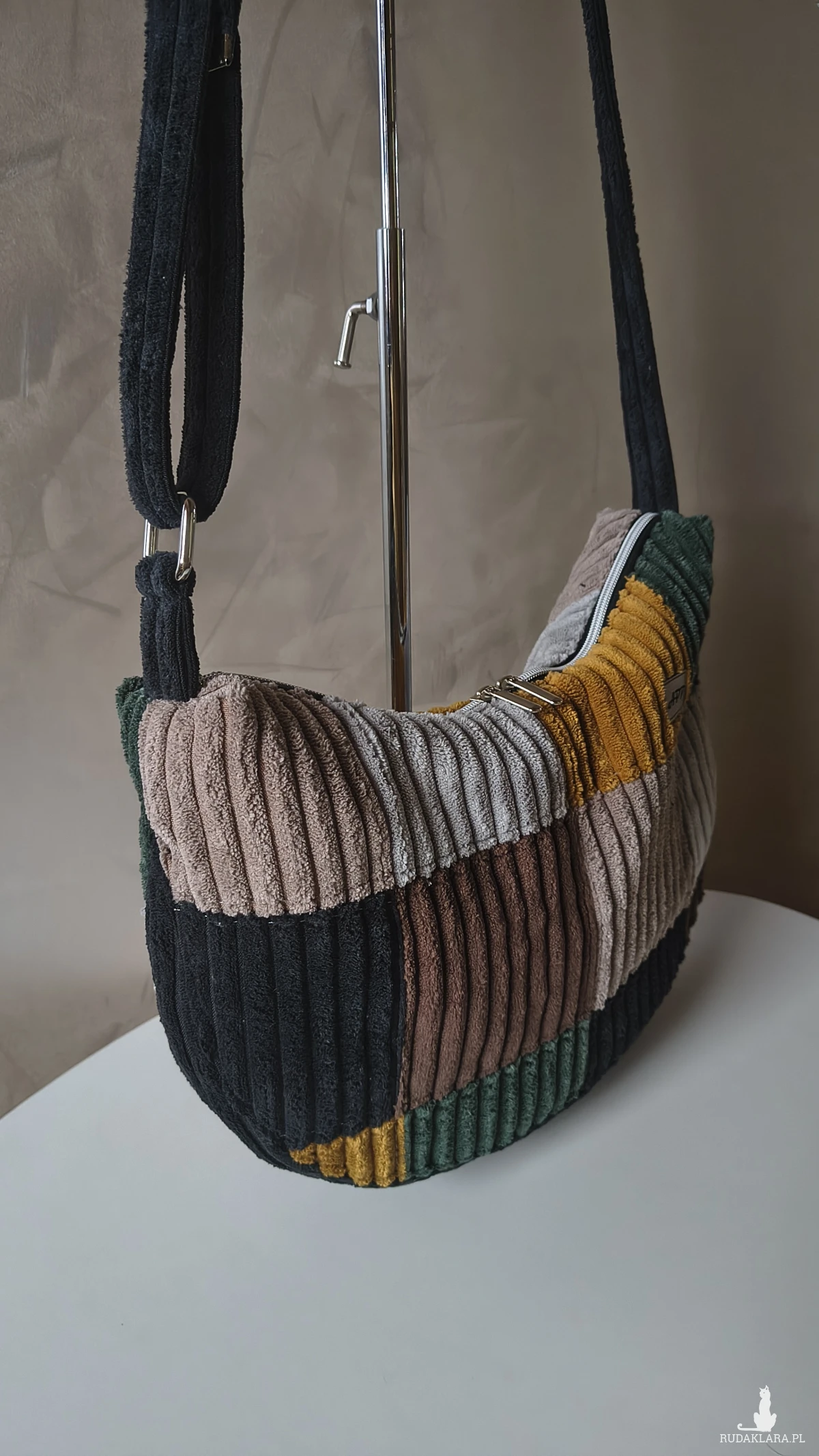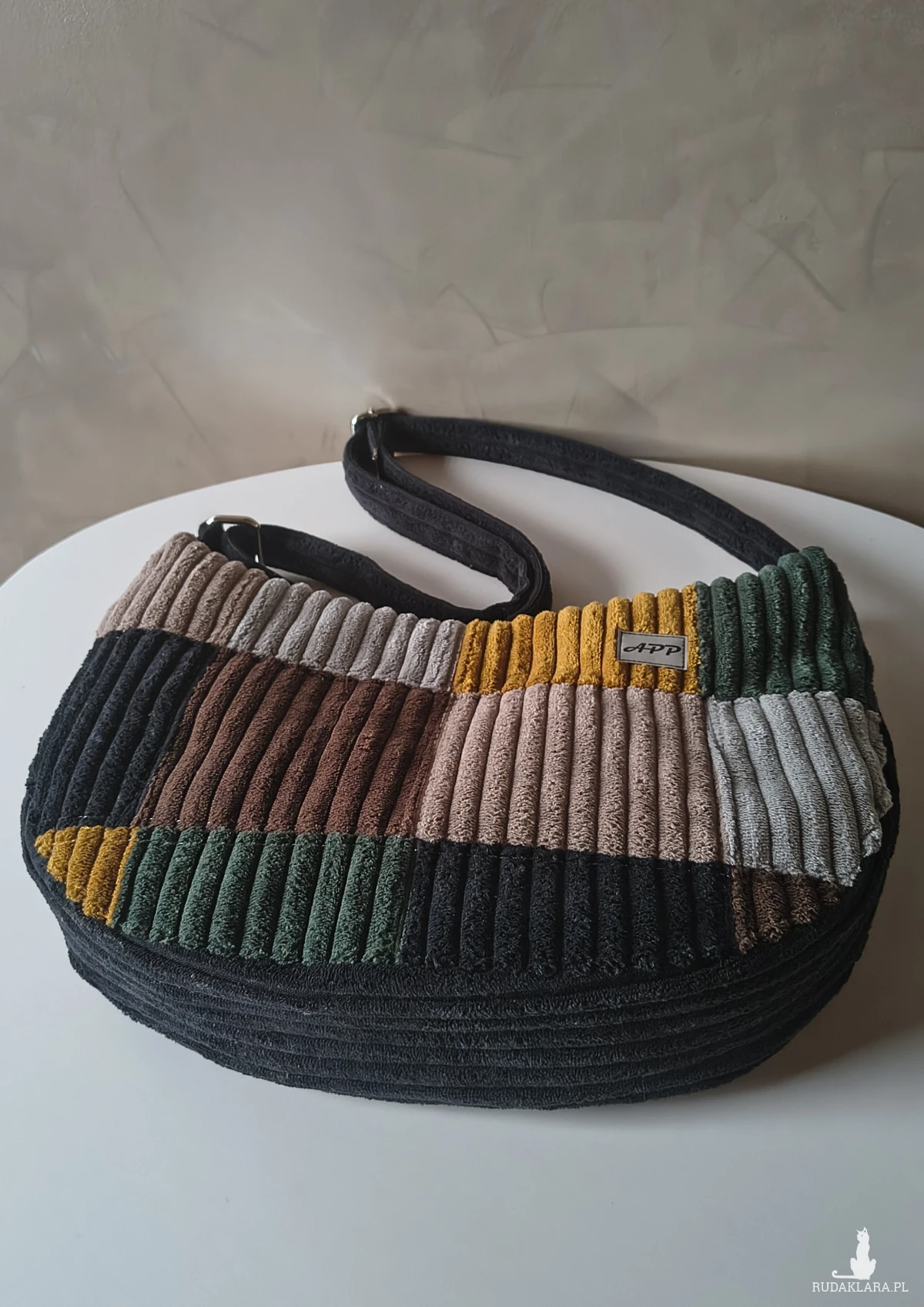 Powstała ze sztruksu tapicerskiego, co gwarantuje jej wytrzymałość i długie użytkowanie. Tył i przód torby to patchwork. Wewnątrz znajduje się wodoodporna podszewka z kieszonką na zamek. Pasek regulowany, wykonany ze sztruksu, a więc delikatny dla naszego ciała. Torbę można nosić na ramieniu lub przez ramię. Okucia srebrne, niklowane.