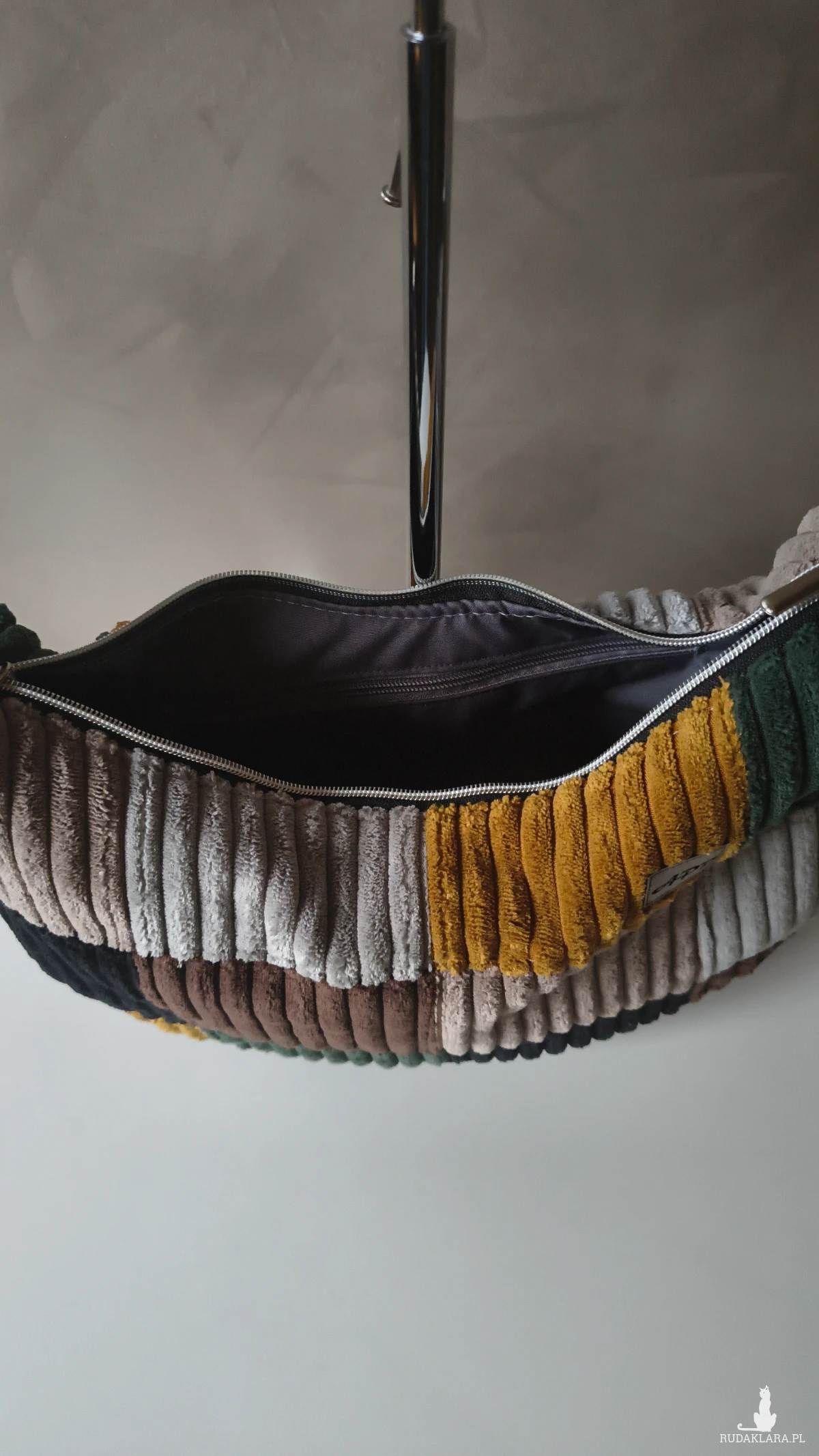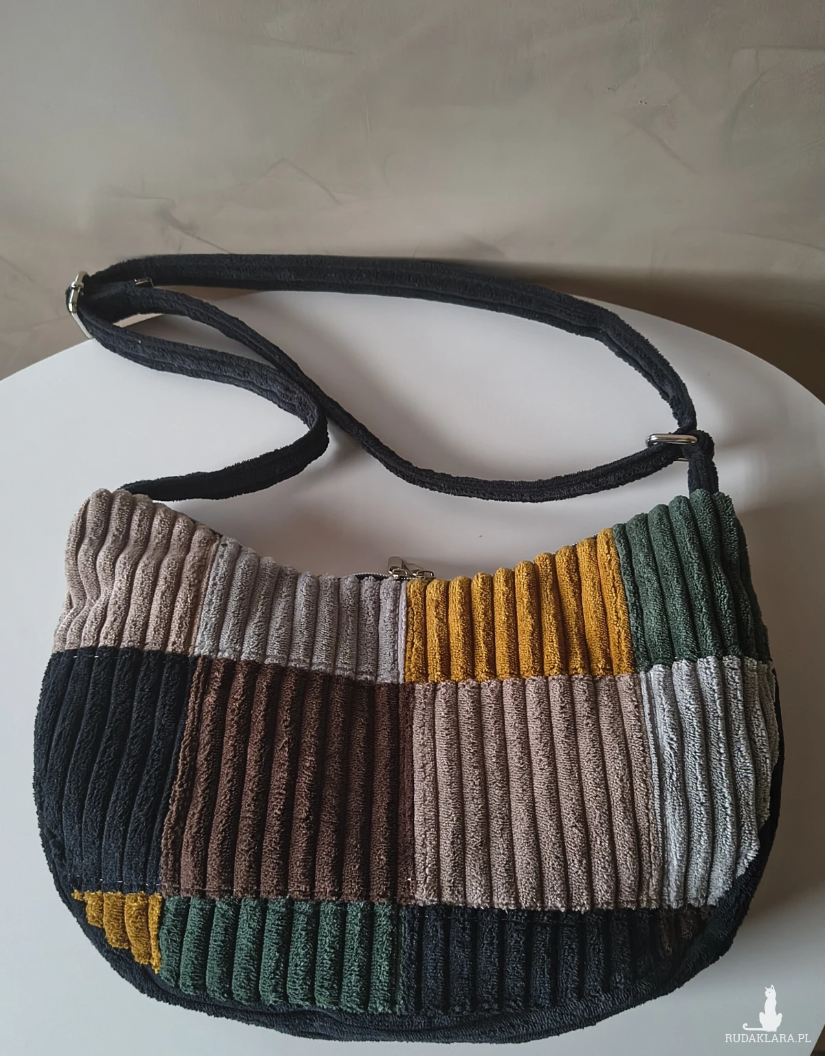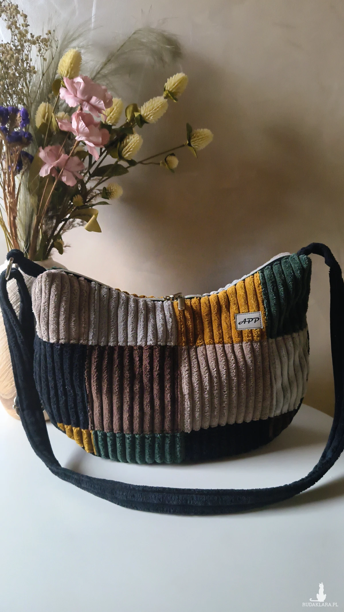 Powstała ze sztruksu tapicerskiego, co gwarantuje jej wytrzymałość i długie użytkowanie. Tył i przód torby to patchwork. Wewnątrz znajduje się wodoodporna podszewka z kieszonką na zamek. Pasek regulowany, wykonany ze sztruksu, a więc delikatny dla naszego ciała. Torbę można nosić na ramieniu lub przez ramię. Okucia srebrne, niklowane.