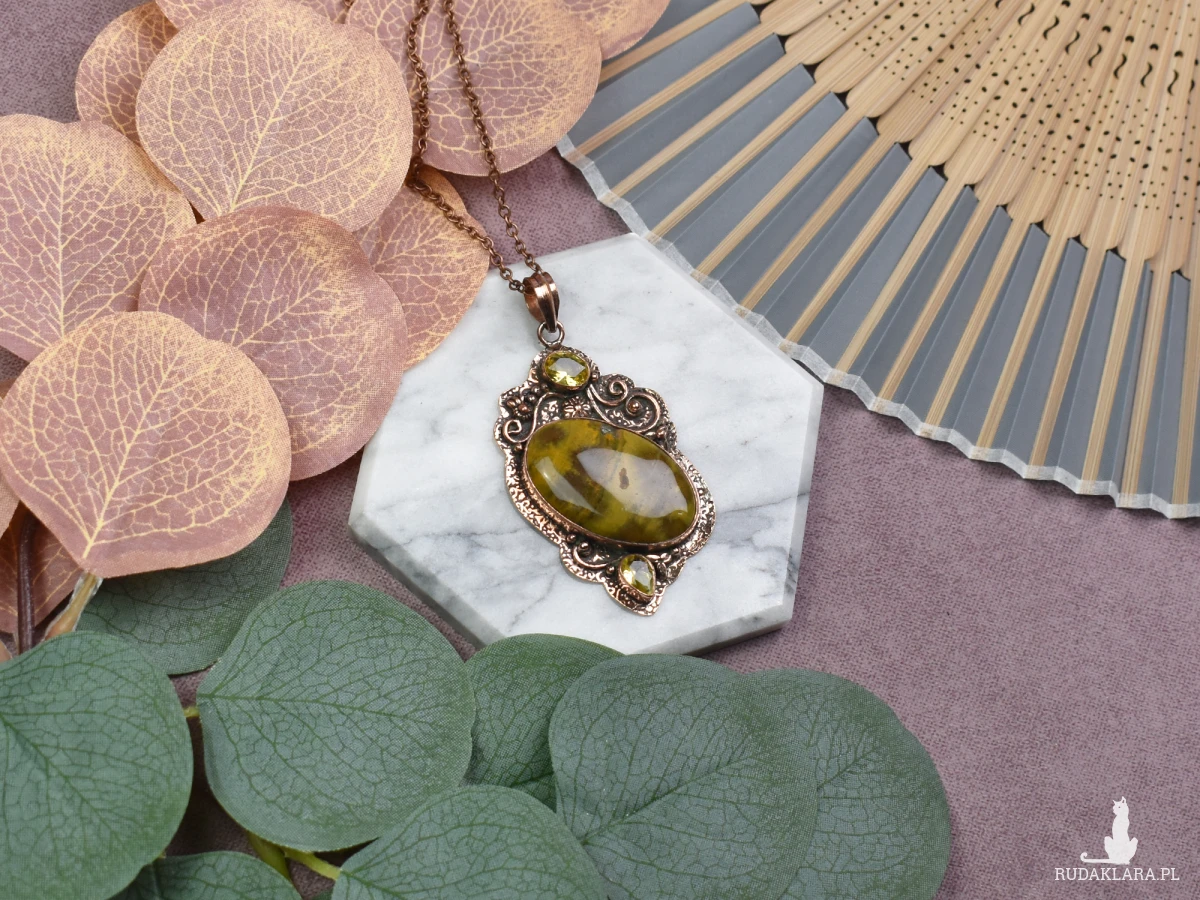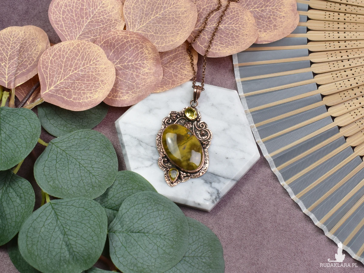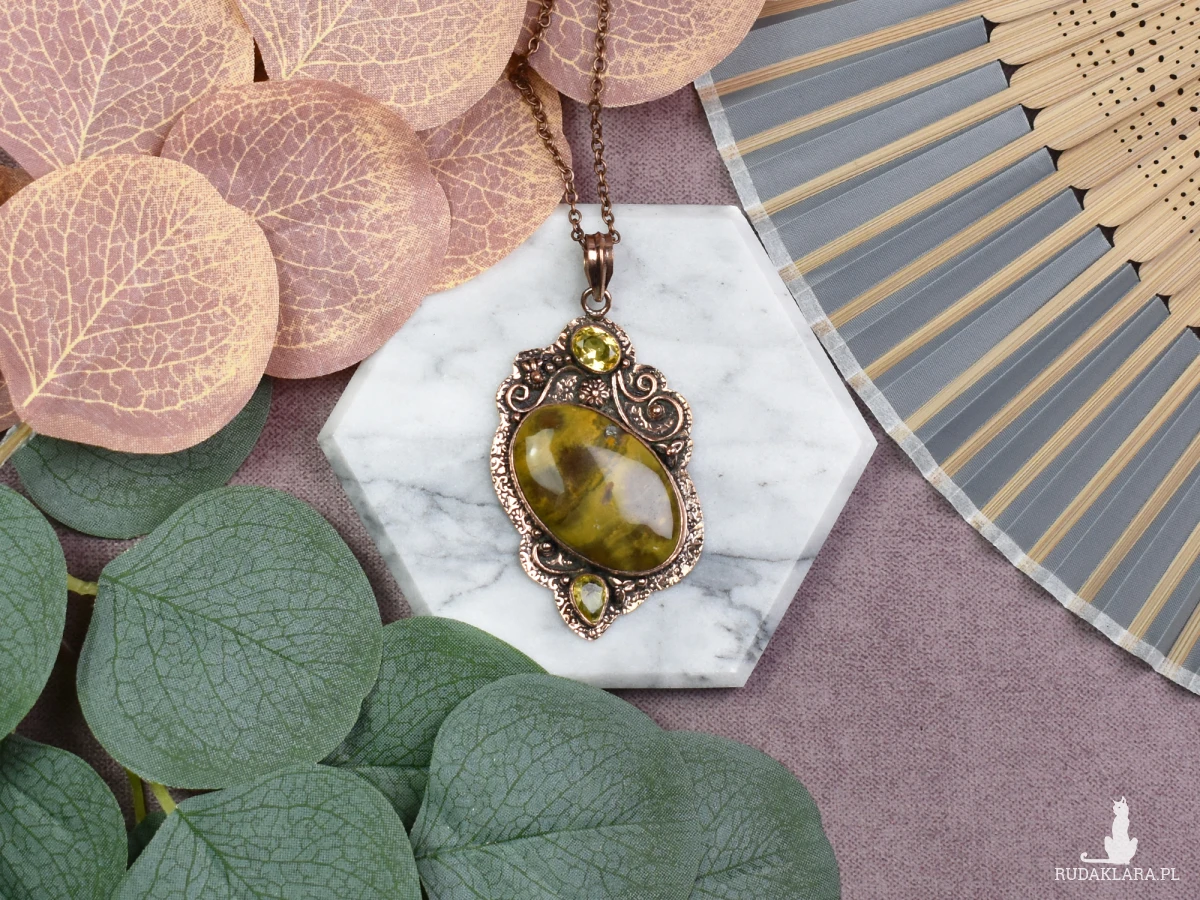 Elegancki wisiorek z miedzi ozdobiony jaspisem i cytrynem to unikalna biżuteria, która przyciąga uwagę swoim urokiem. Kamień jaspis dodaje wisiorkowi ziemiennego piękna i podkreśla stabilność, natomiast cytryn wzbogaca go o energię, optymizm i pozytywne wibracje. Ta wyjątkowa kombinacja nie tylko ozdabia, ale także niesie ze sobą pozytywne właściwości, czyniąc ten wisiorek nie tylko stylowym dodatkiem, ale również kamieniem talizmanicznym na co dzień.