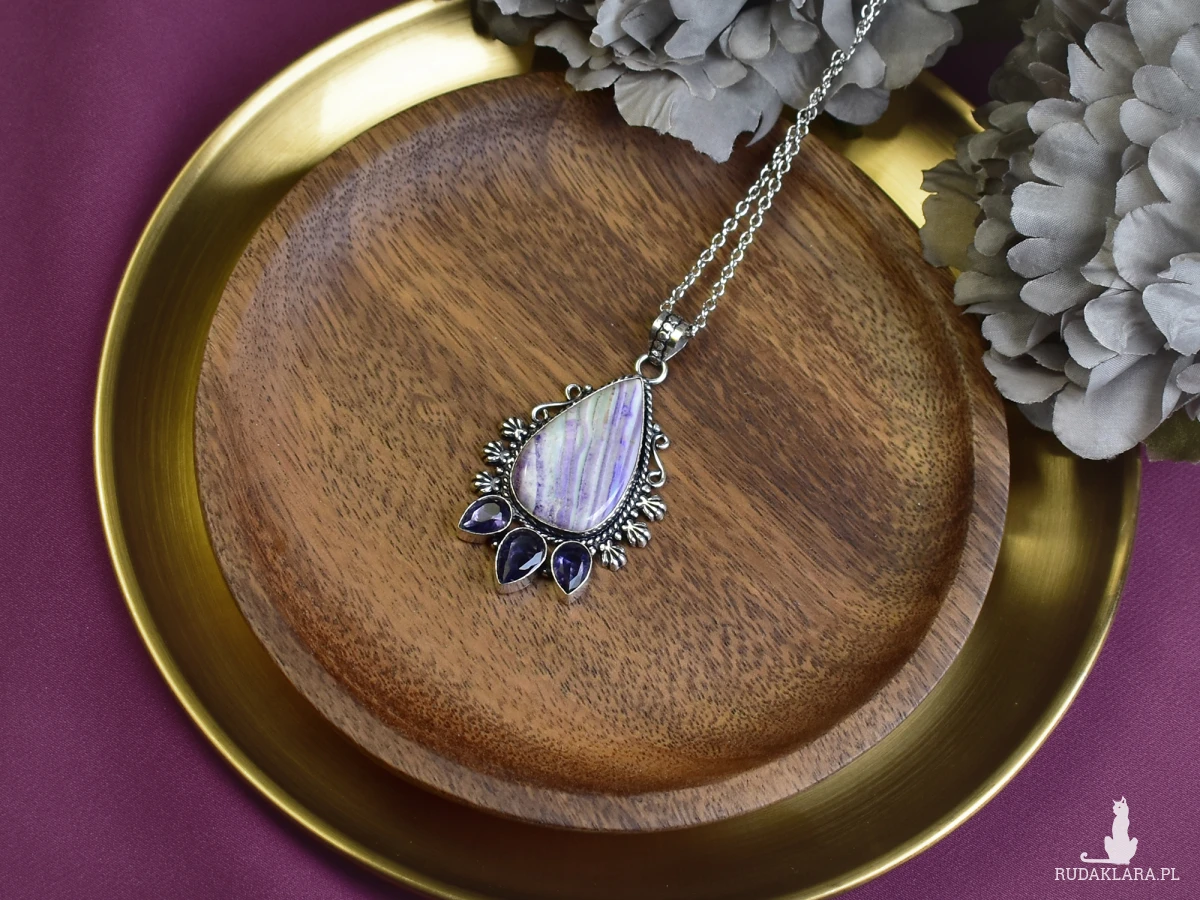 Ręcznie wykonany wisiorek z miedzi, pokryty srebrem. Zawiera jaspis w fioletowym odcieniu oraz ametysty. Jaspis jest ceniony za swoje właściwości ochronne i uspokajające. Ametyst, znany jako kamień harmonii, wspiera wewnętrzny spokój i równowagę. Idealny dodatek dla miłośników unikalnej biżuterii.