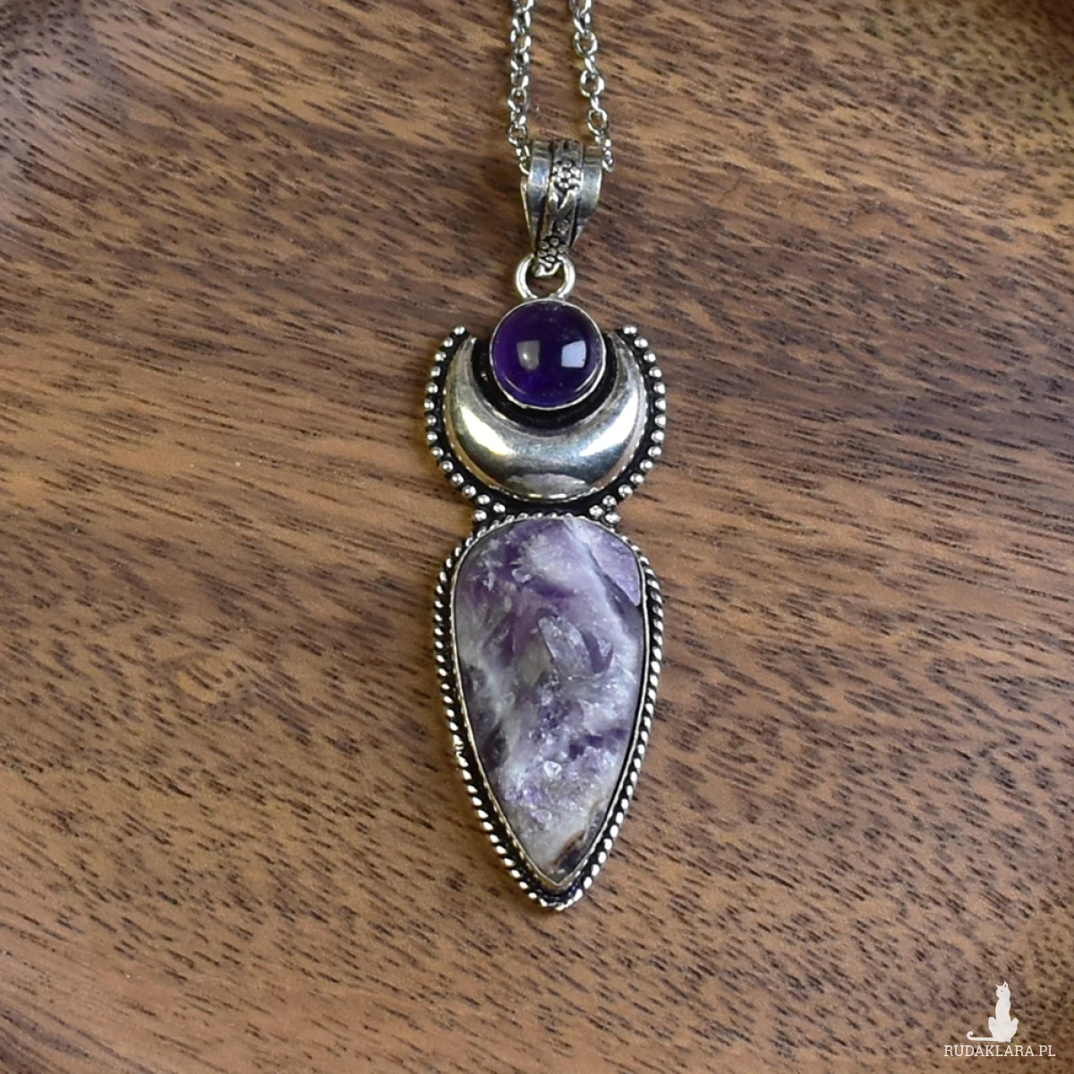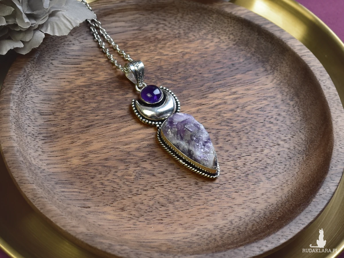 Ręcznie wykonany wisiorek z miedzi, pokryty srebrem. Głównym elementem jest surowy ametyst, uzupełniony mniejszym ametystem. Ametyst to kamień ceniony za swoje właściwości ochronne i wspomagające koncentrację. Wisiorek łączy naturalne piękno kamieni z solidnym wykonaniem. Idealny dodatek do każdej stylizacji.