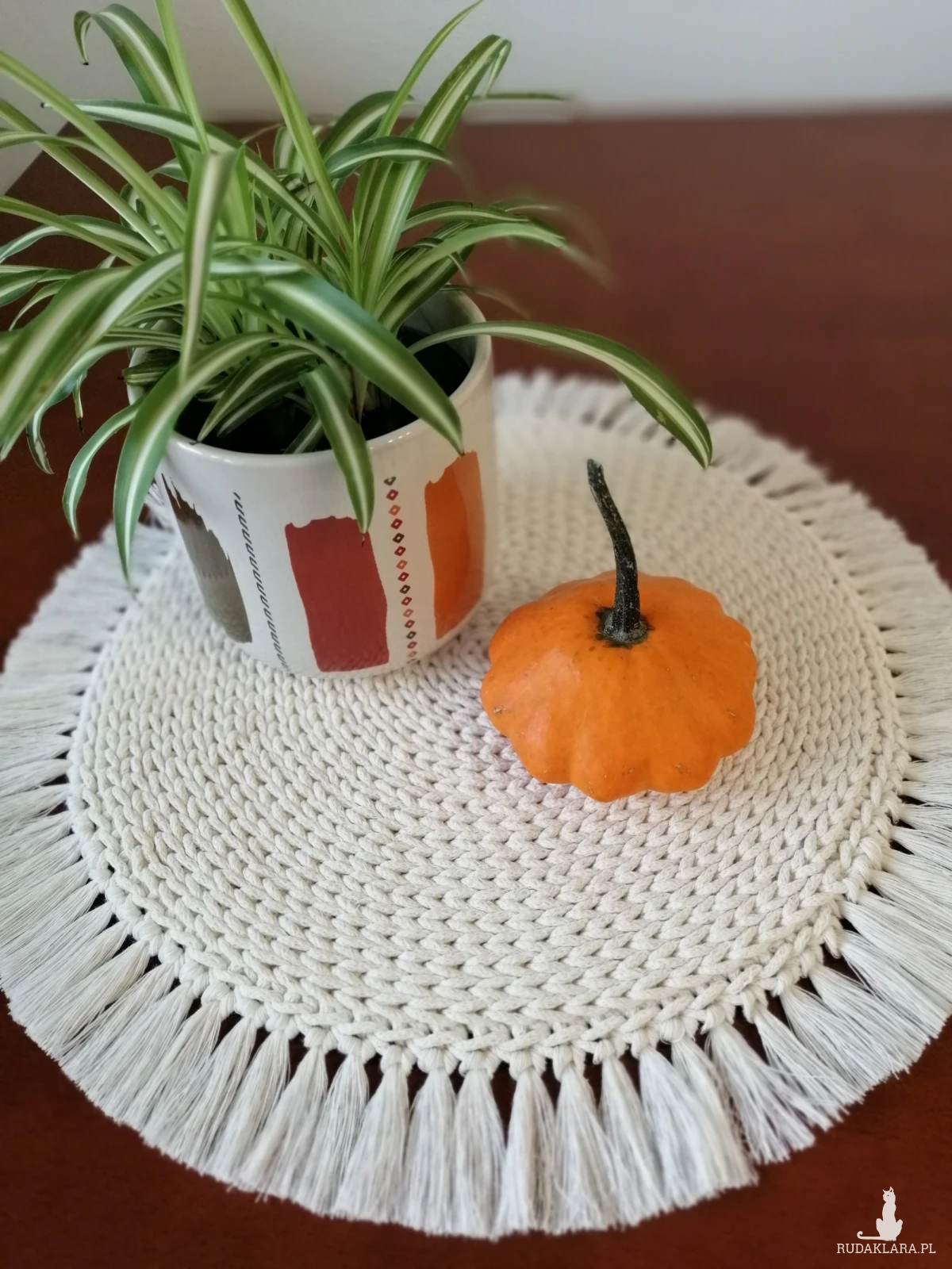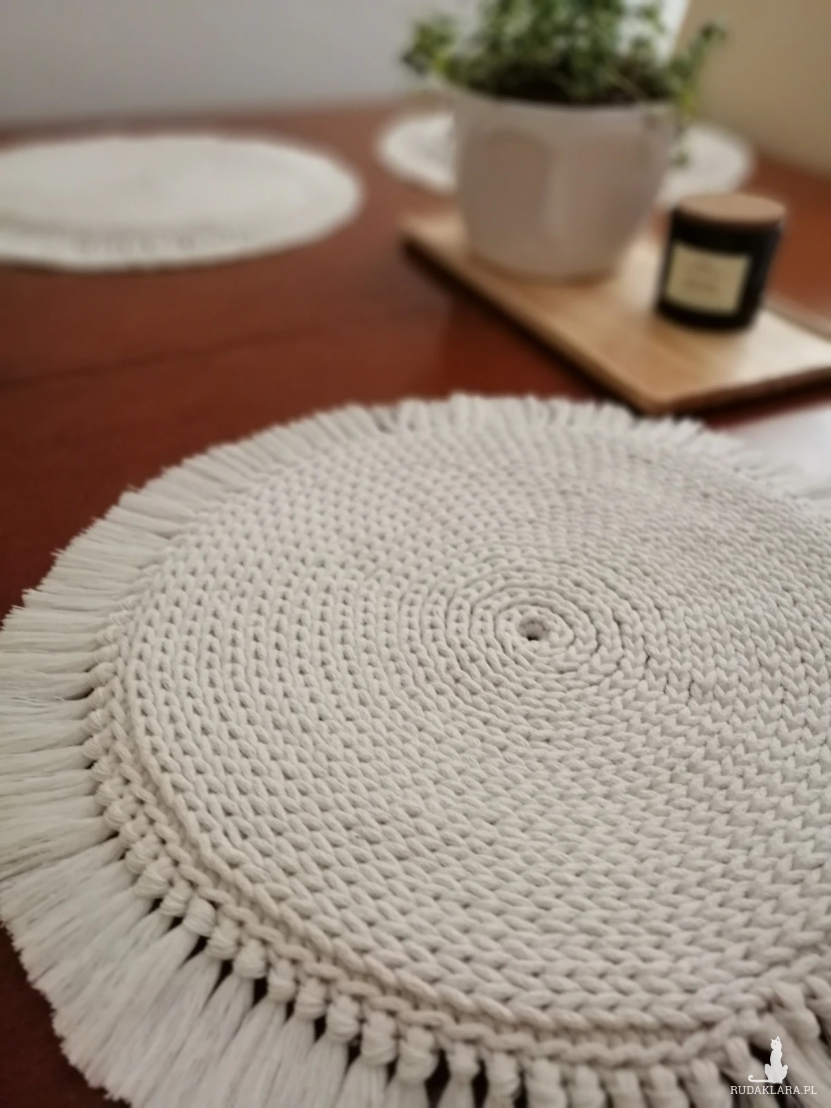 Dekoracyjne podkładki BOHO na stół,pod talerz , wykonane ze bawełnianego sznurka o grubości 3mm z frędzlami o długości około 2-4cm