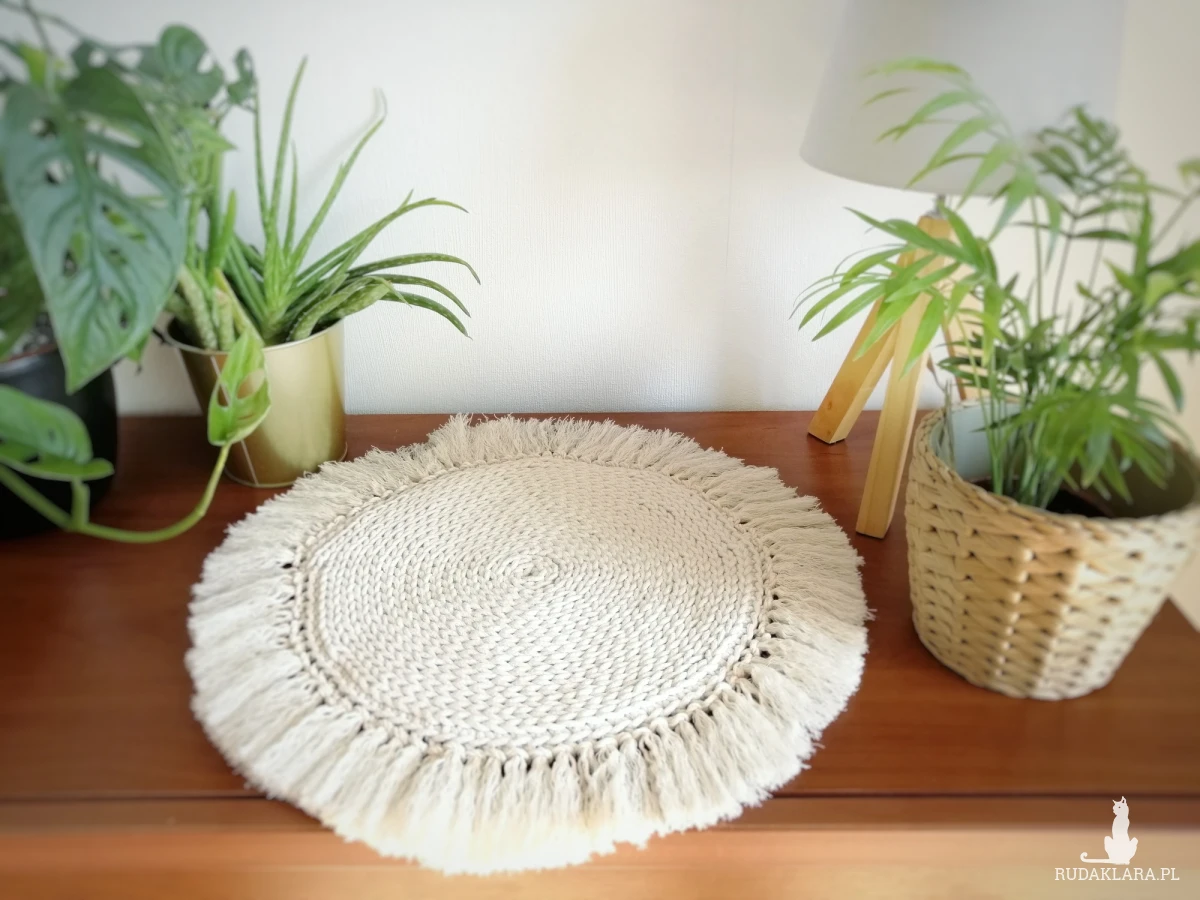 Dekoracyjne podkładki BOHO na stół,pod talerz , wykonane ze bawełnianego sznurka o grubości 3mm z frędzlami o długości około 2-4cm