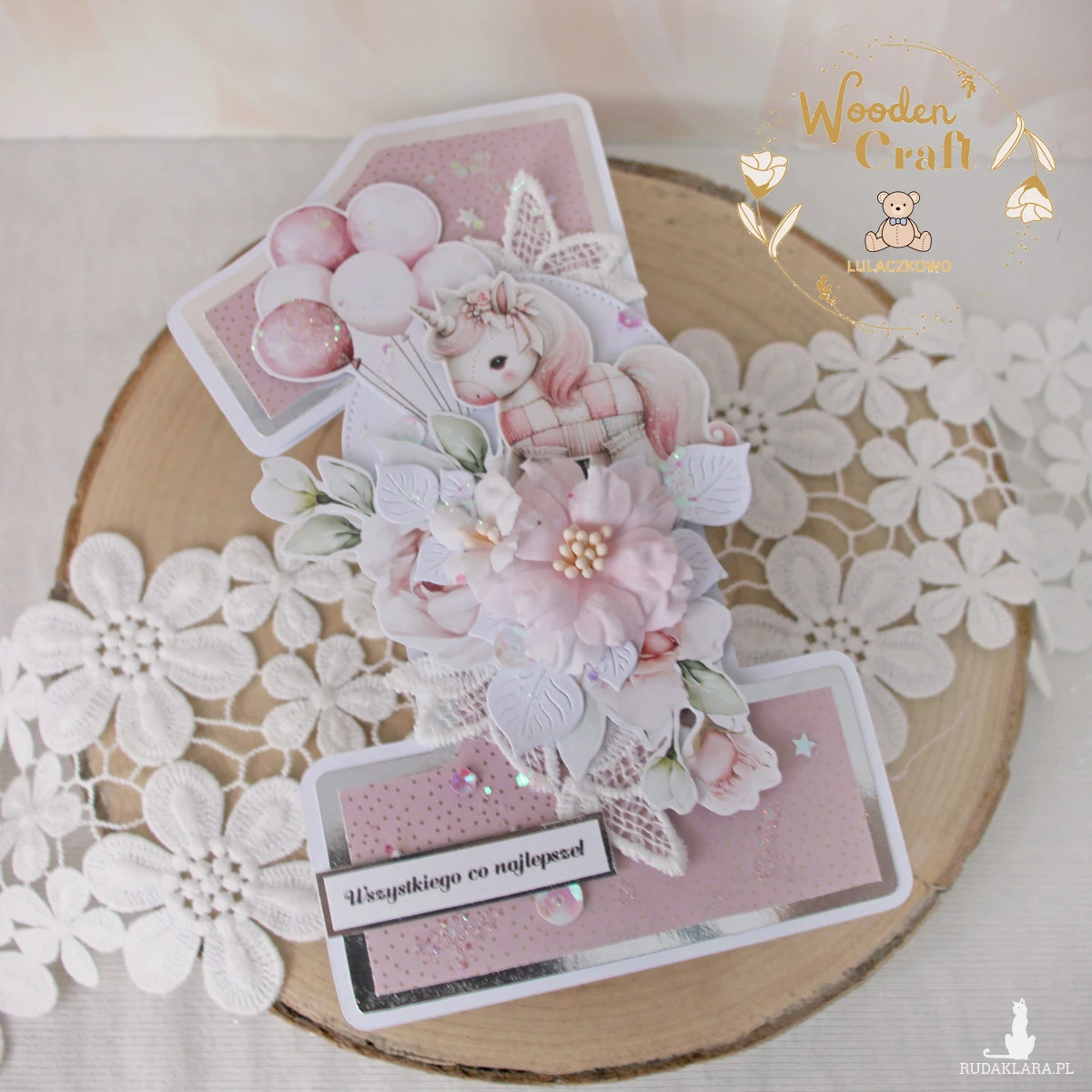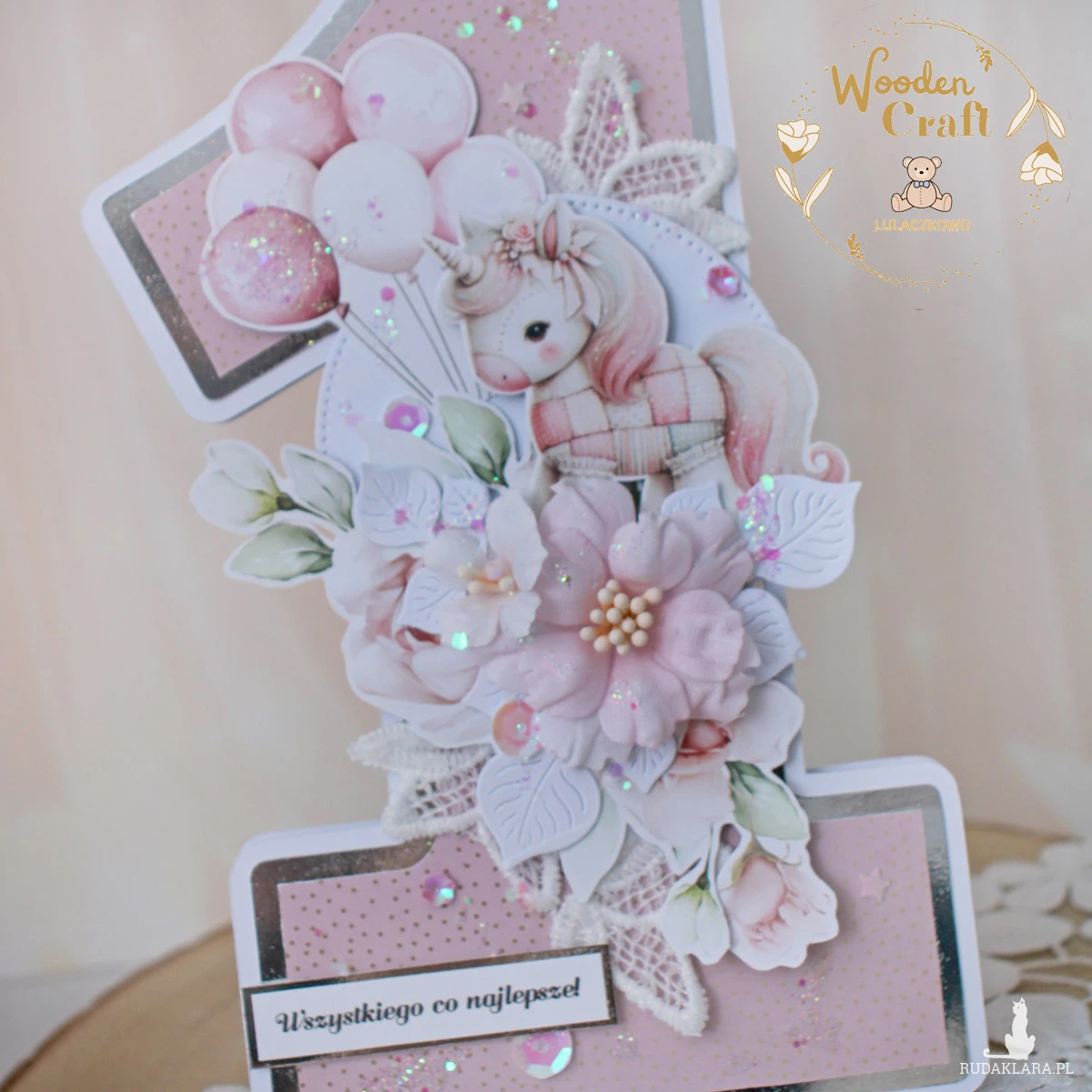 Urocza i nietuzinkowa, dziecięca kartka na roczek, w kształcie cyferki jedynki, wykonana z mixu kolekcji papierów dziecięcych, utrzymana w odcieniach brudnego różu, beżu i bieli z dodatkiem błyszczących, złotych akcentów. Kartka wykonana ręcznie z dbałością o każdy szczegół. Na środku znajduje się grafika prześlicznego jednorożca, ozdobiona kompozycją kwiatową z ręcznie wykonanymi kwiatami, dodatkowo zdobiona cekinami i koronką, połyskującymi drobinkami, a także napisem "Wszystkiego co najlepsze" (na życzenie mogę dodać również imię dziecka, lub całkowicie zmienić napis na inny).