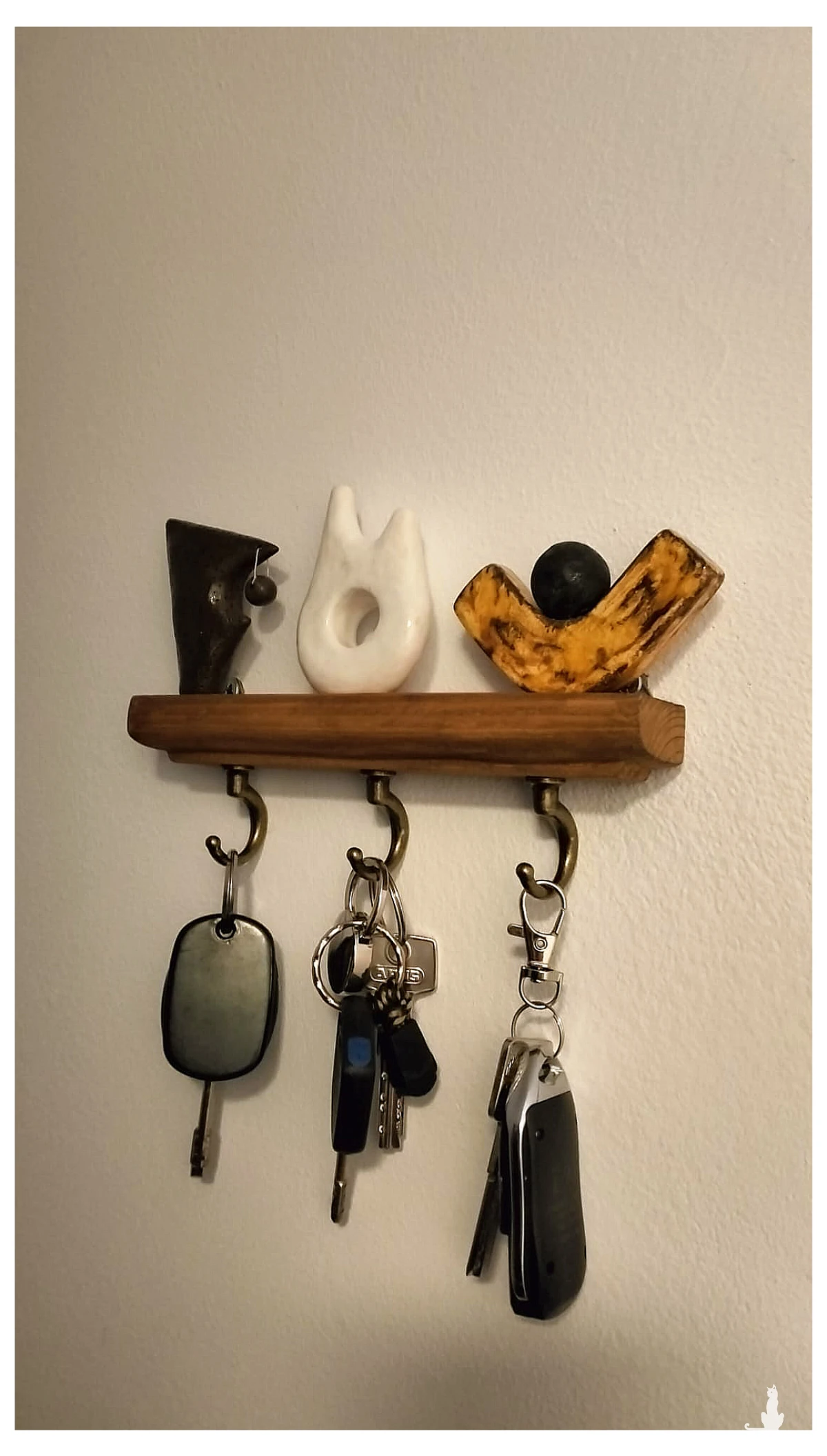 Wieszak z geometrycznymi dodatkami, wykonanymi z ceramiki i wypalonymi w temp ok 1260 stopni C. O długości ok 17 cm. Polecam serdecznie.