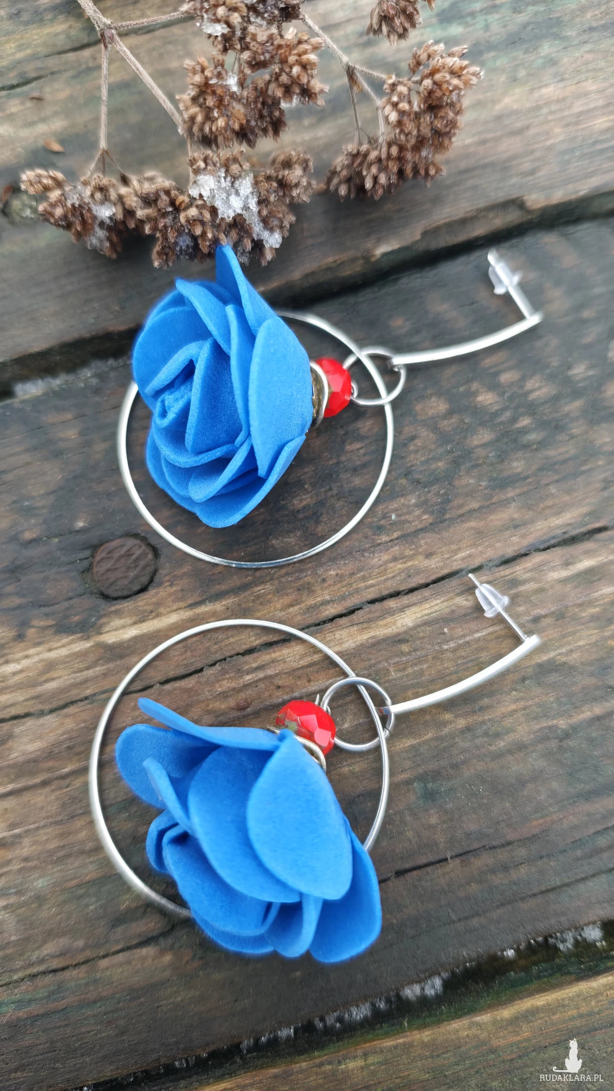 ,,z niebieskim kwiatkiem,, to kolczyki wykonane na obręczach w kolorze srebrnym i niebieskiego kwiatka z pianki. Kolczyki zawieszone są na ozdobnych biglach typu sztyft wykonanych ze stali szlachetnej.