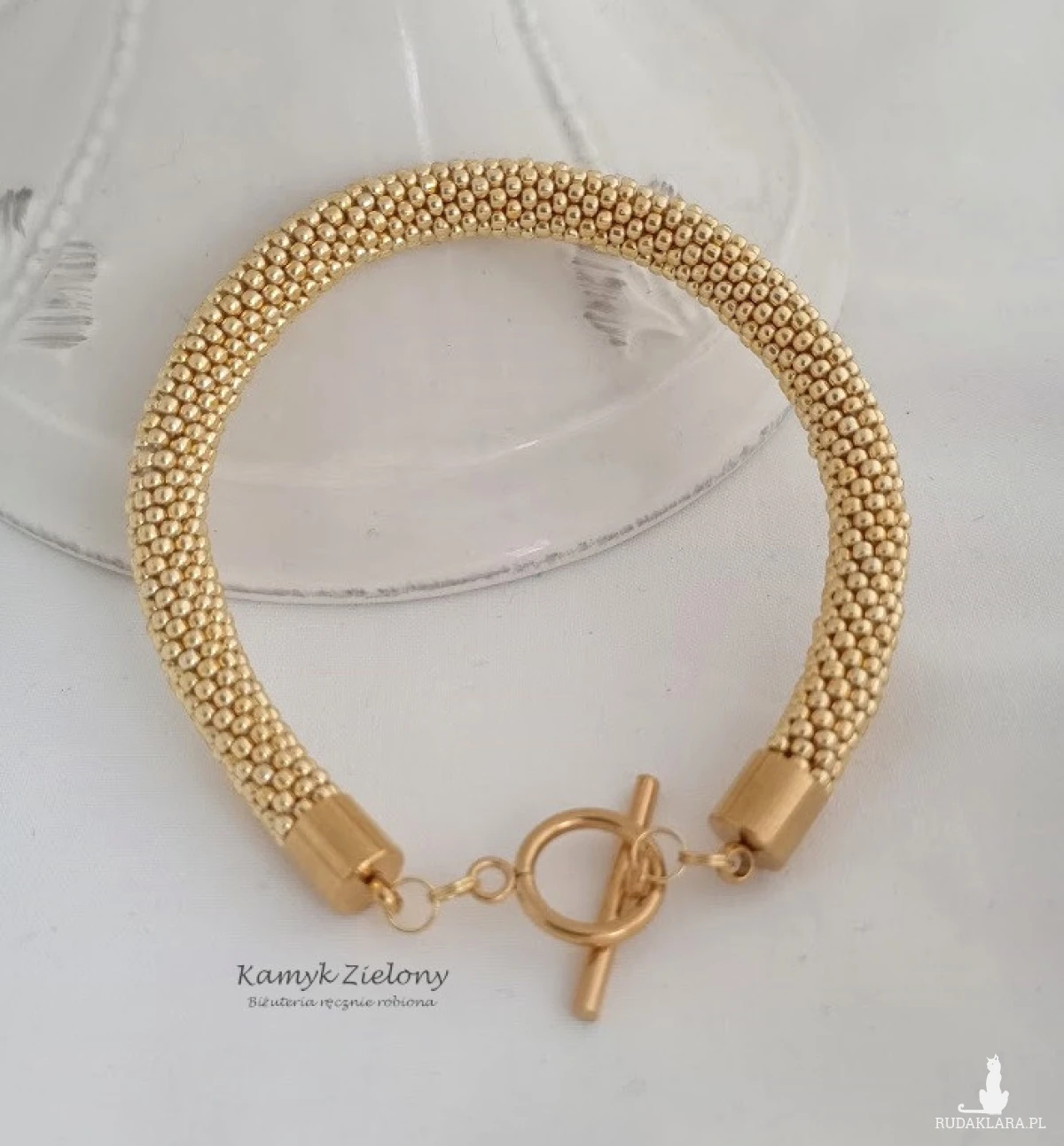Bransoletka o nieco grubszym przekroju z wysokiej jakości szklanych koralików Toho w kolorze złotym. Do jej wykonania wykorzystane zostały najwyższej jakości koraliki z warstwą złotego koloru naniesioną w procesie produkcji metodą galwanizowania. Dzięki zastosowaniu specjalnej powłoki Permanent Finish, kolor koralików jest wyjątkowo trwały - nie ściera się ani nie ulega ciemnieniu czy wyblaknięciu w trakcie użytkowania bransoletki.