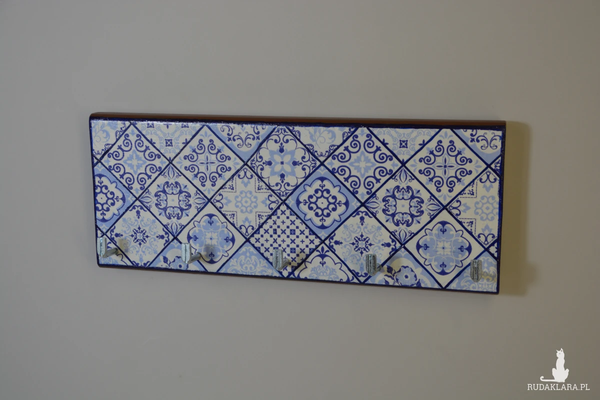 Dodaj swojemu wnętrzu stylu i funkcjonalności dzięki temu ręcznie wykonanemu drewnianemu wieszakowi na klucze, ozdobionemu techniką decoupage w klasycznym niebiesko-białym stylu azulejo.