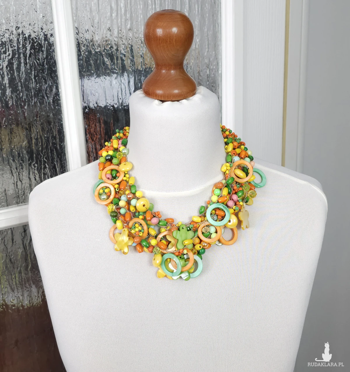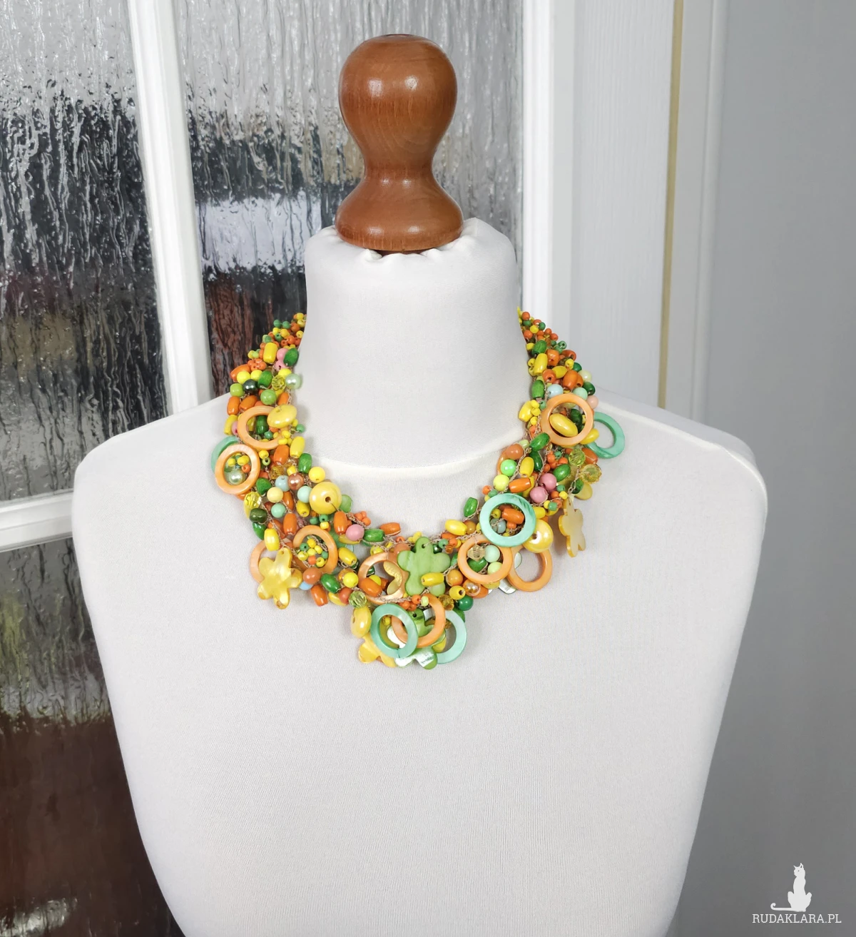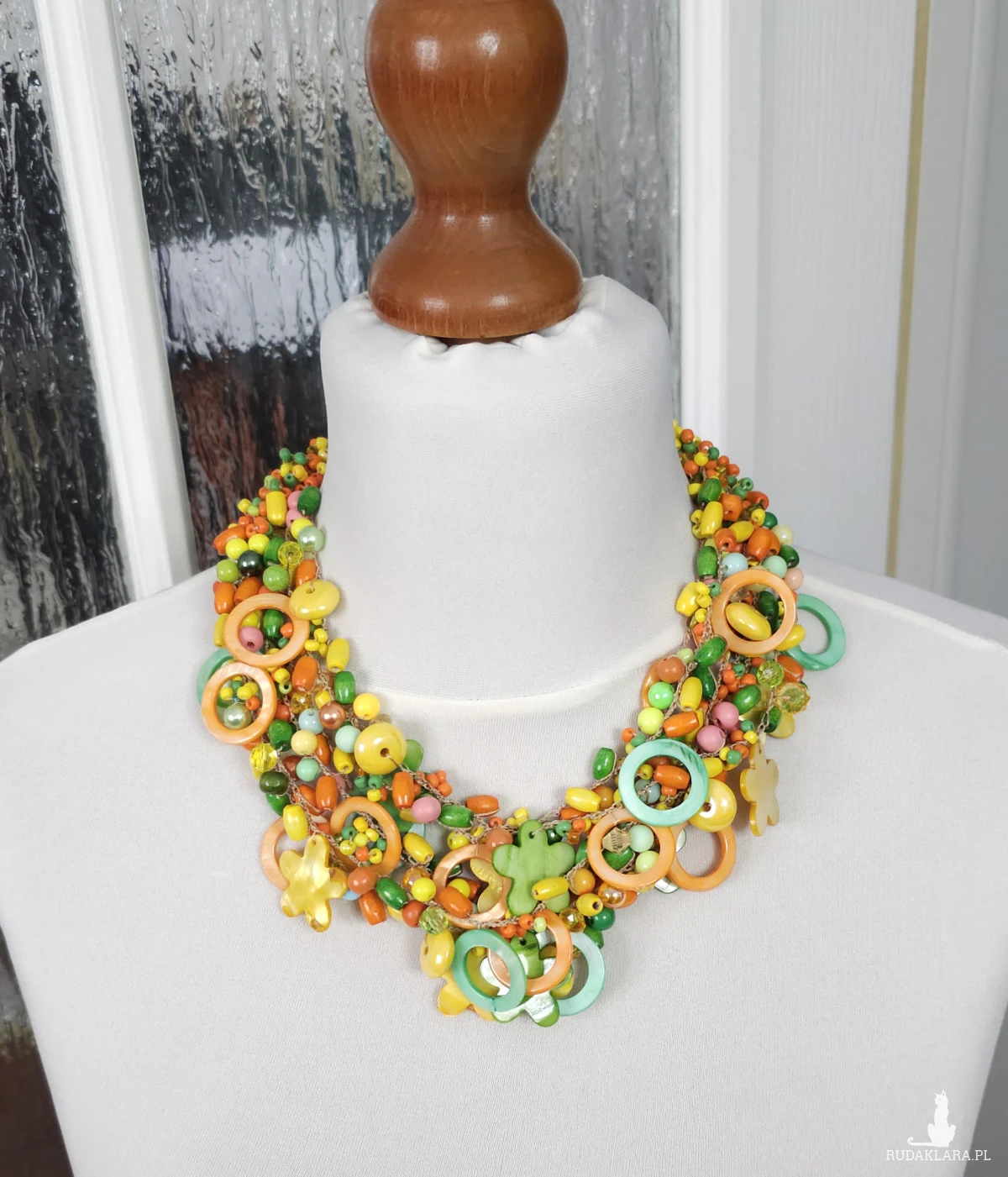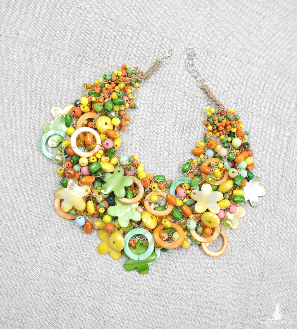 Bogata kompozycja koralików w odcieniach pomarańczu, żółci i zieleni, ozdobiona elementami z masy perłowej w kształcie kwiatów i kół.