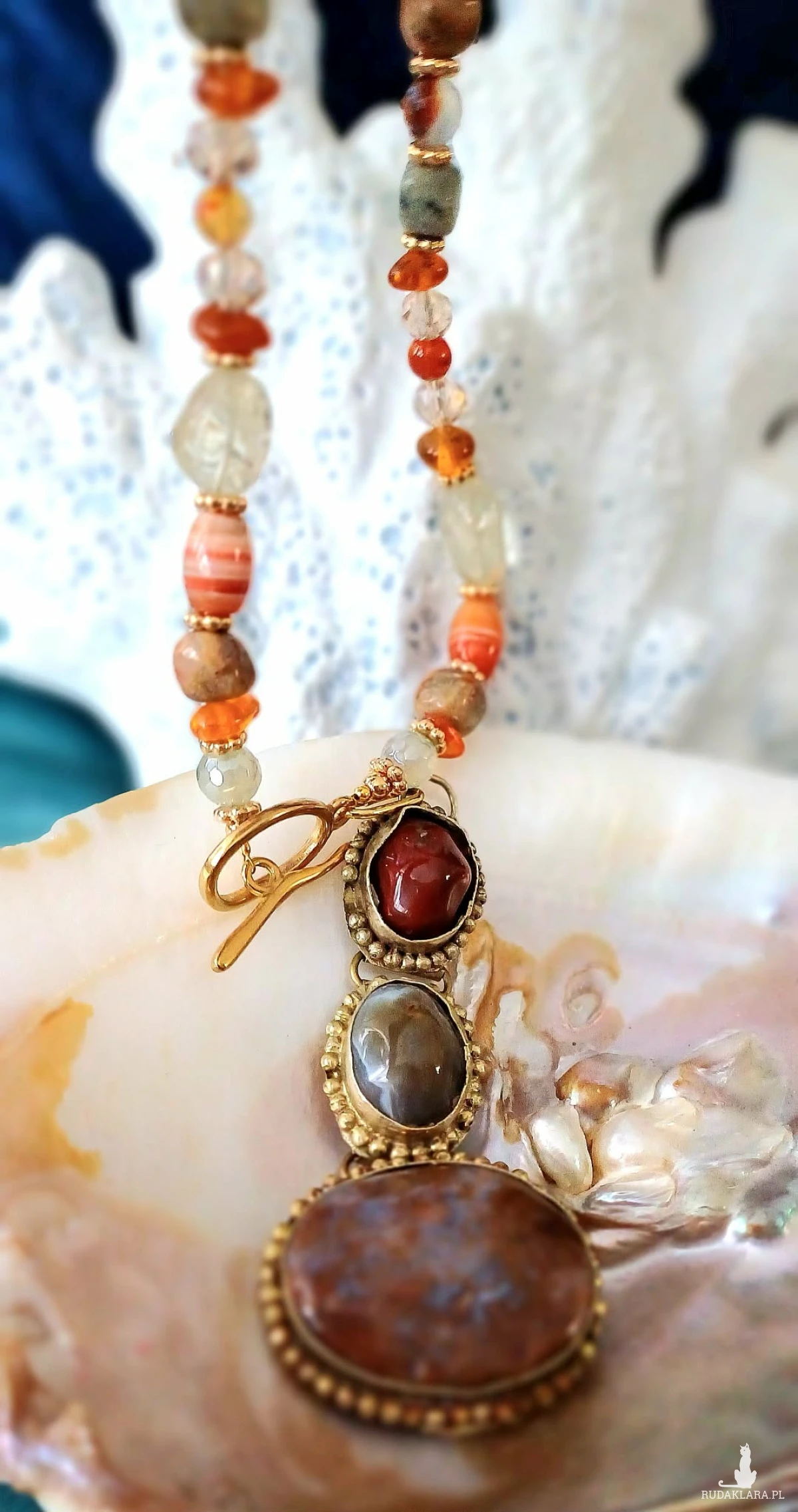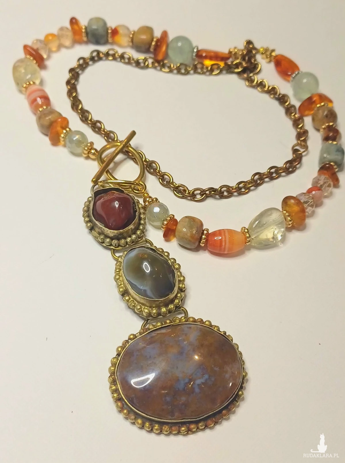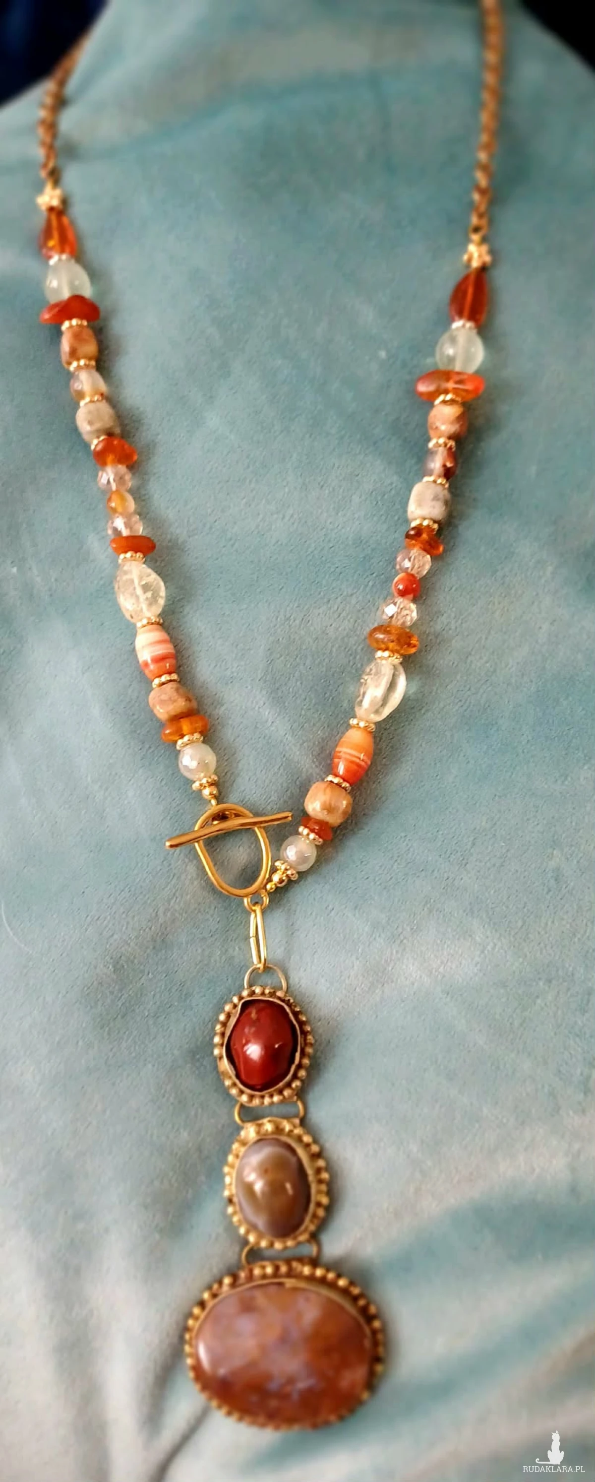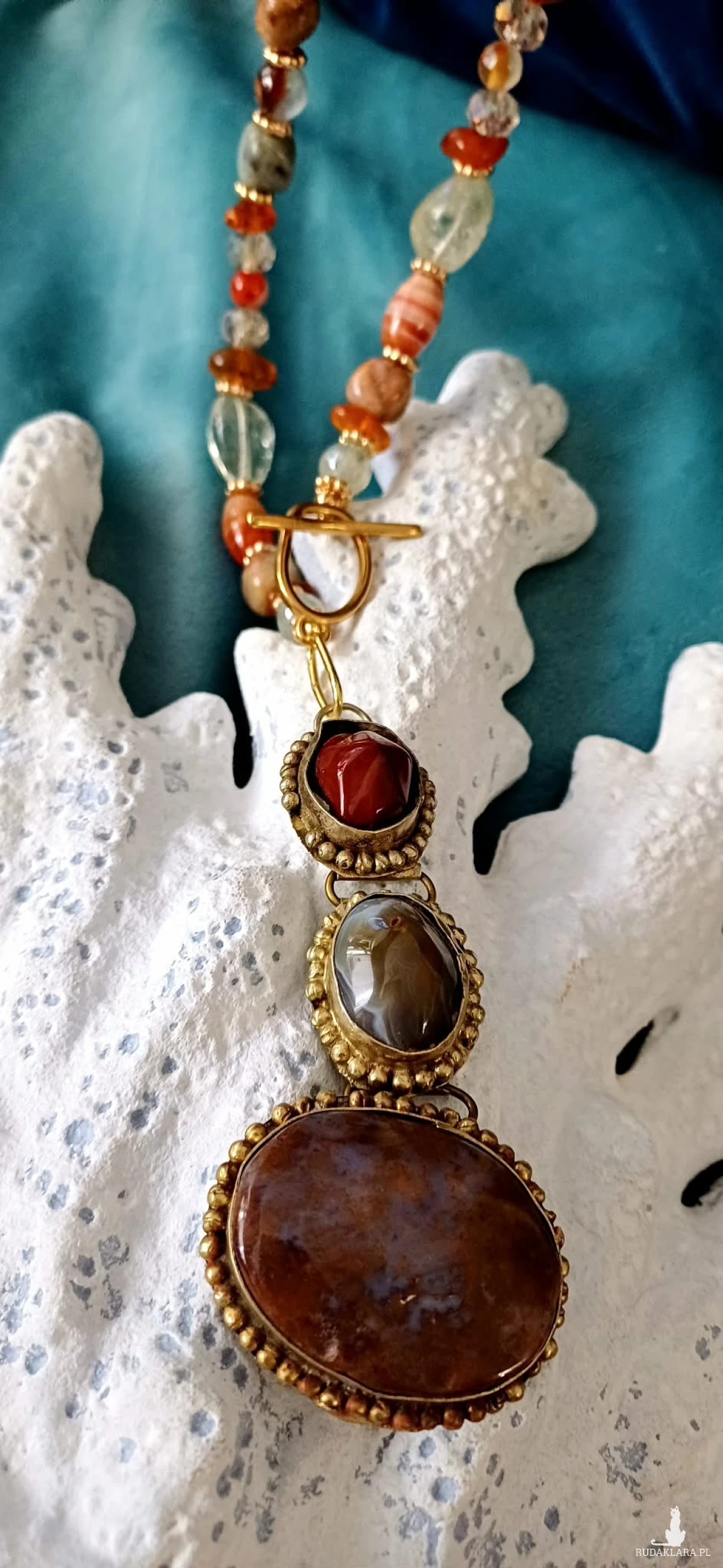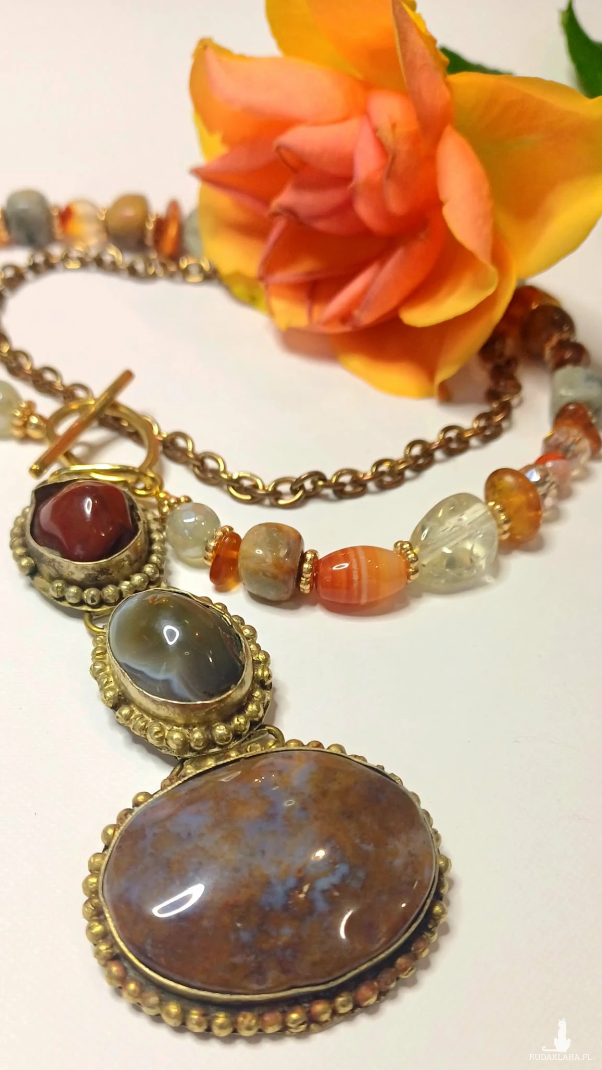 Naszyjnik ozdobiony jest elegancką zawieszką vintage z agatami, która dodaje mu niepowtarzalnego uroku i klasy, przenosząc nas w czasie do epok pełnych romantyzmu i tajemniczości.