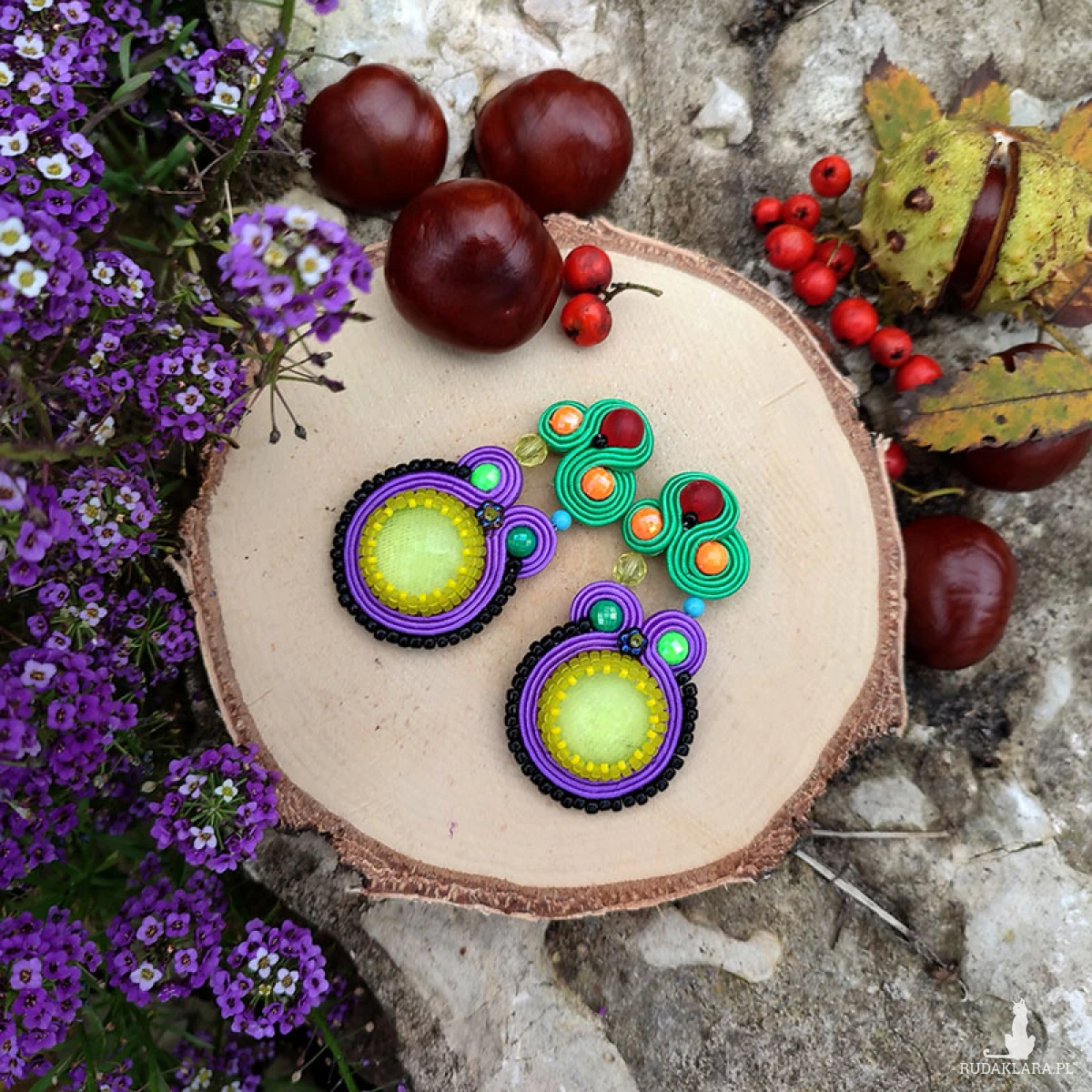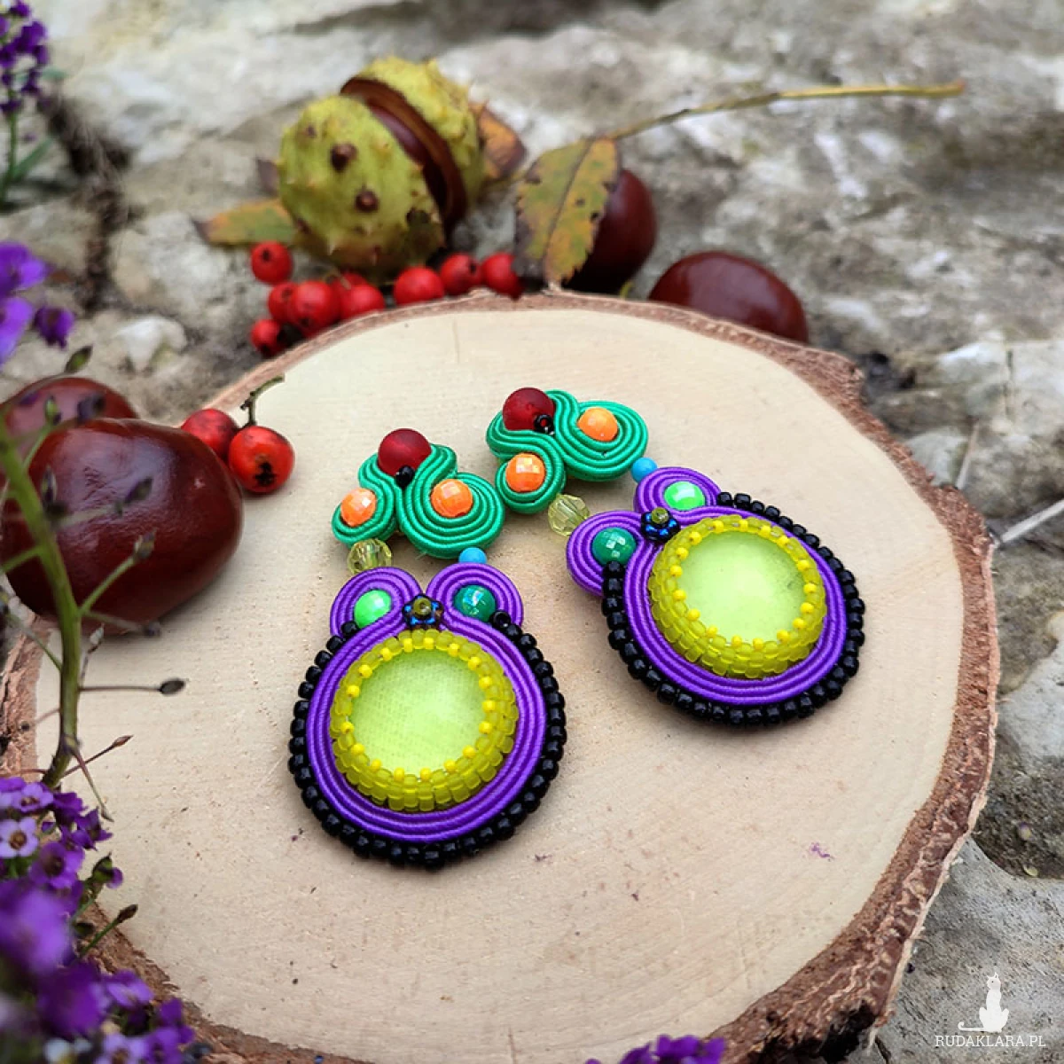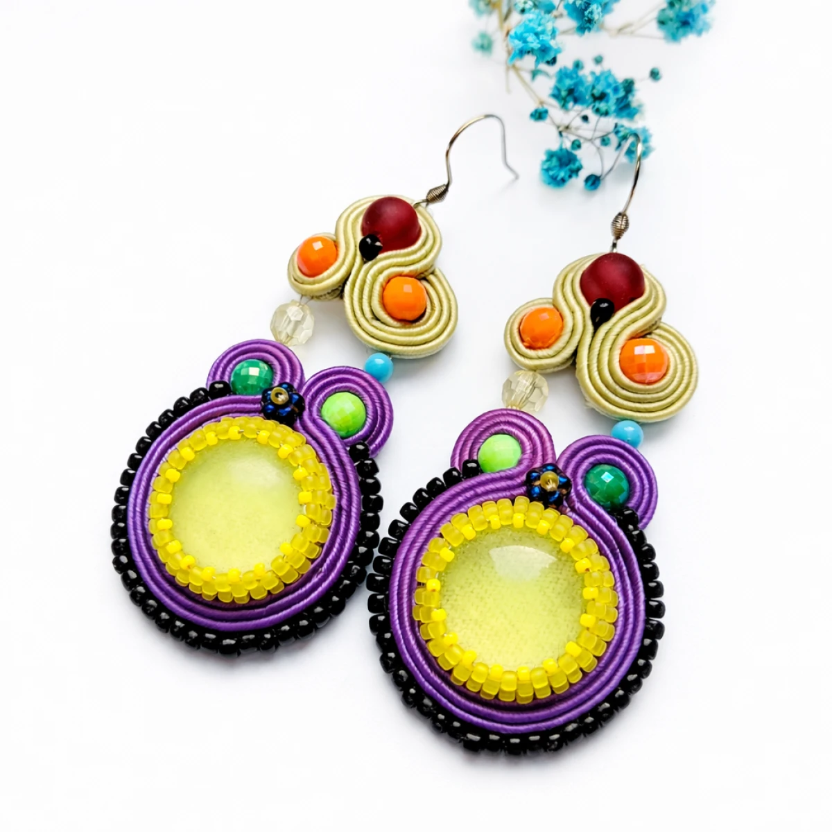 Te unikatowe kolczyki sutasz zostały wykonane ręcznie z dbałością o każdy detal. Intensywny fiolet, energetyczna żółć oraz kolorowe akcenty koralików tworzą odważną i artystyczną kompozycję.
