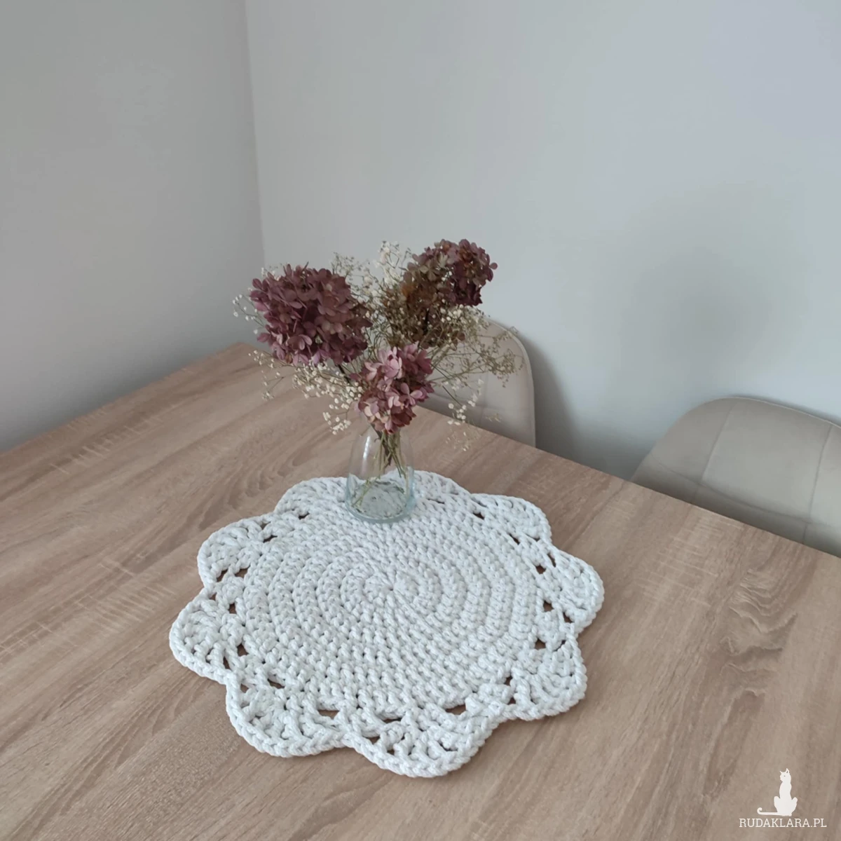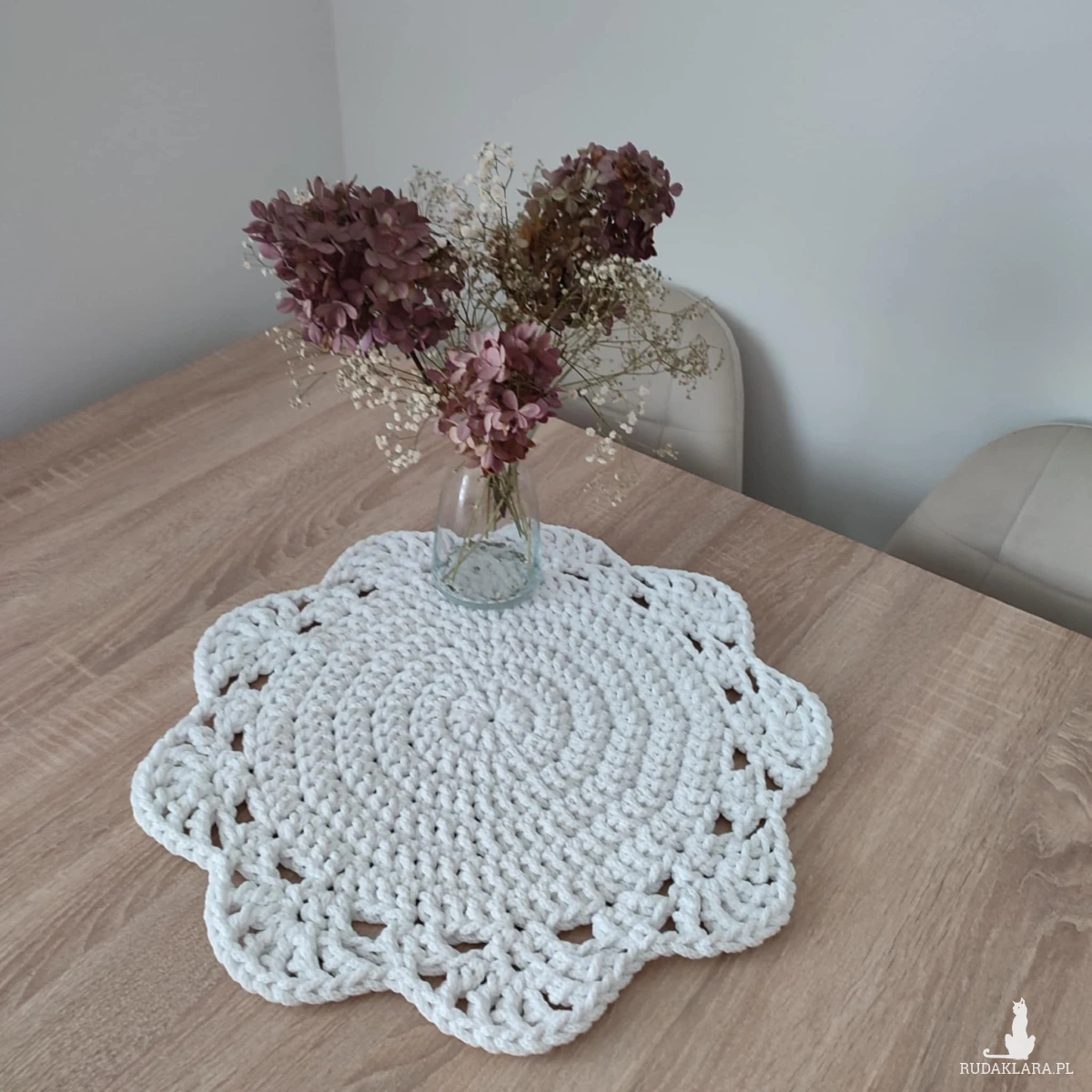 Podkładka o średnicy 46cm, wykonana metodą szydełkowania z polskiego sznurka bawełnianego 5mm.