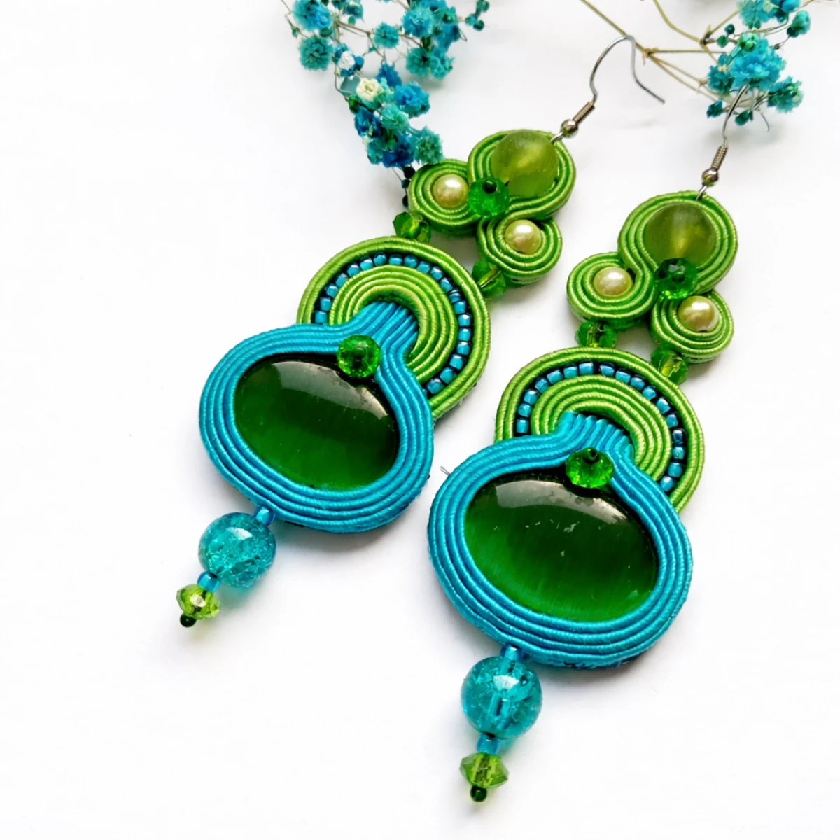 Te niezwykłe długie kolczyki zostały wykonane techniką sutasz, która pozwala tworzyć misterne i eleganckie formy. Połączenie intensywnej zieleni z głębokim turkusem nadaje biżuterii wyrazisty, a zarazem harmonijny charakter.