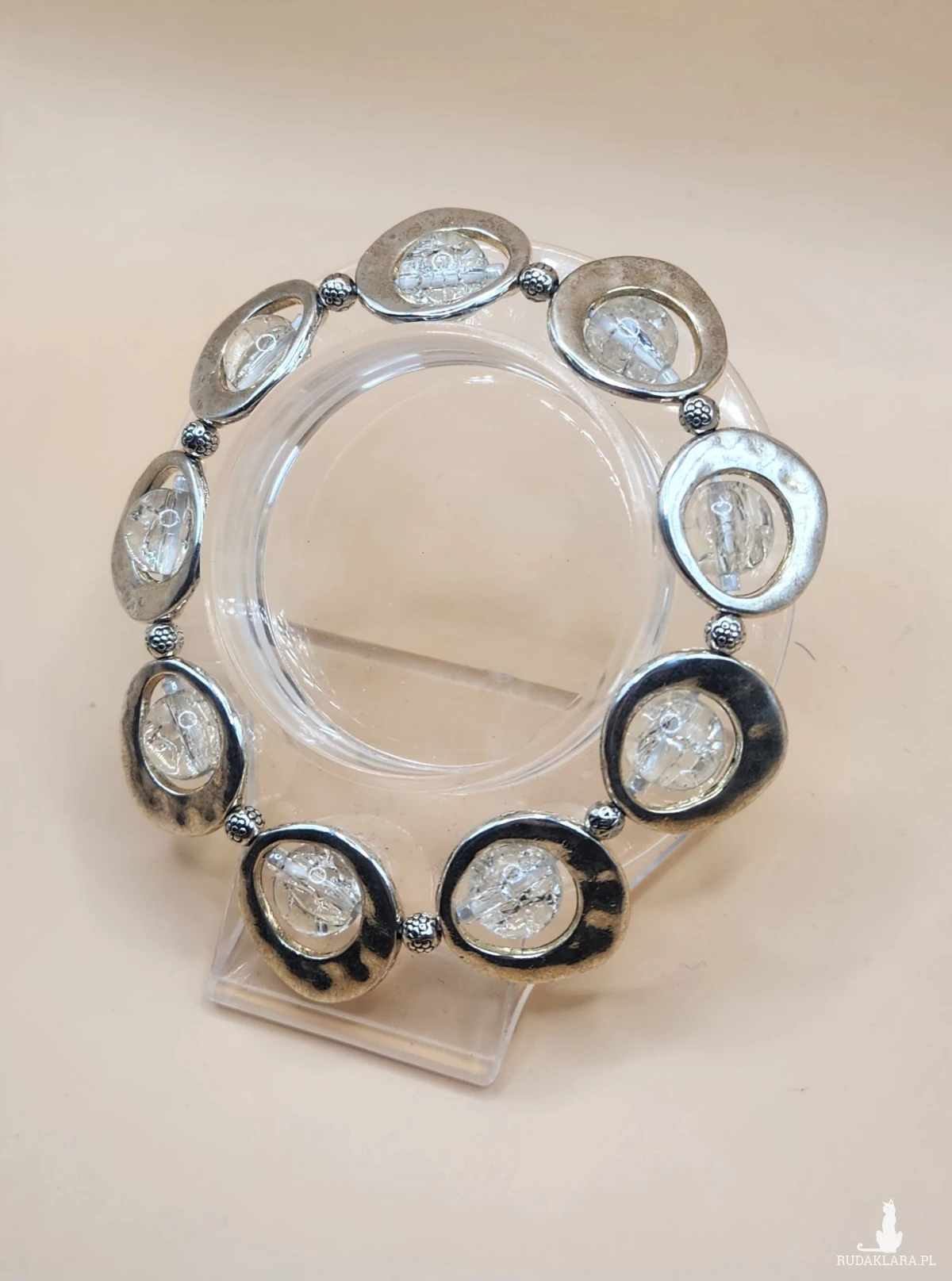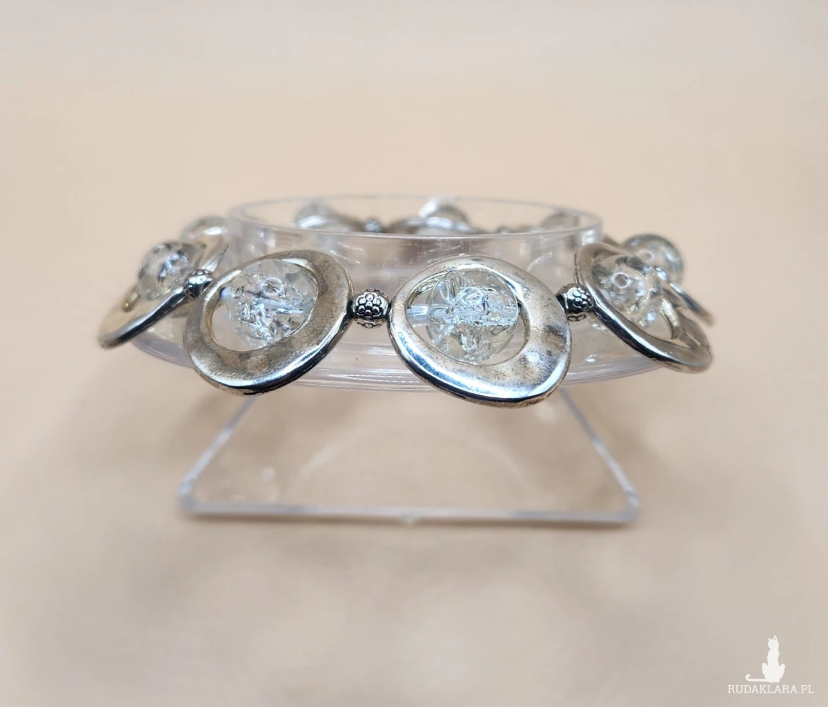 Sprzedam efektowną bransoletkę w kolorze srebrnym z dekoracyjnymi okrągłymi elementami oraz przezroczystymi ozdobami. Biżuteria prezentuje się bardzo elegancko i nowocześnie — idealna zarówno na co dzień, jak i na specjalne okazje.