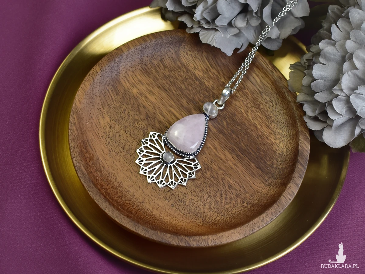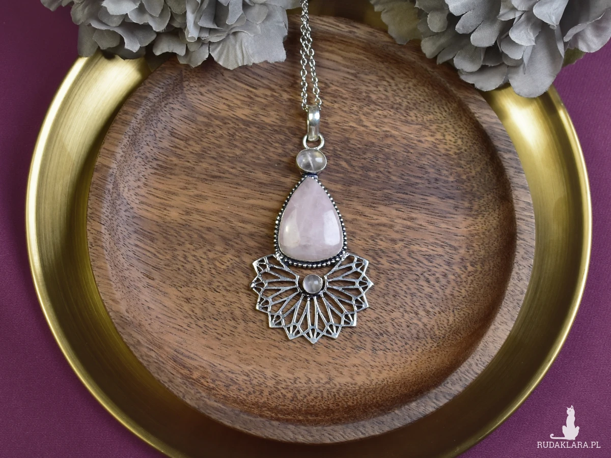 Wisiorek wykonany ręcznie z miedzi, pokryty srebrem, ozdobiony dużym różowym kwarcem oraz dwoma mniejszymi. Różowy kolor kwarcu symbolizuje miłość i harmonię, a jego naturalne wibracje mają kojący wpływ na emocje. Kamienie te znane są również z zdolności do przyciągania pozytywnej energii i promowania wewnętrznego spokoju. W połączeniu z unikalnym wykonaniem miedzi i srebra, wisiorek jest nie tylko estetycznym dodatkiem do garderoby, ale także talizmanem, który może przynieść spokój i równowagę w życiu codziennym.