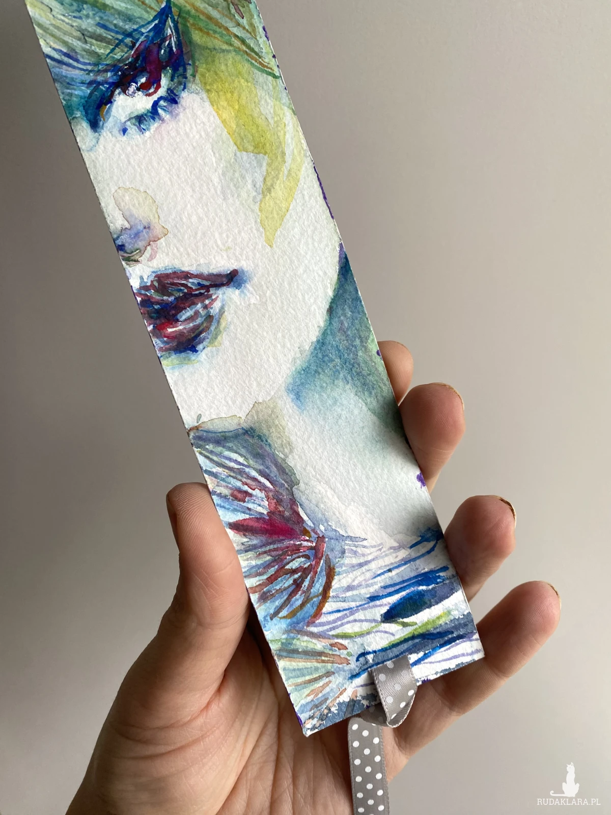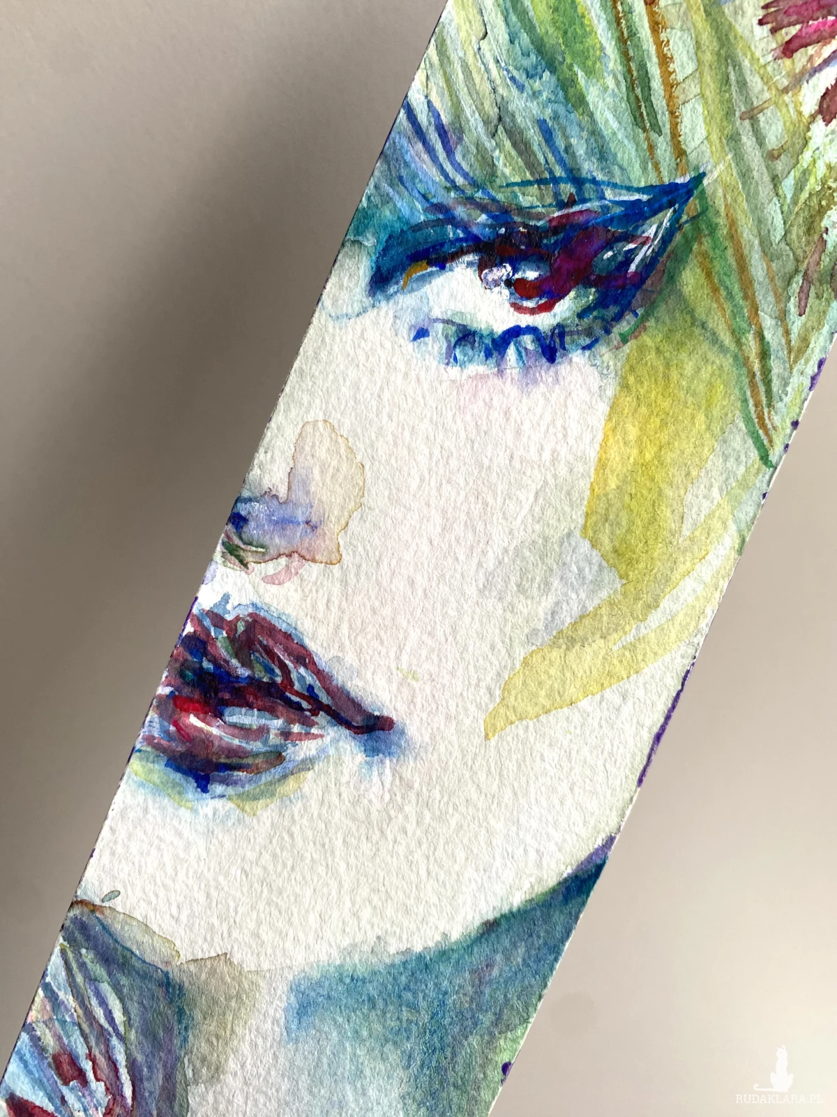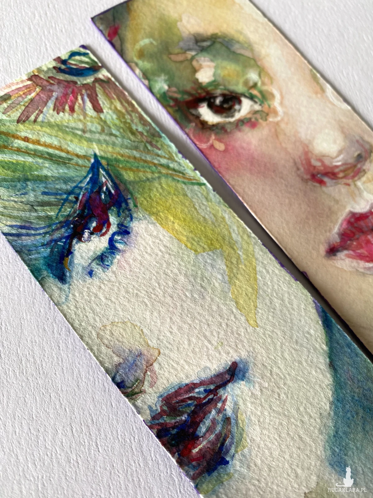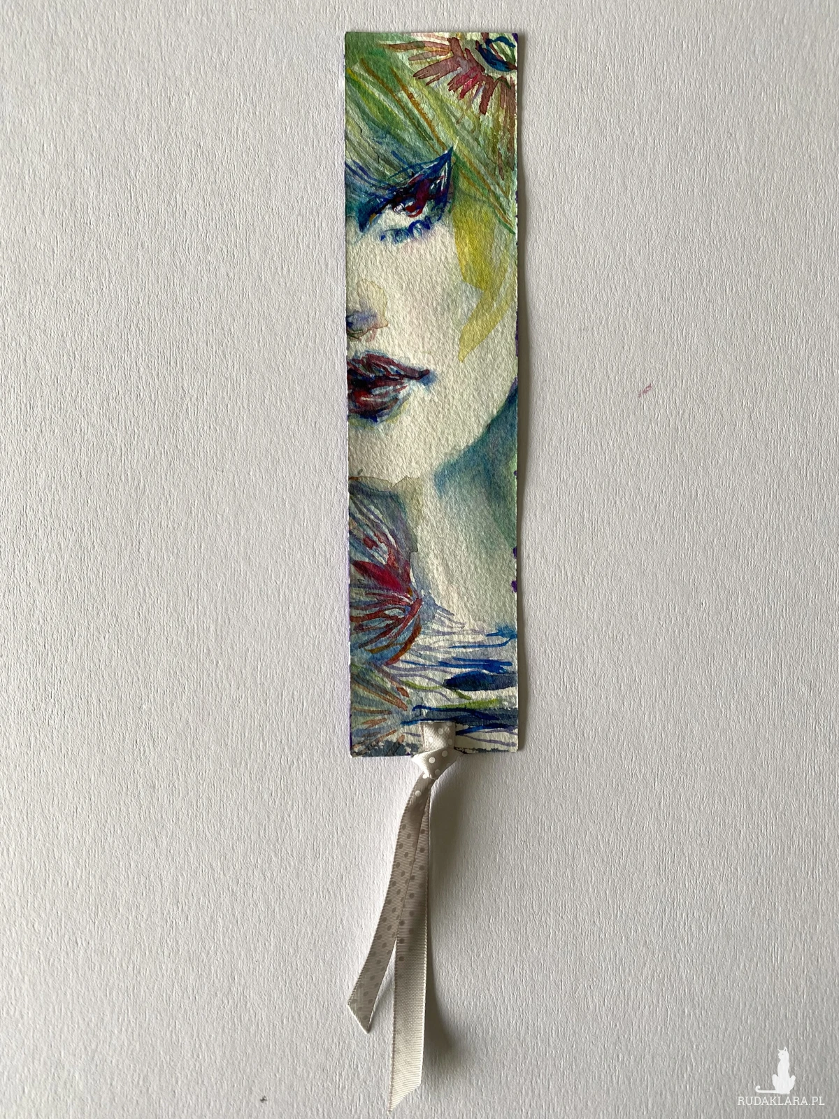 Ręcznie malowana papierowa zakładka. Przedstawia zbliżenie na twarz pięknej kobiety, kolory: niebieski, zielony, turkusowy.