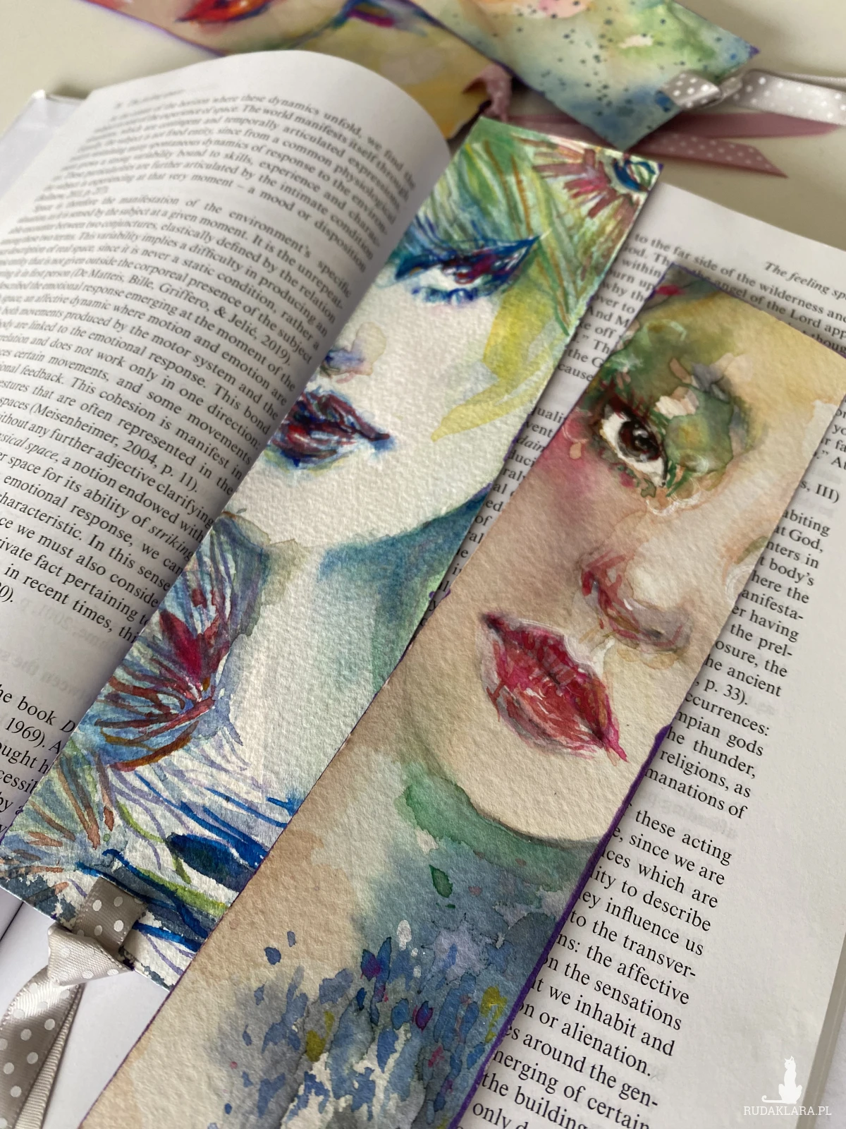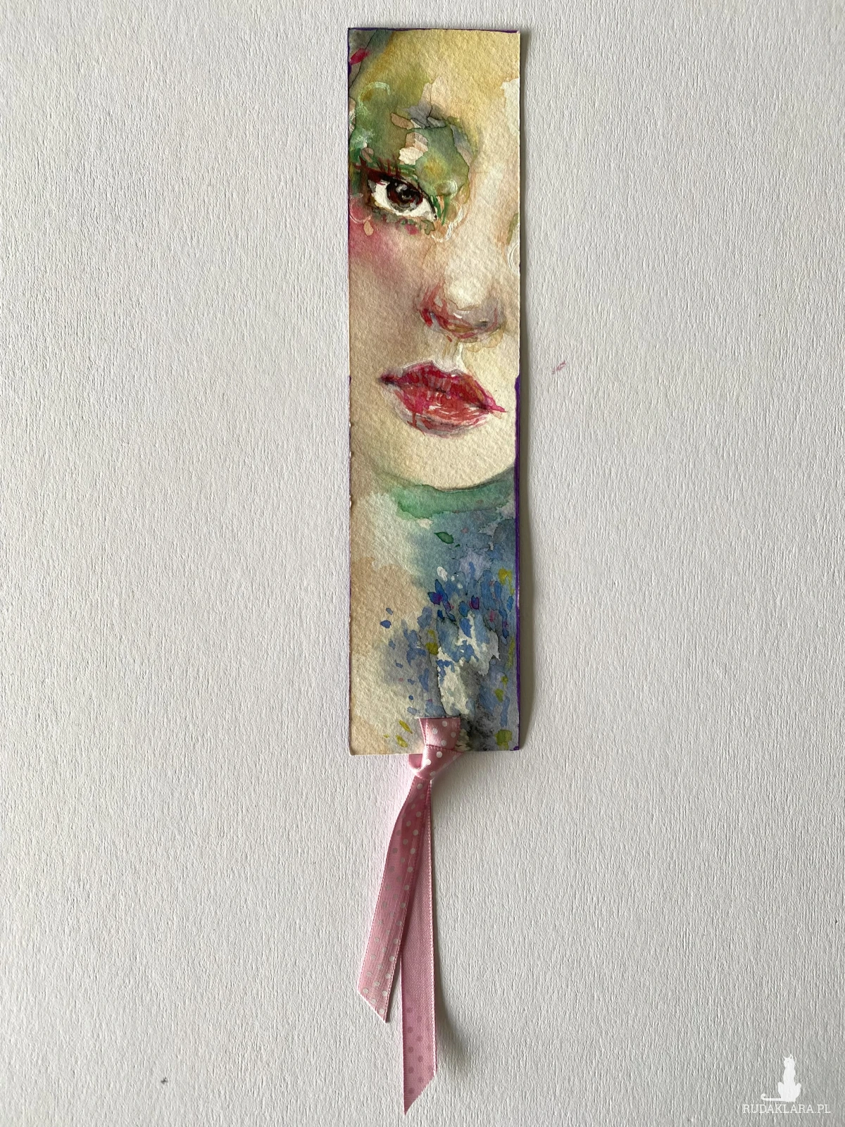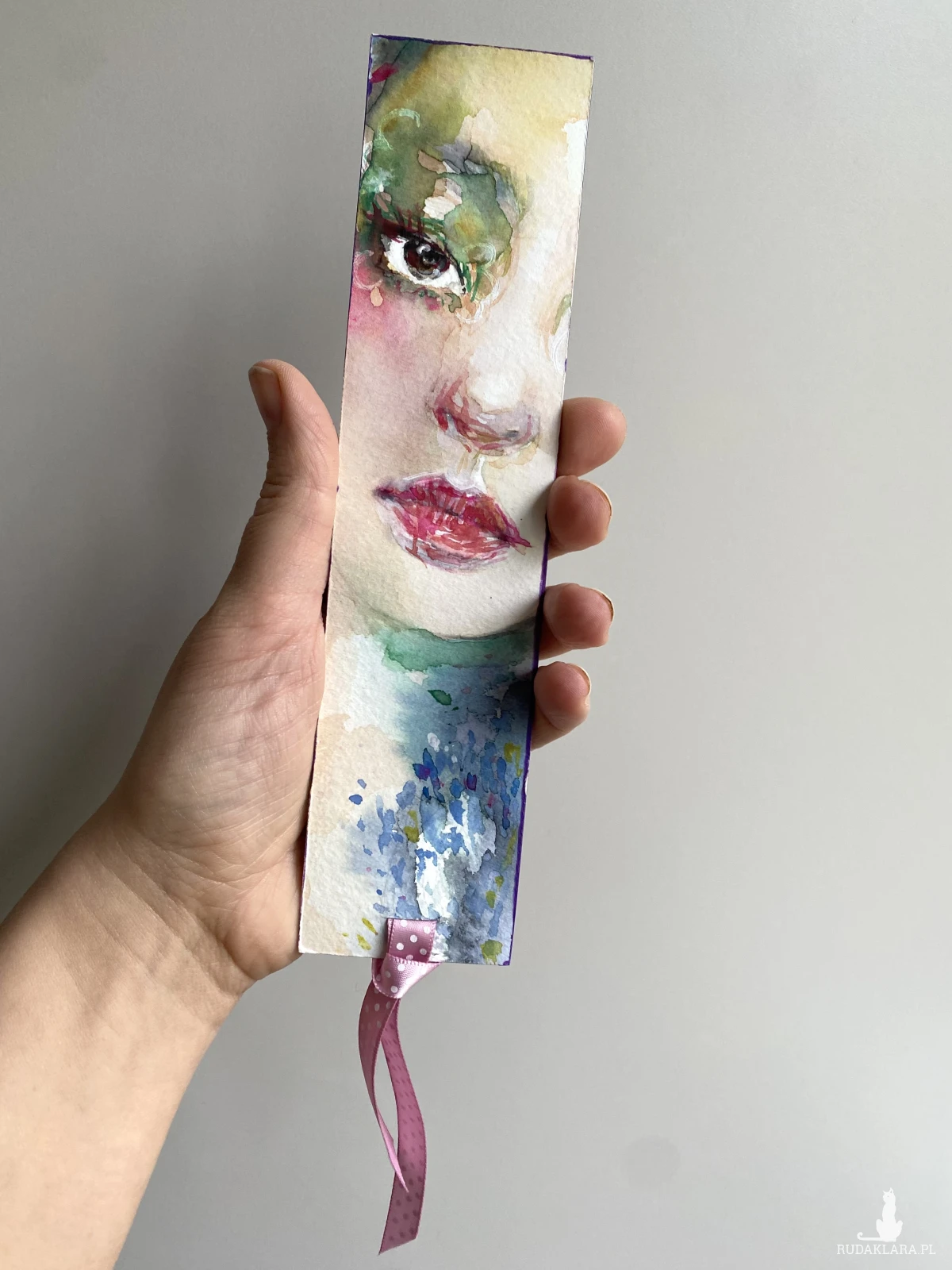 Ręcznie malowana papierowa zakładka. Przedstawia zbliżenie na twarz pięknej kobiety, kolory: niebieski, zielony, turkusowy.