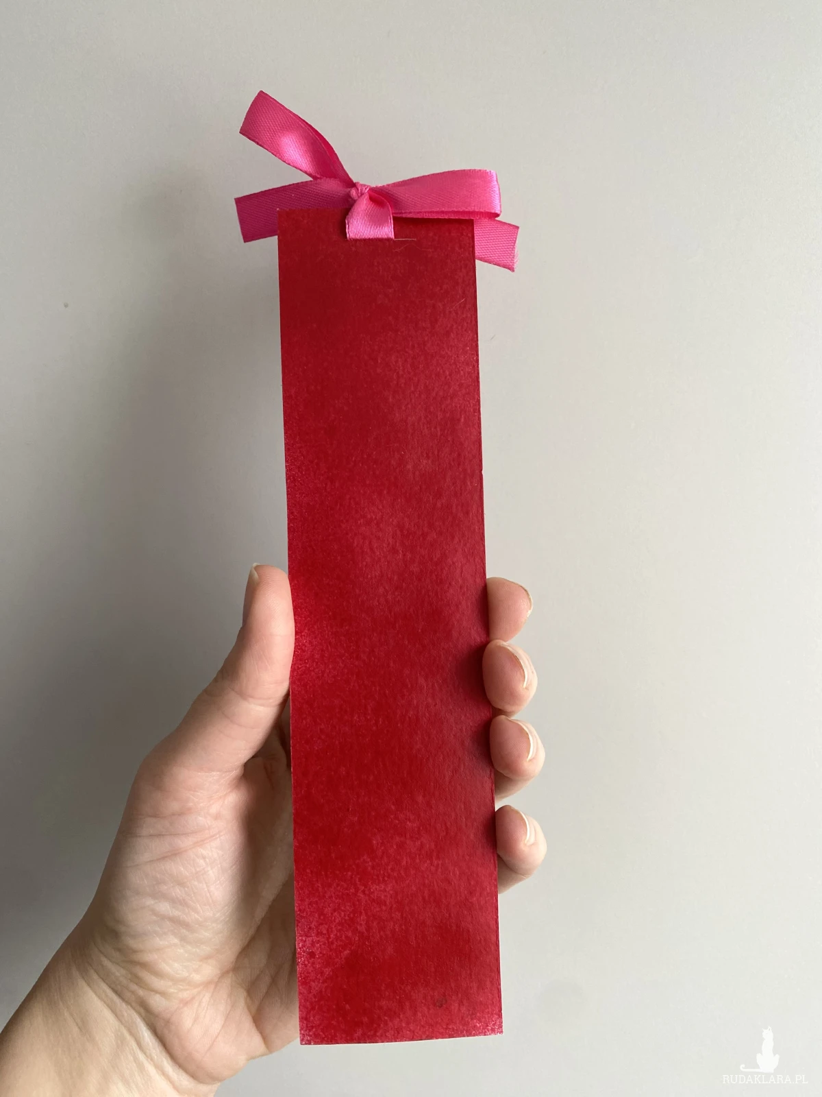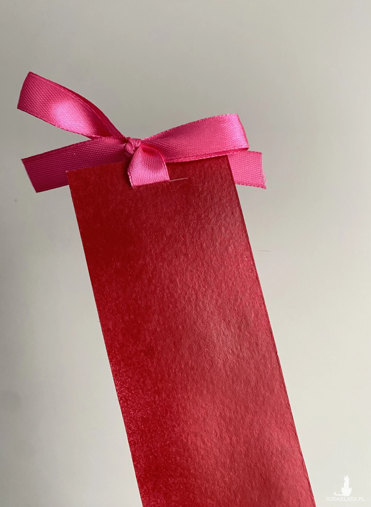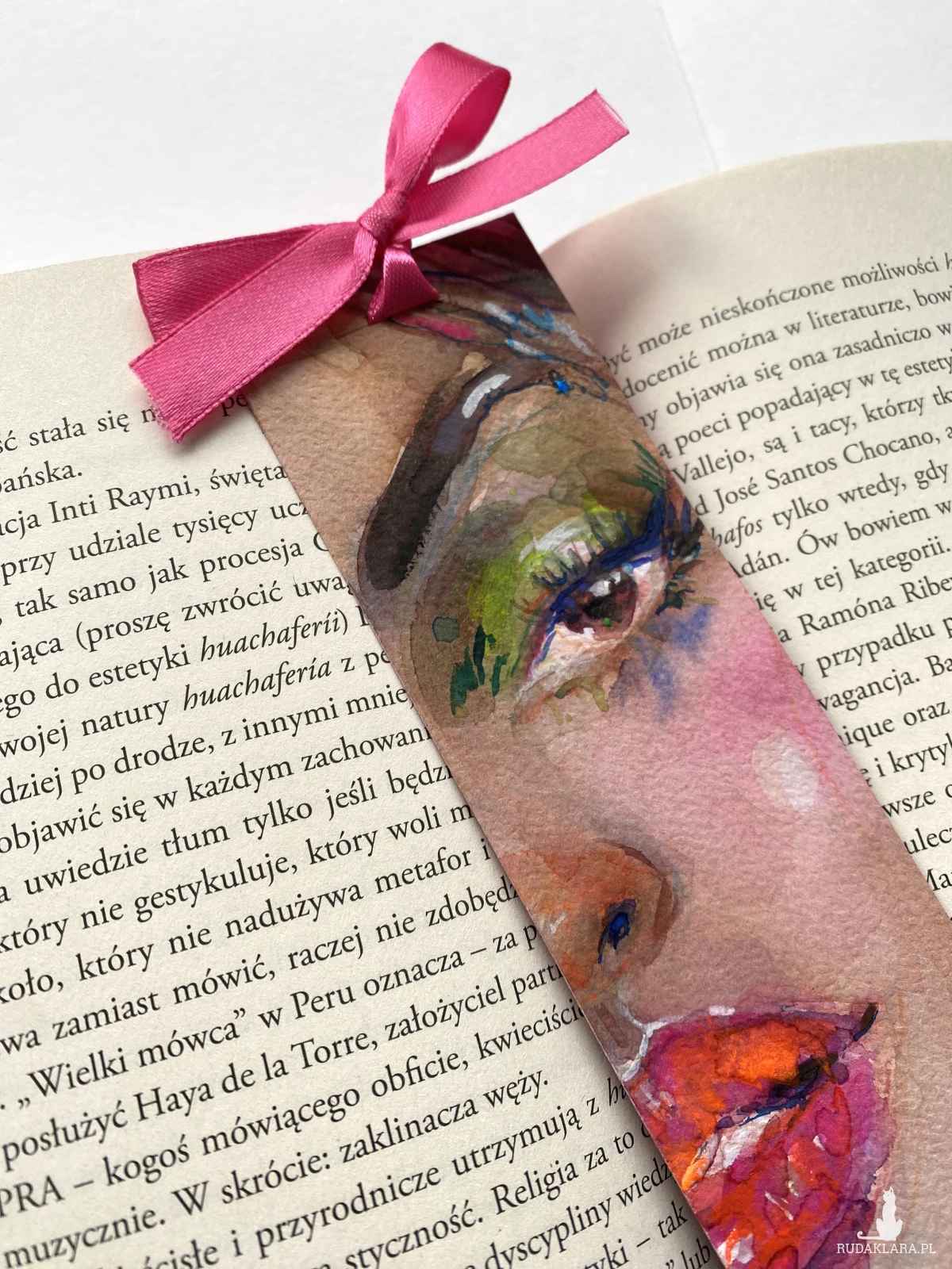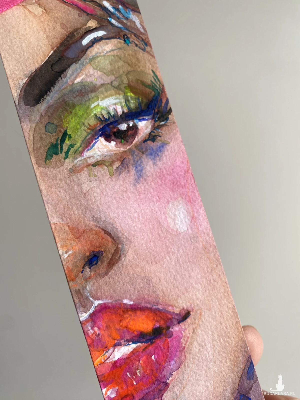 Ręcznie malowana papierowa zakładka. Przedstawia zbliżenie na piękną kobiecą twarz, w odcieniach czerwieni i różu.