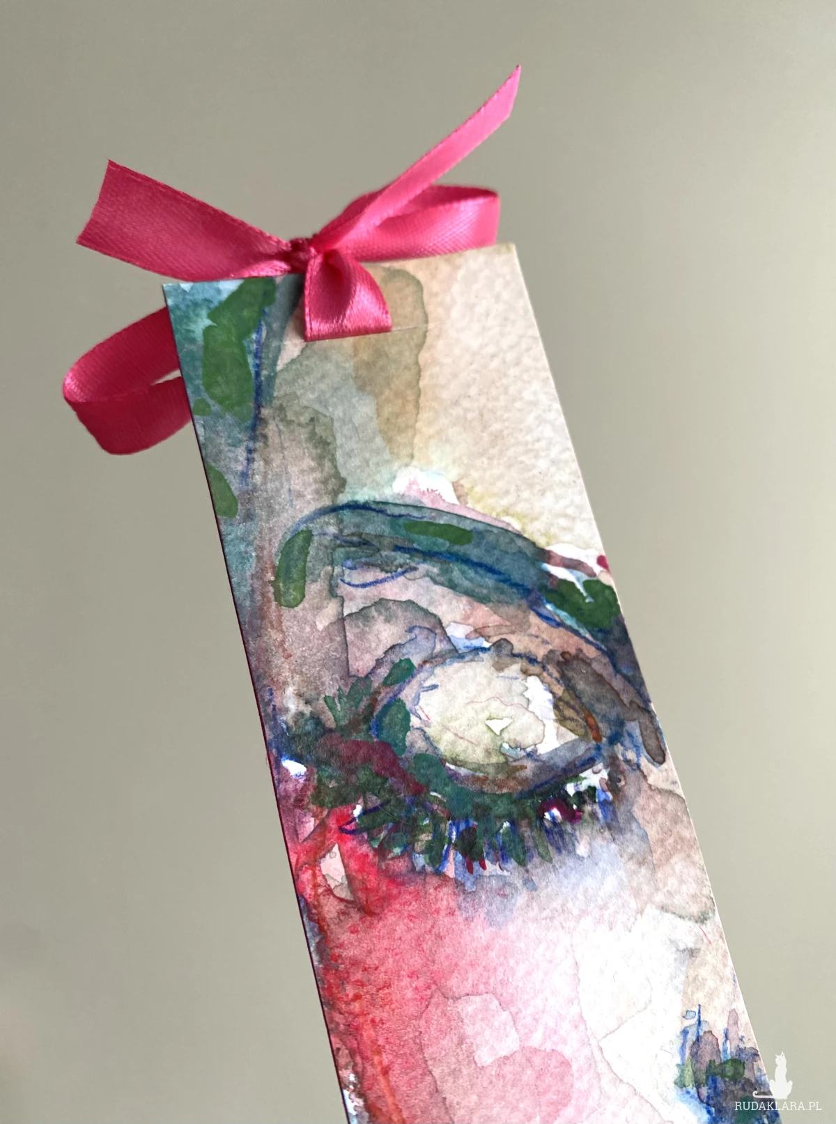 Ręcznie malowana papierowa zakładka. Przedstawia zbliżenie na piękną kobiecą twarz z zamkniętymi oczami.