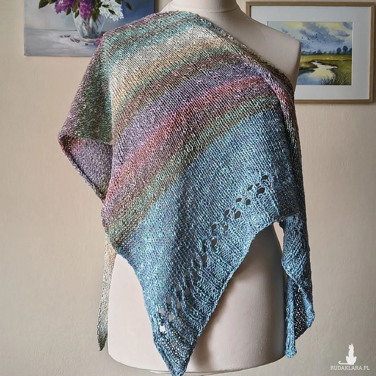 Ciekawa, średniej wielkości chusta o odpowiednim na każda porę roku składzie: len, bawełna, wiskoza i cieniutka jak włos nić 100% wełenki merino. Chusta została wykonana ręcznie na drutach z indywidualnie dobranych włóczek i stanowi doskonałą propozycje na cieplejsze miesiące: wiosnę i lato. Kolorystyka twarzowa, a faktura włóczek ciekawa i przyciągająca wzrok. Chusta ma delikatnie asymetryczny kształt, a jej wymiary to: bok najdłuższy: 168 cm, wysokość trójkąta: 73 cm. Pranie - jak wszystkich moich wyrobów - ręczne.