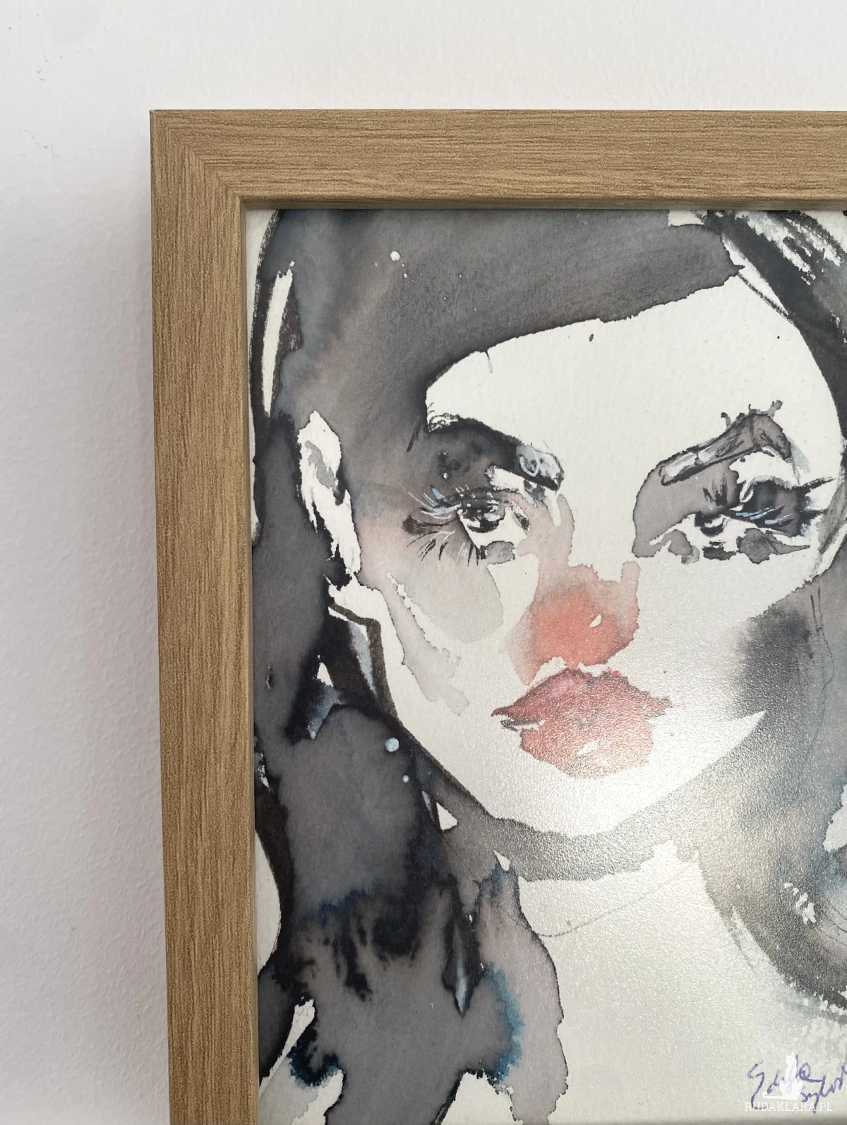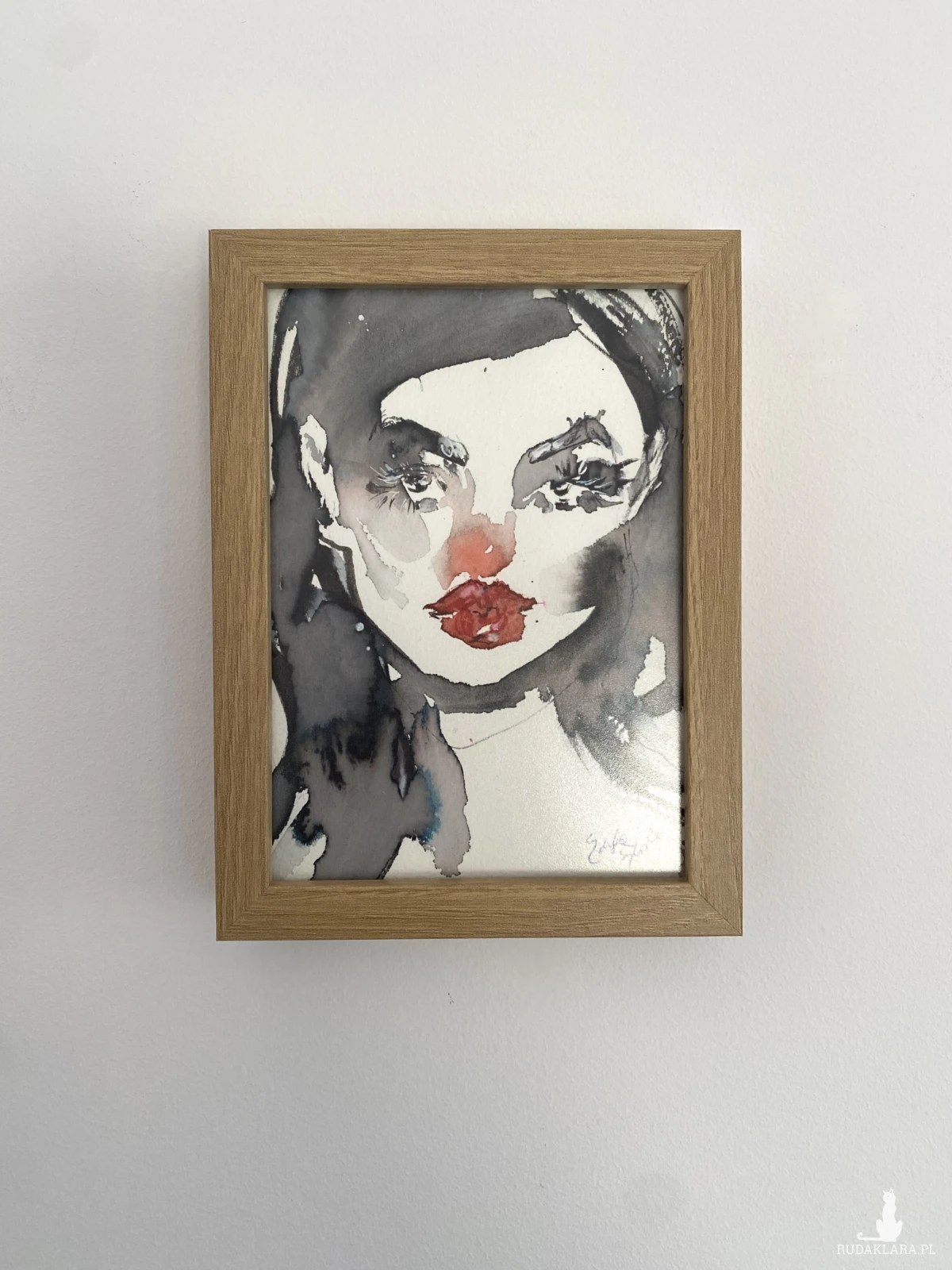 Niewielkich rozmiarów, 13x18 cm, akwarela na papierze sprzedawana w ramce ze szkłem antyrefleksyjnym. Sentymentalny, delikatny i minimalistyczny portret kobiety inspirowany modą i makijażem. Subtelna dekoracja ścienna.