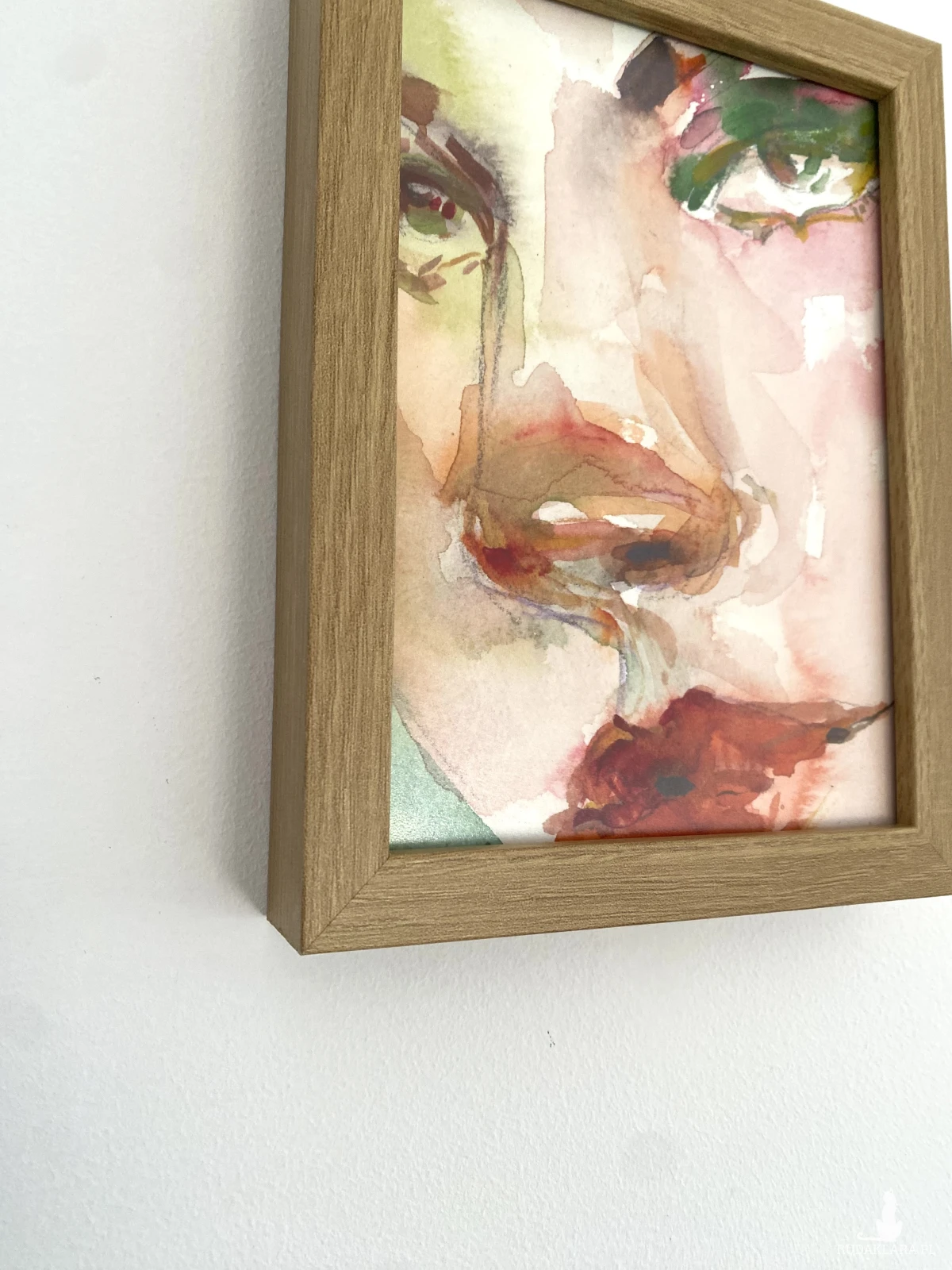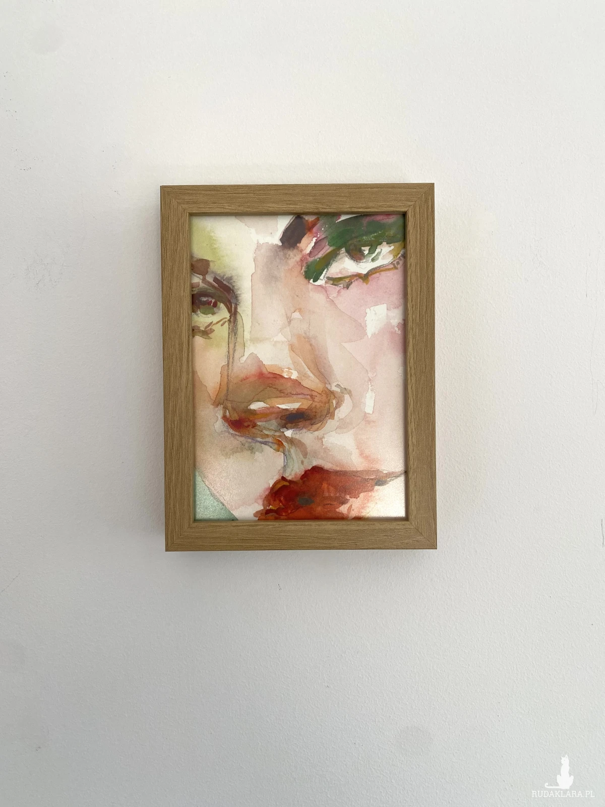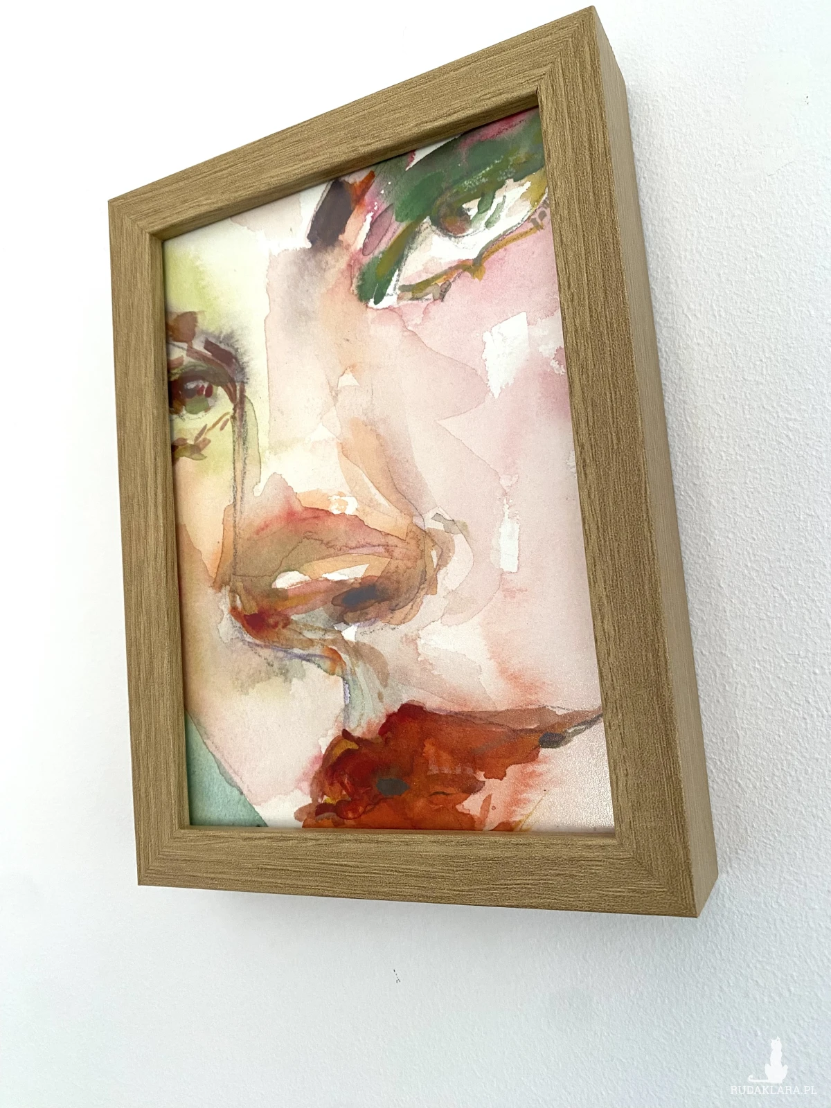 Niewielkich rozmiarów, 13x18 cm, akwarela na papierze sprzedawana w ramce ze szkłem antyrefleksyjnym. Zmysłowy, intrygujący i ekspresyjny portret kobiety inspirowany modą i makijażem. Subtelna dekoracja ścienna.