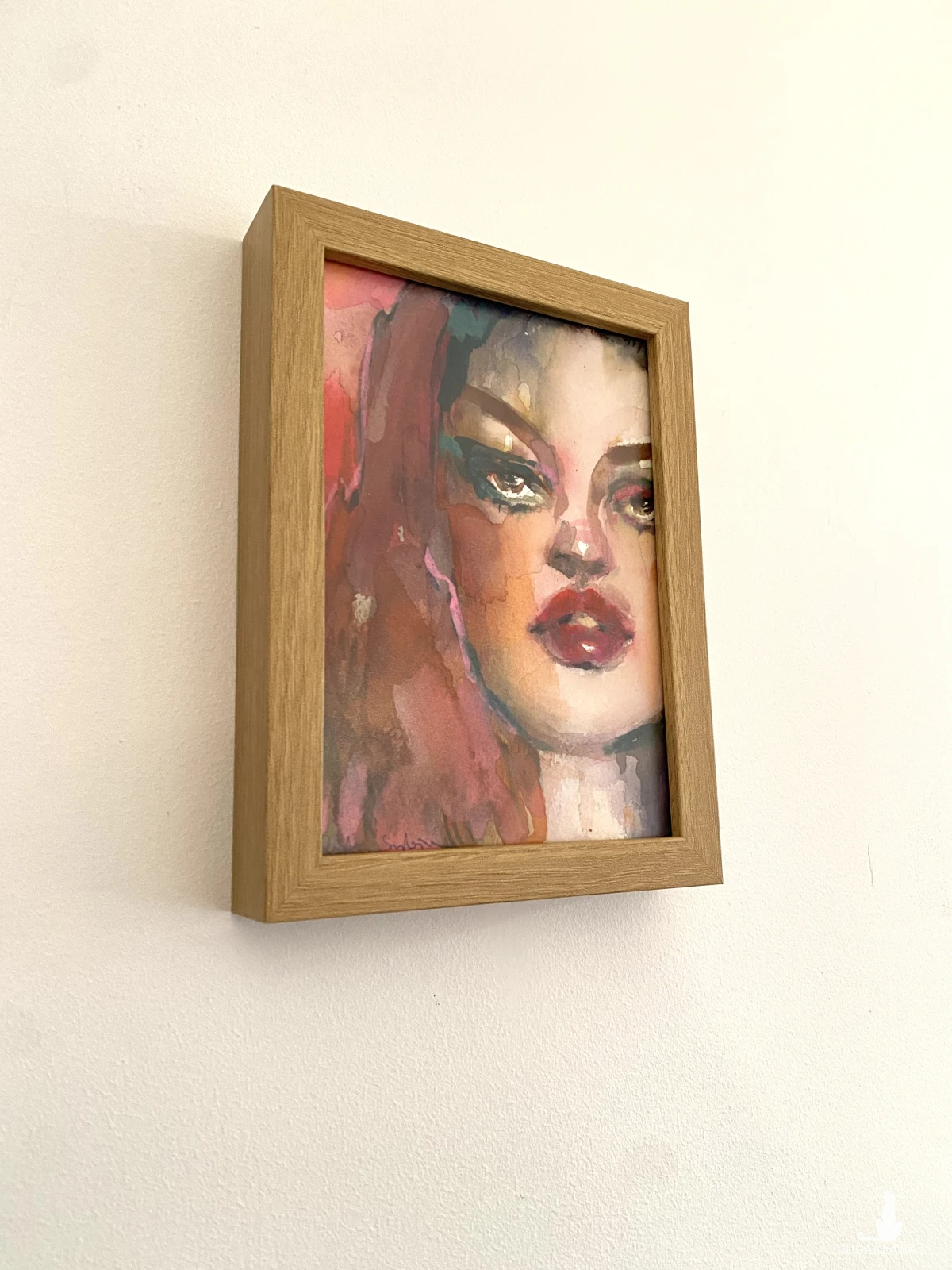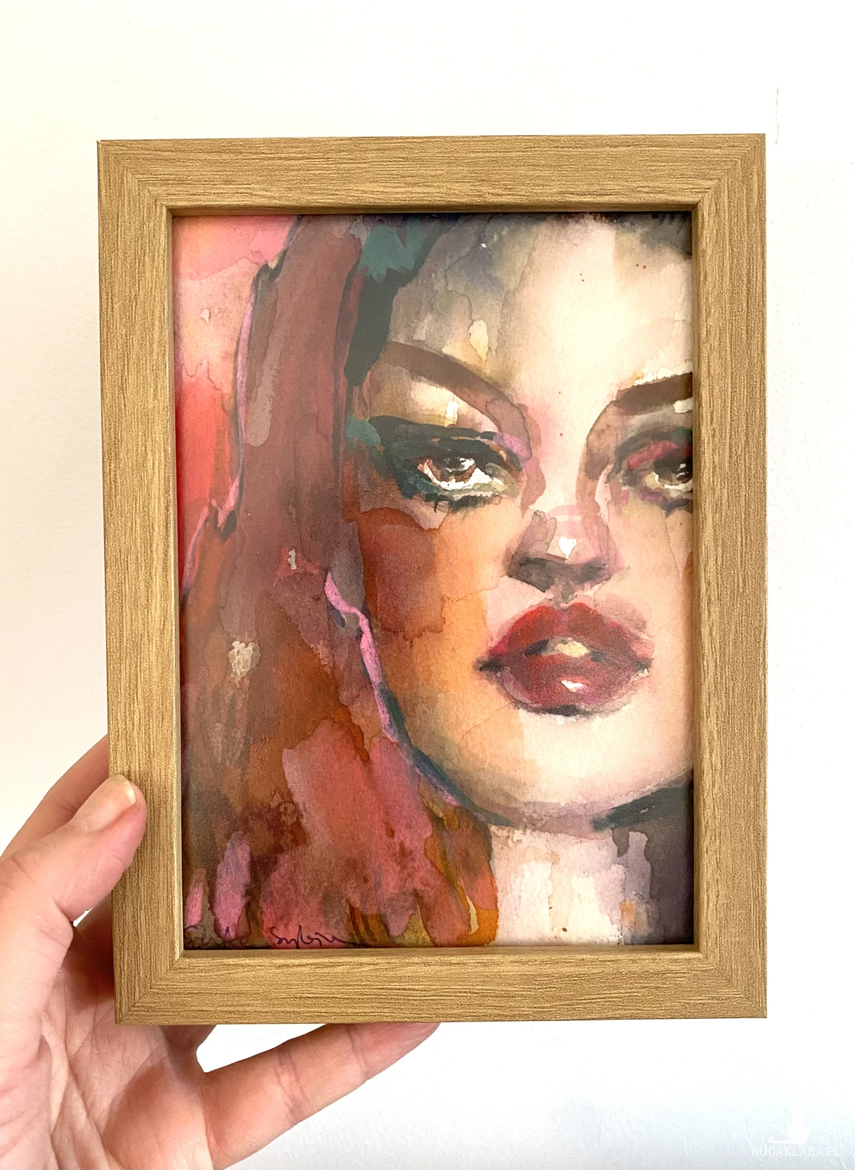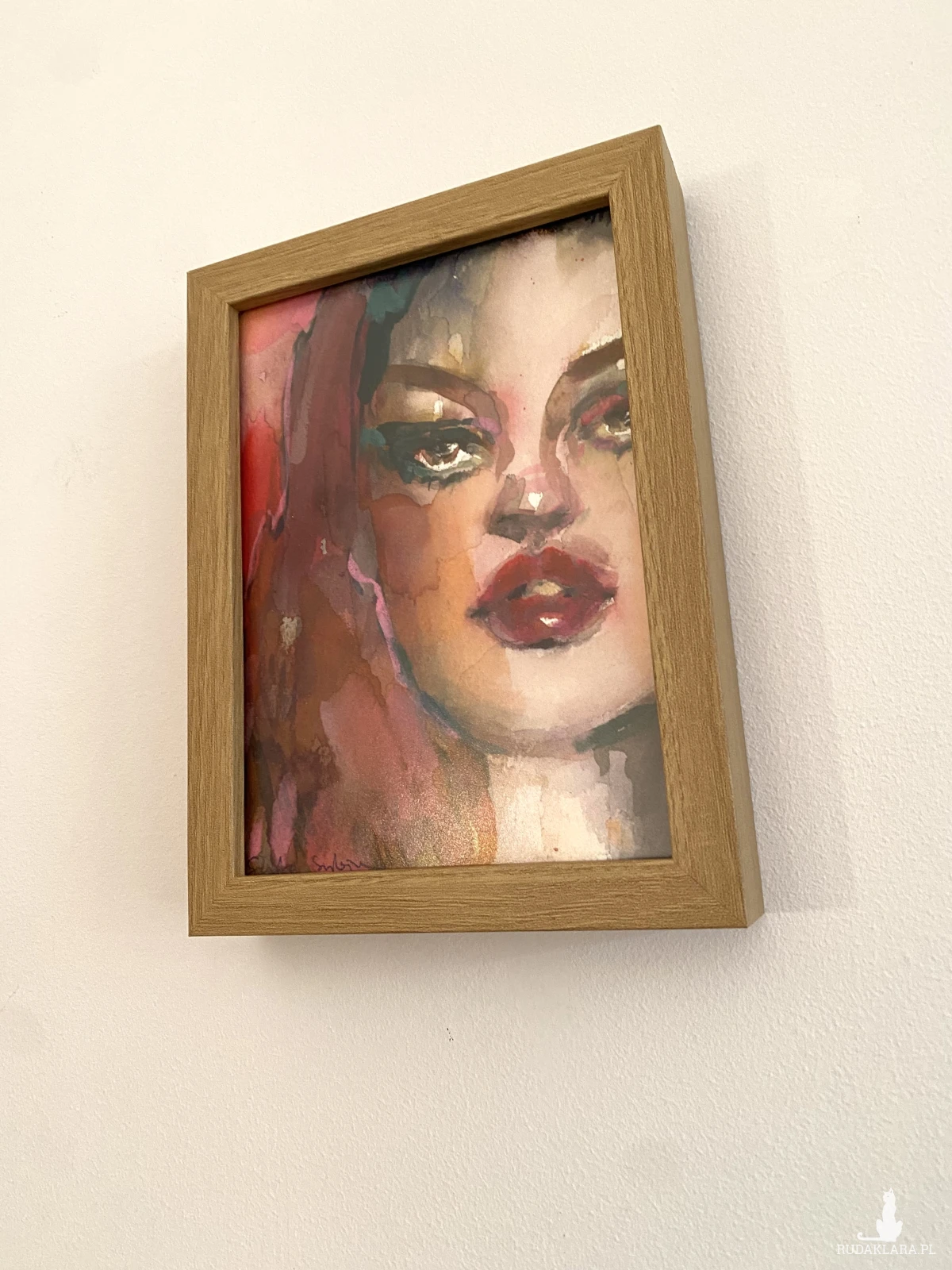 Niewielkich rozmiarów, 13x18 cm, akwarela na papierze sprzedawana w ramce ze szkłem antyrefleksyjnym. Zmysłowy, ekspresyjny portret kobiety inspirowany modą i makijażem. Subtelna dekoracja ścienna.