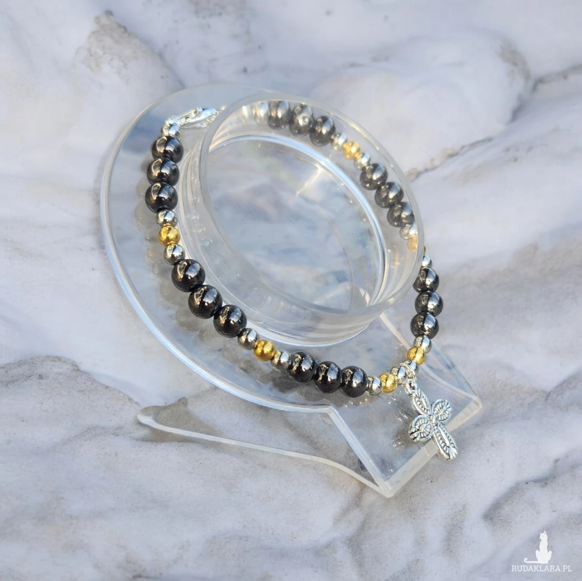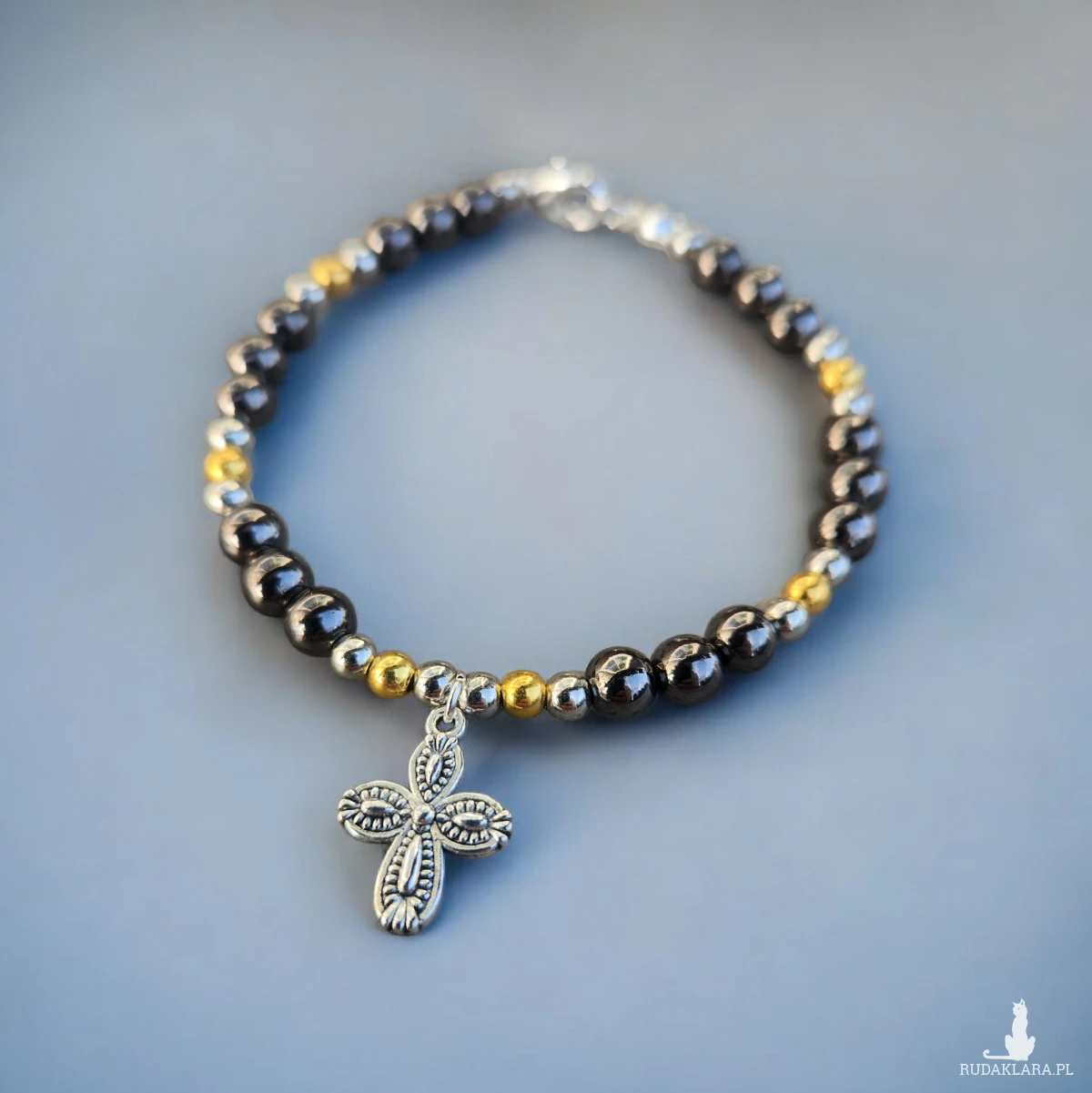 Ręcznie wykonana bransoletka z naturalnych, gładko polerowanych koralików w odcieniach grafitu, srebra i złota. Centralnym elementem jest subtelny, srebrny krzyżyk o dekoracyjnym wzorze, który nadaje całości wyjątkowego, symbolicznego charakteru.