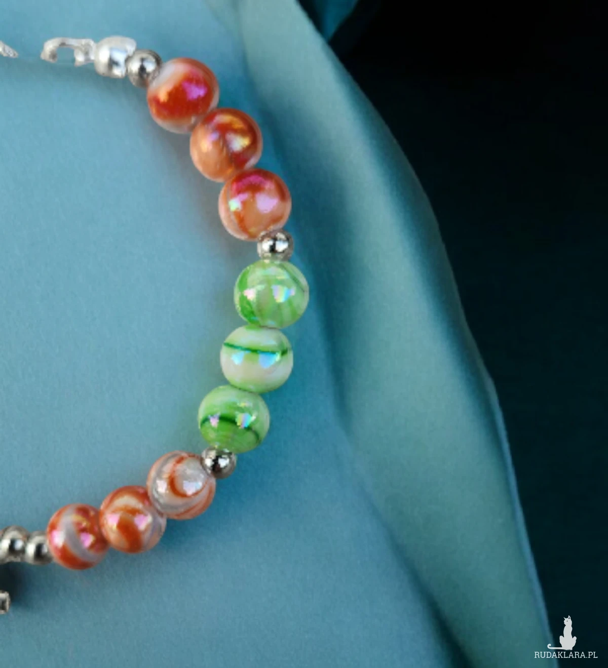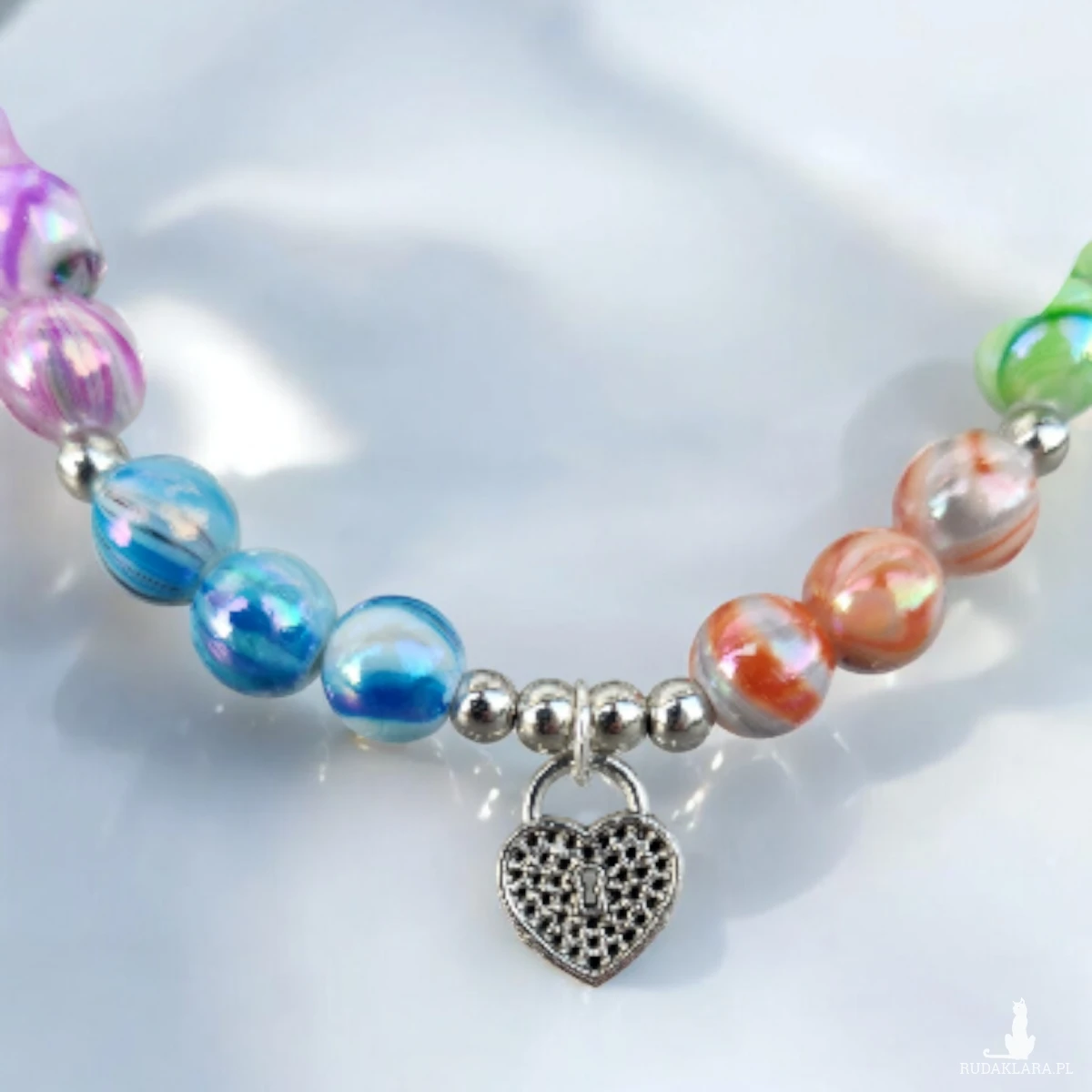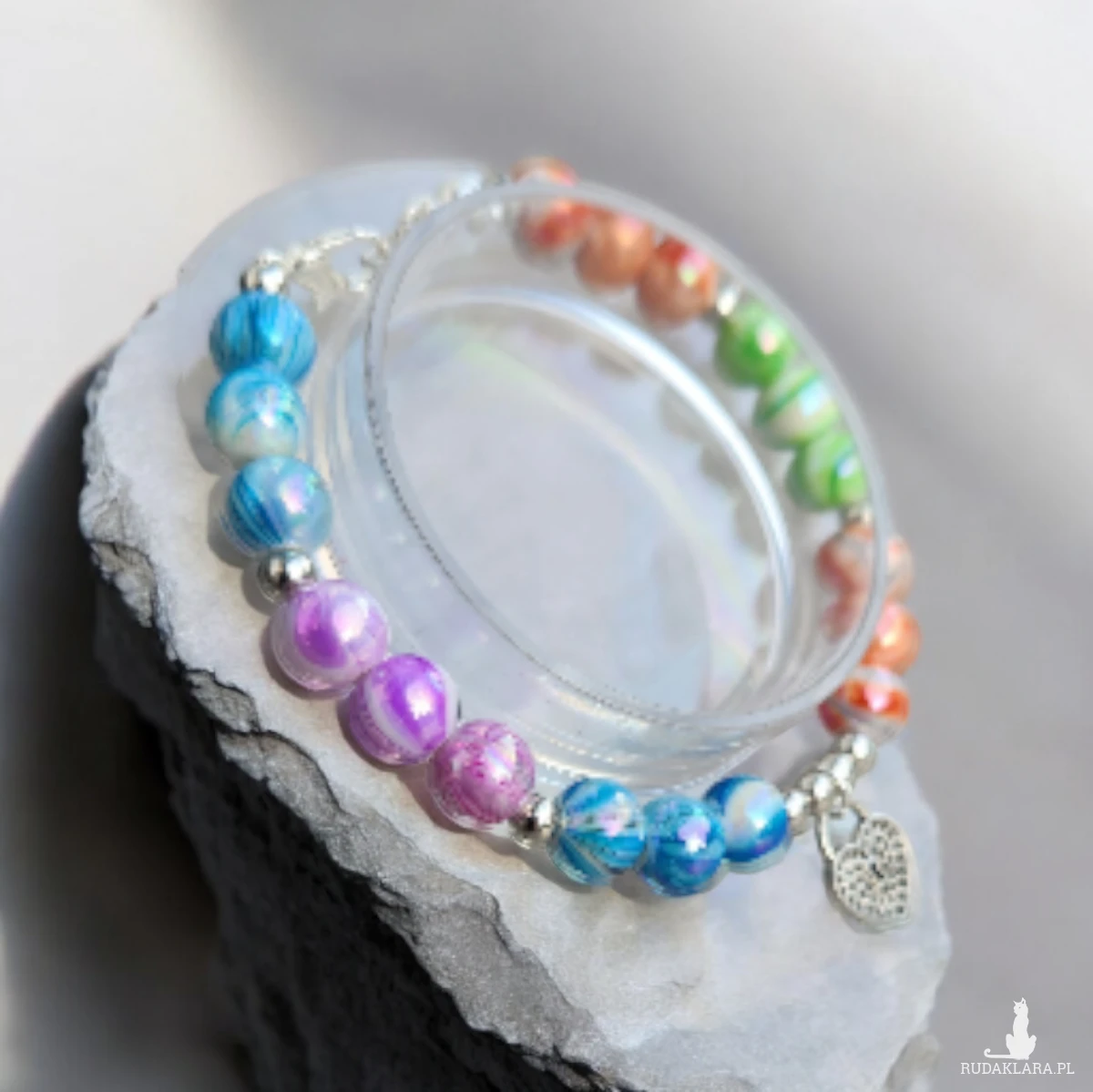 Delikatna, a jednocześnie pełna koloru bransoletka wykonana ręcznie z okrągłych, marmurkowych koralików w pastelowych odcieniach: błękitu, fioletu, zieleni oraz ciepłych tonów pomarańczu. Każdy koralik ma subtelny połysk, który pięknie odbija światło.