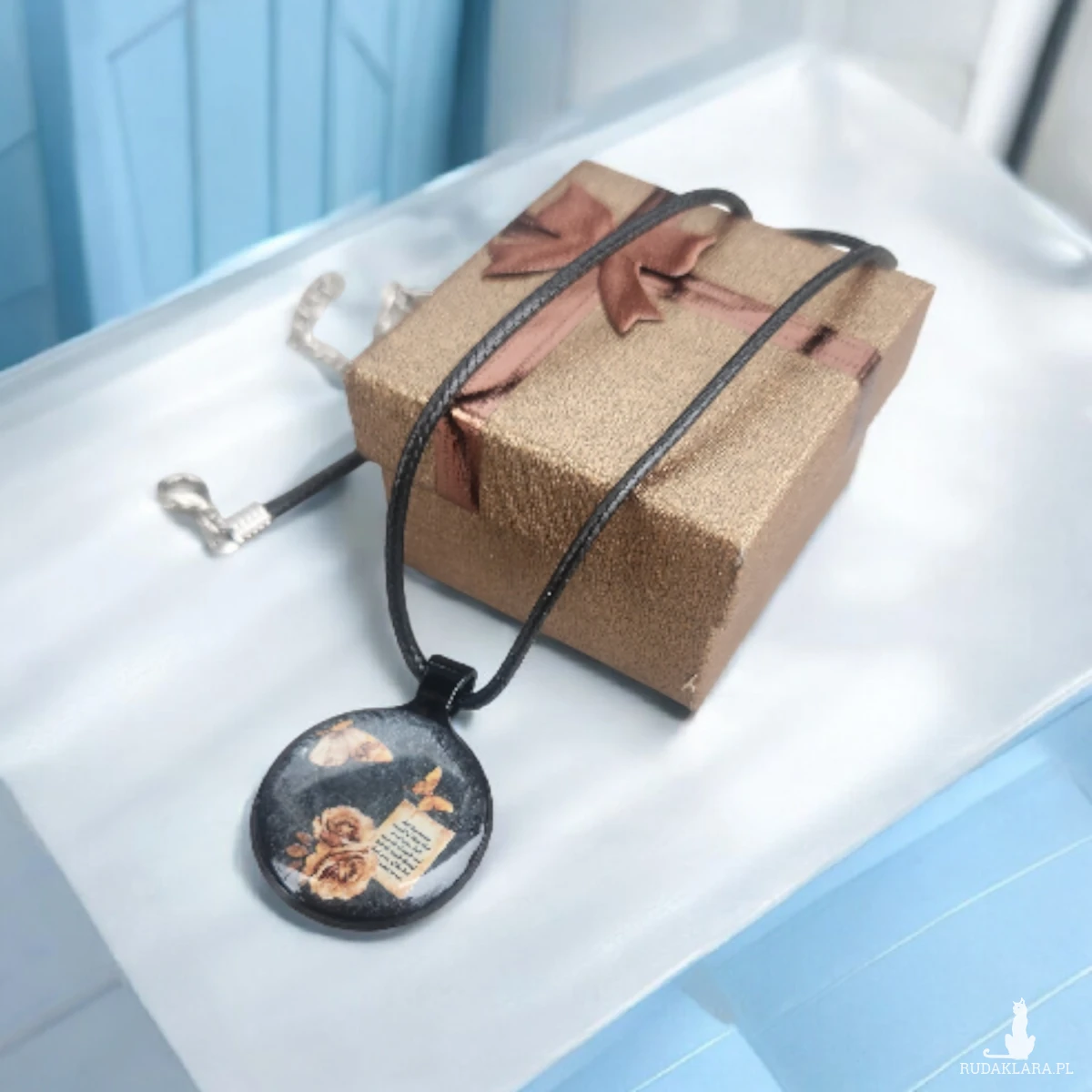 Odkryj wyjątkowy naszyjnik wykonany ręcznie z dbałością o każdy szczegół. W żywicznej zawieszce zamknięto delikatne ilustracje motyli, vintage’owe róże oraz fragment stylizowanego tekstu, tworząc niepowtarzalną kompozycję o artystycznym, nostalgicznym charakterze.