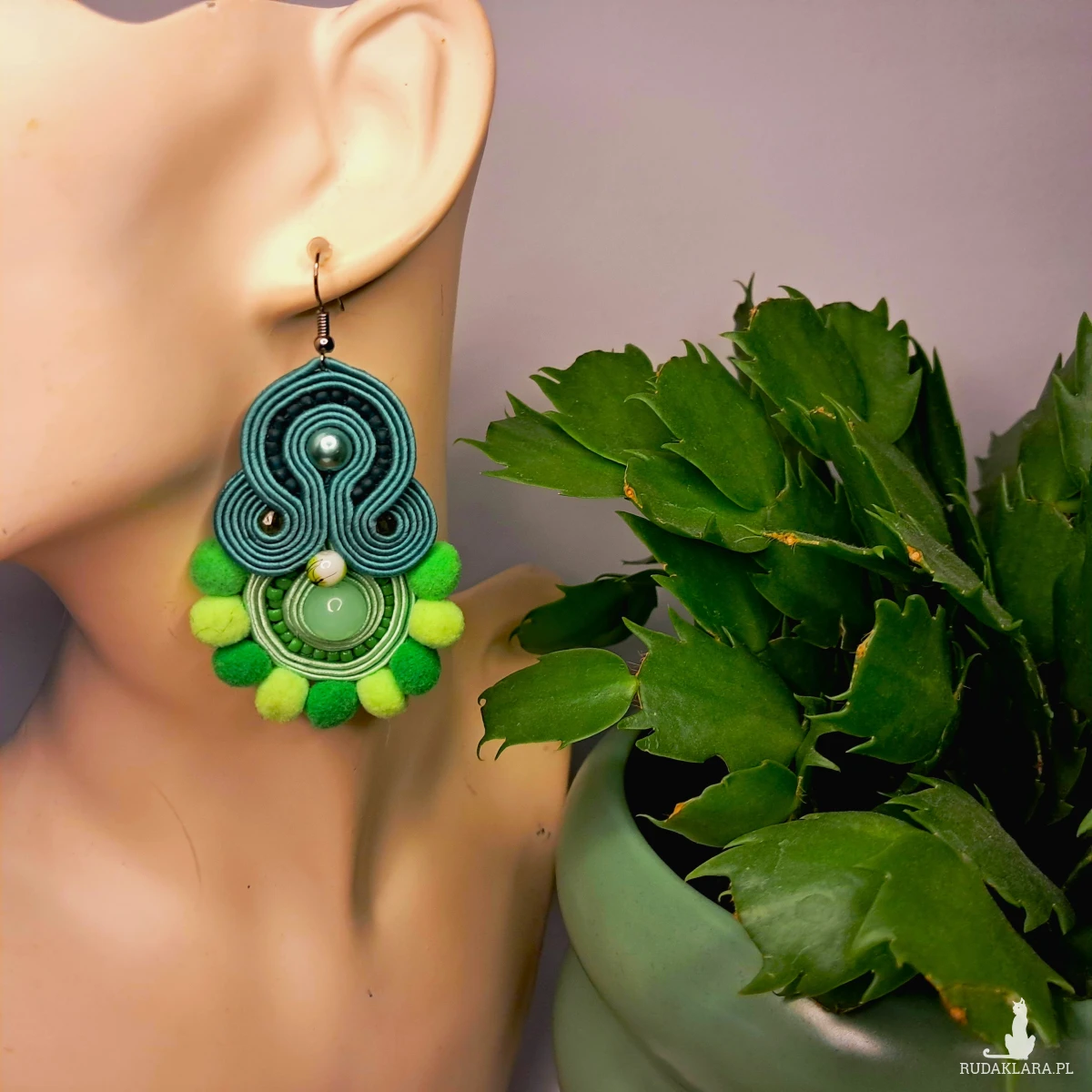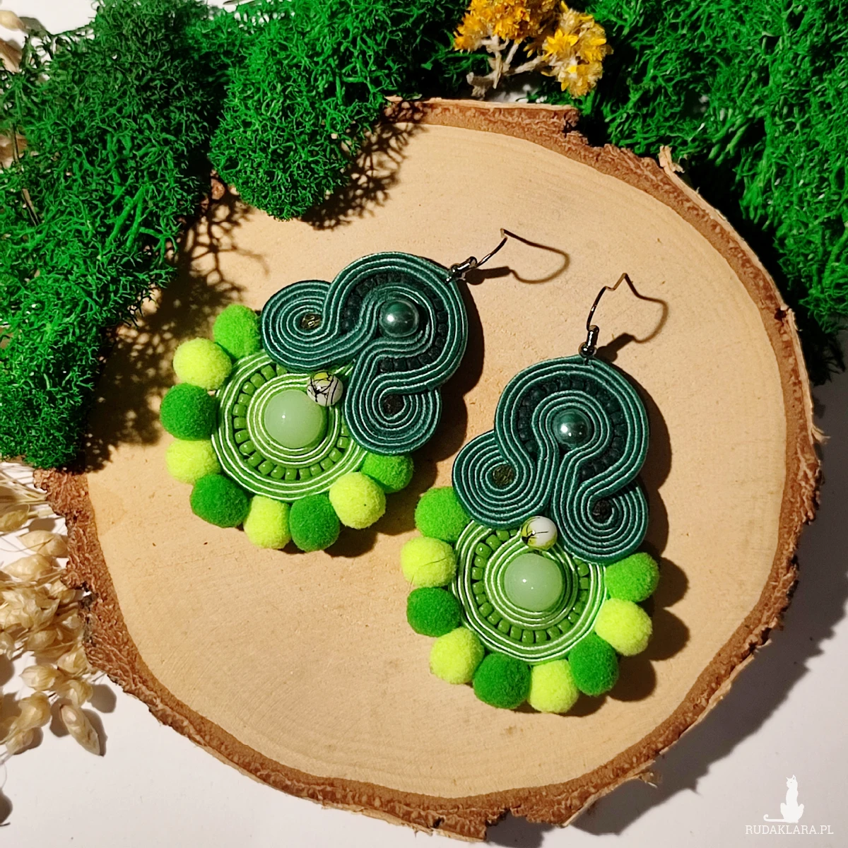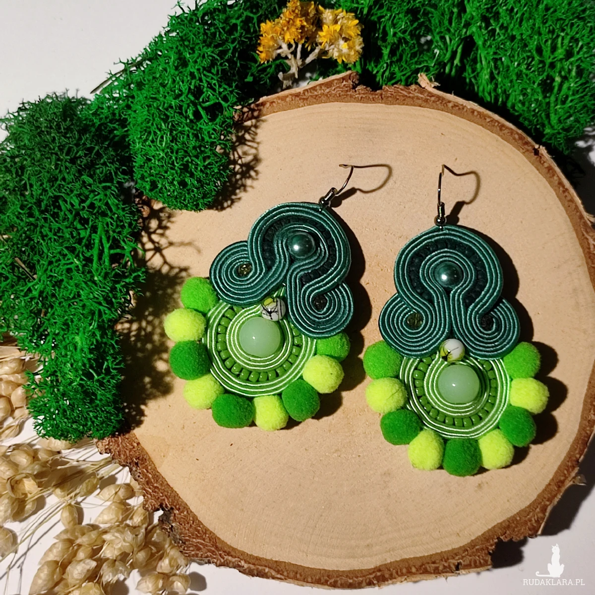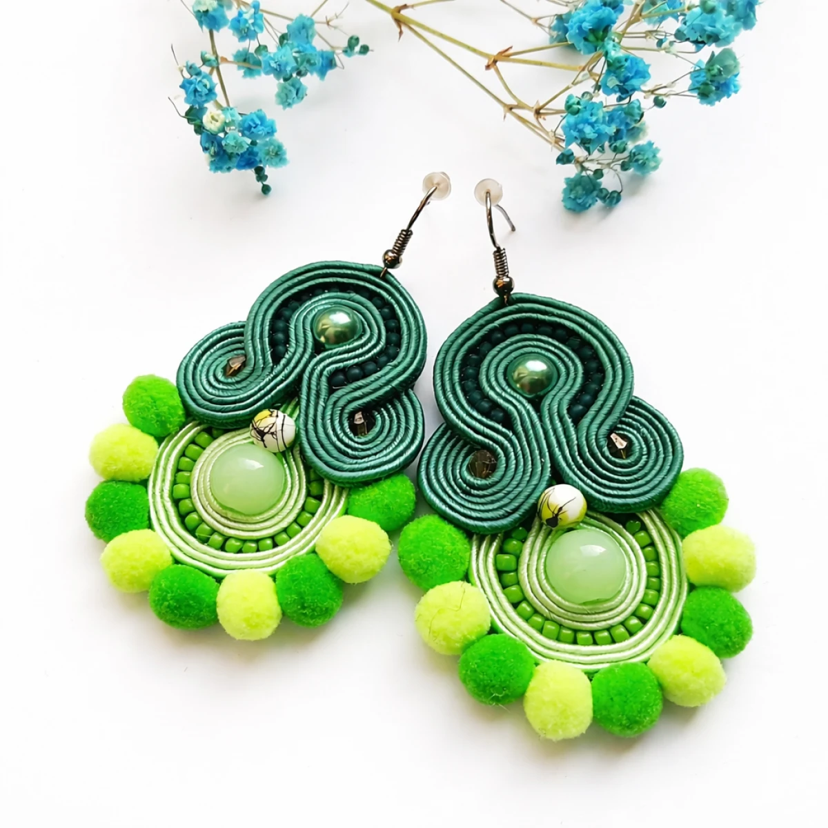 Ręcznie wykonane kolczyki metodą haftu sutasz w harmonijnych odcieniach zieleni. Kompozycja łączy eleganckie skręty soutache, delikatne koraliki oraz miękkie pompony, tworząc wyjątkowy, przyciągający wzrok design.
