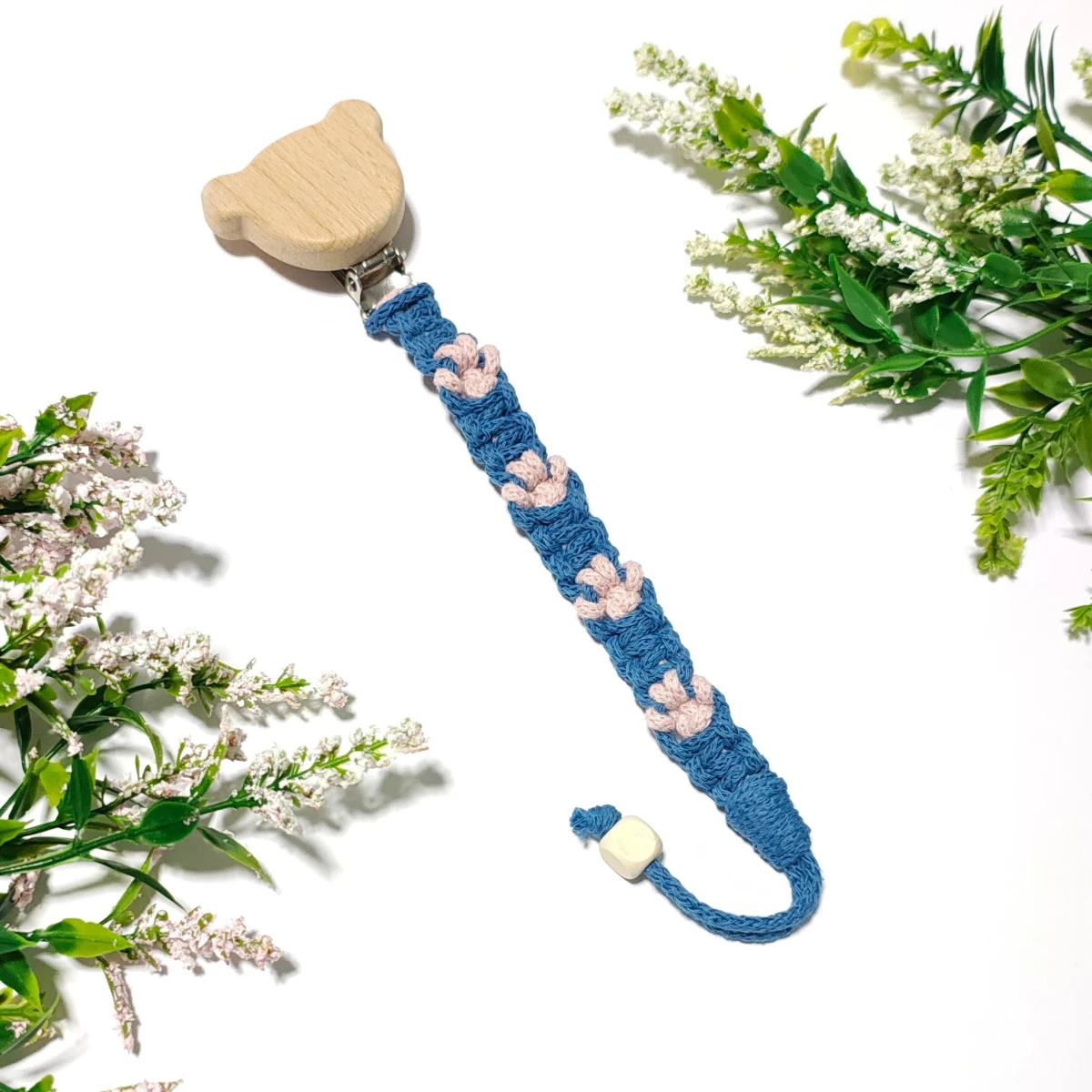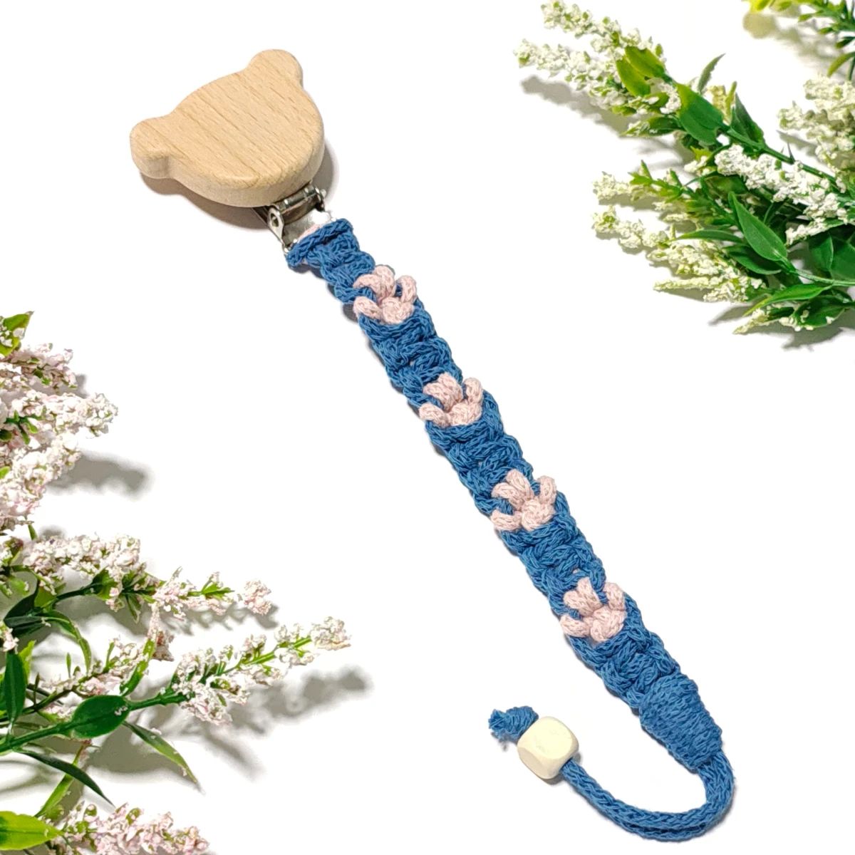 Wykonana techniką makramy ze sznurków bawełnianych z certyfikatem Standard 100 by OEKO-TEX w klasie I (co oznacza, że są bezpieczne i mogą być stosowane w produktach dla niemowląt i dzieci do lat 3) i klipsa z nielakierowanego drewna bukowego.