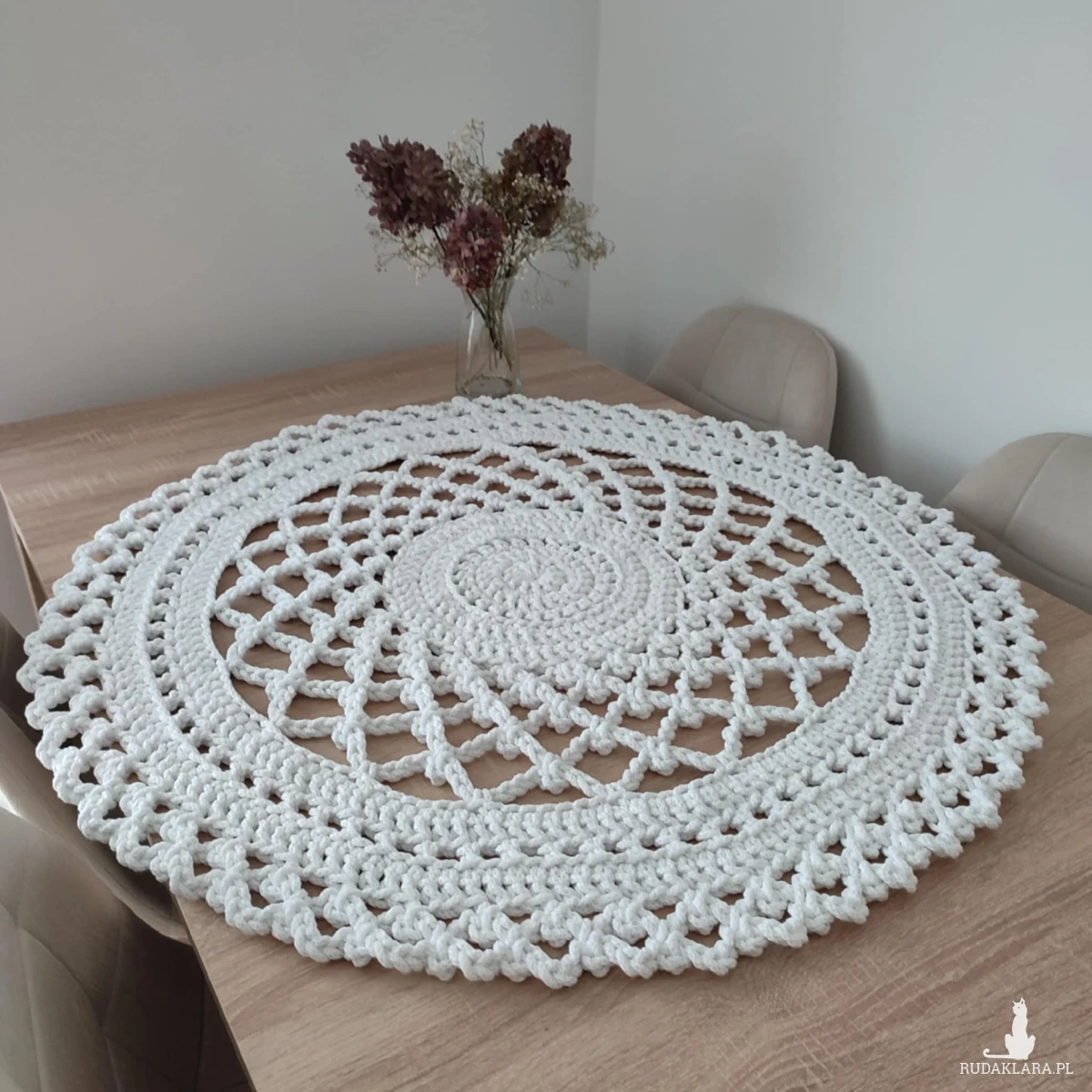 Serweta o średnicy 90cm, wykonana metodą szydełkowania z polskiego sznurka bawełnianego 5mm.