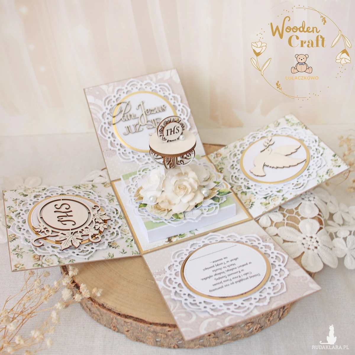 Wewnątrz boxa znalazła się, przepiękna tekturka 3D kielich z hostią świętą, otoczony kompozycją kwiatową z ręcznie wykonanymi różami. Na ściankach boxa umieszczone zostały tekturki hostia z winoroślą, tekturka gołębicy z gałązką oraz cytat "Pan Jezus już się zbliża", a także życzenia. Pod tekturką 3D umieszczone zostało mini pudełeczko, do którego można włożyć prezent pieniężny.