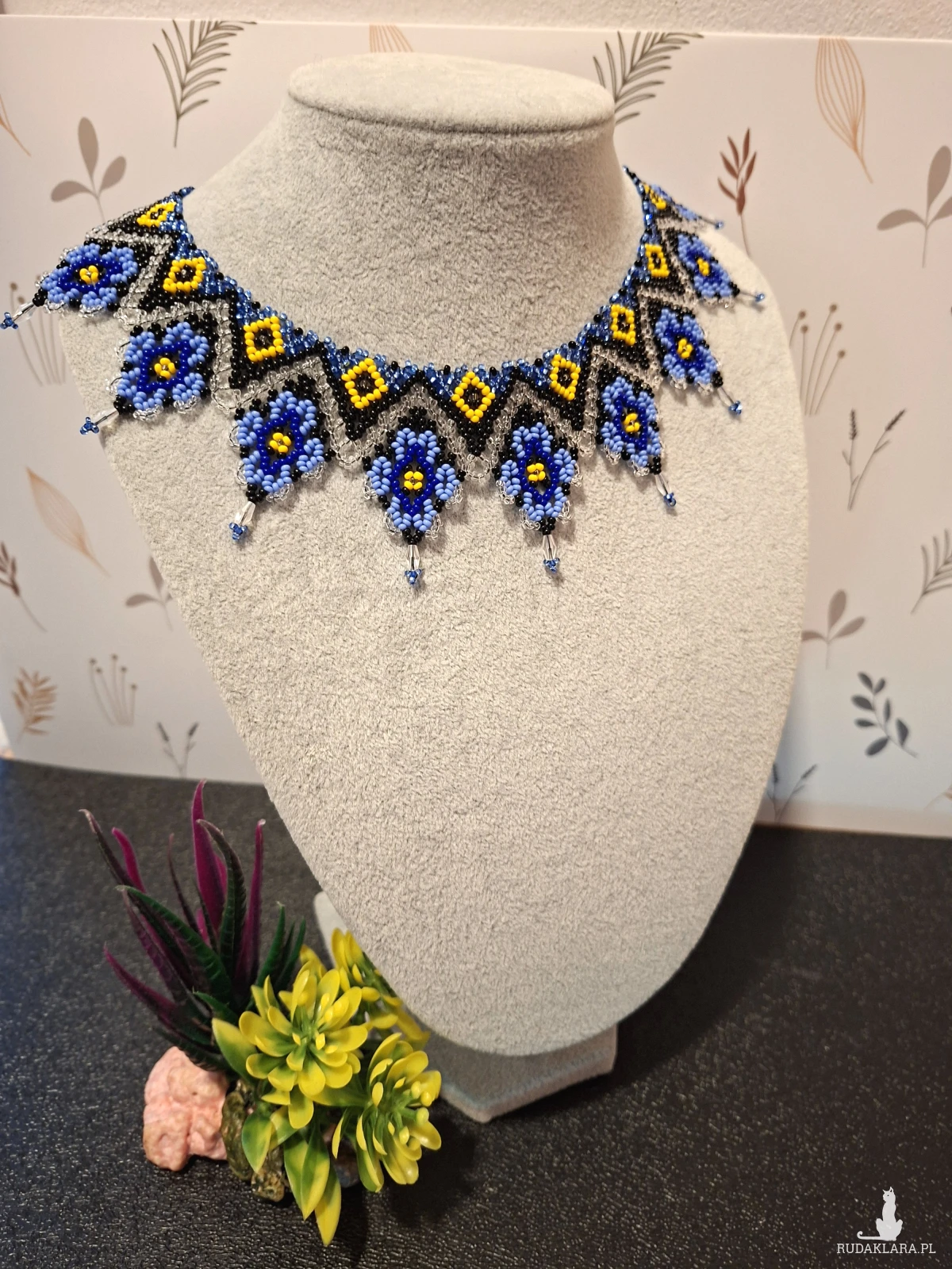 Wyraziste połączenie niebieskich kwiatów z żółtymi akcentami na tle głębokiej czerni tworzy biżuterię, która nie tylko zdobi, ale niesie ze sobą duszę i historię.