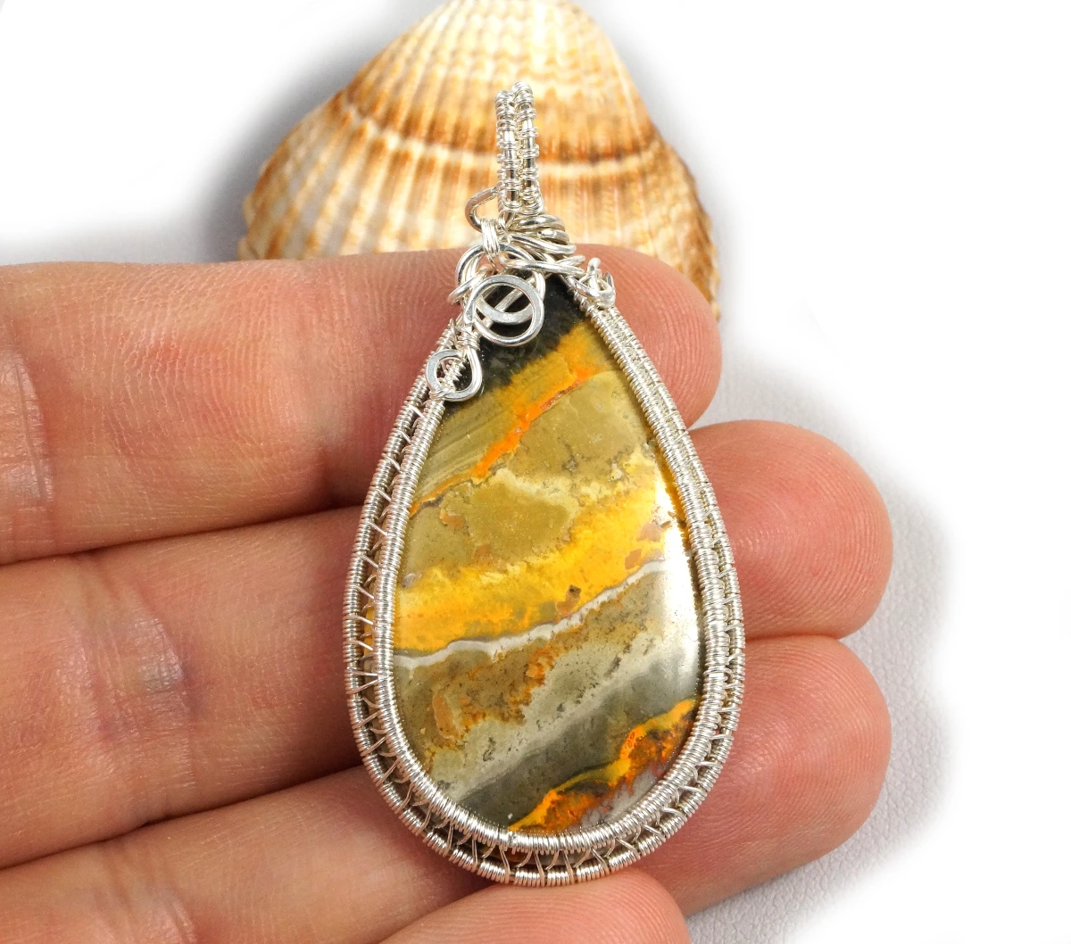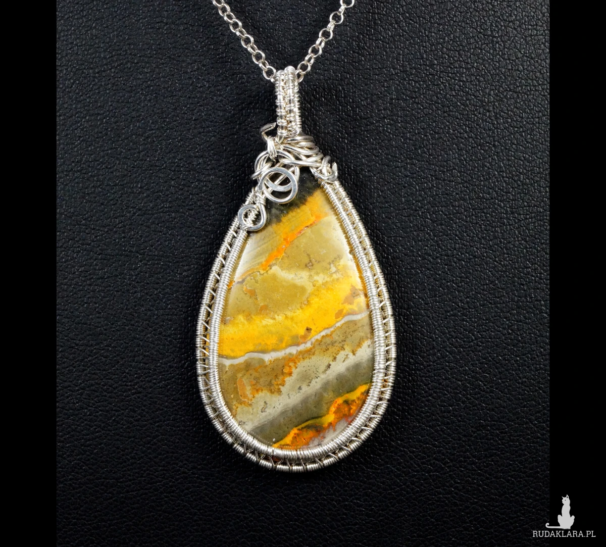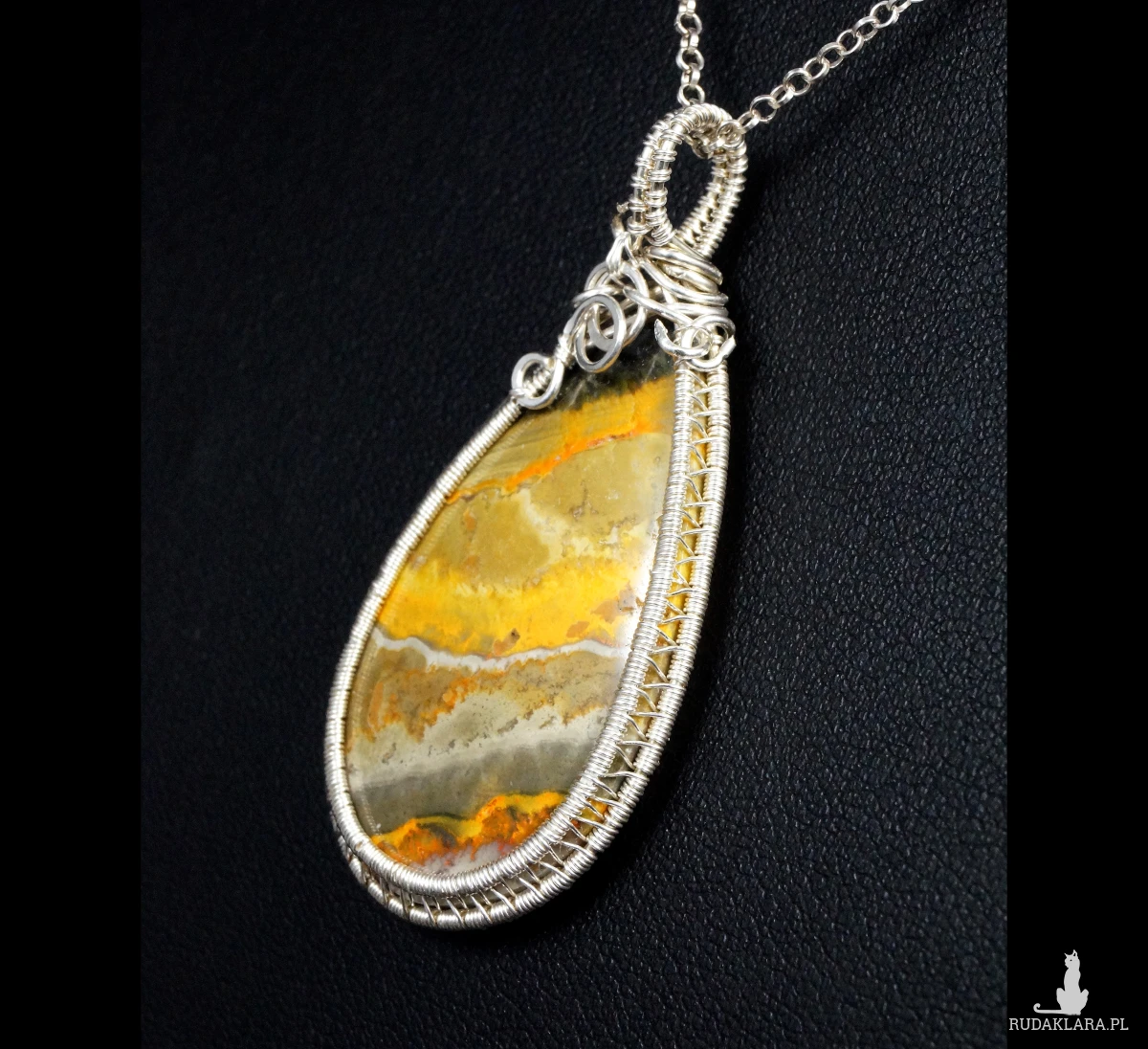 Bajeczny, misternie pleciony wisior z kaboszonem jaspisu bumbelbee w żółto szarym kolorze.