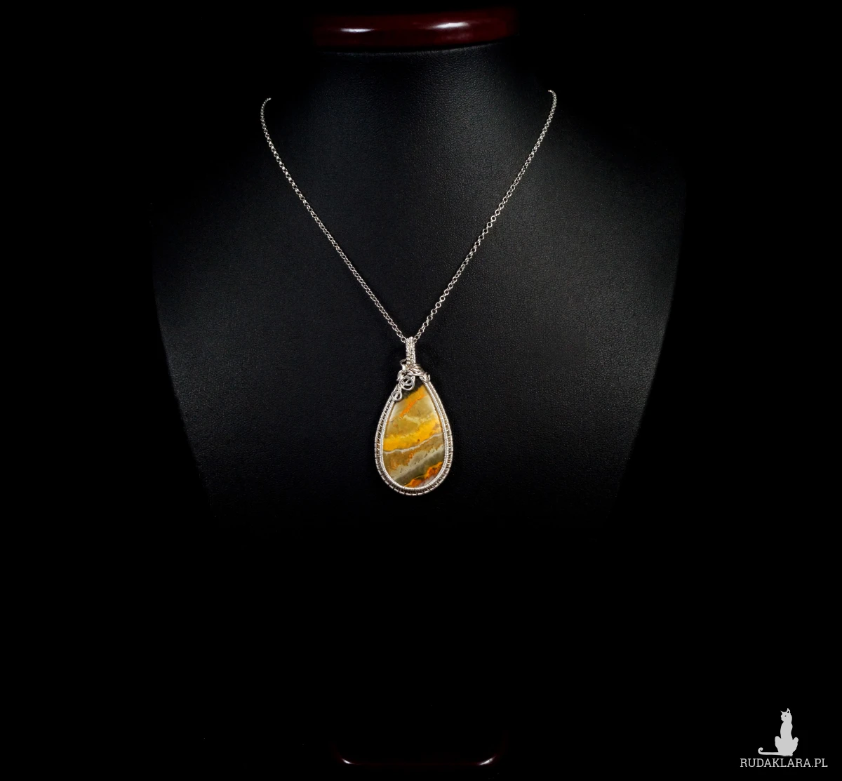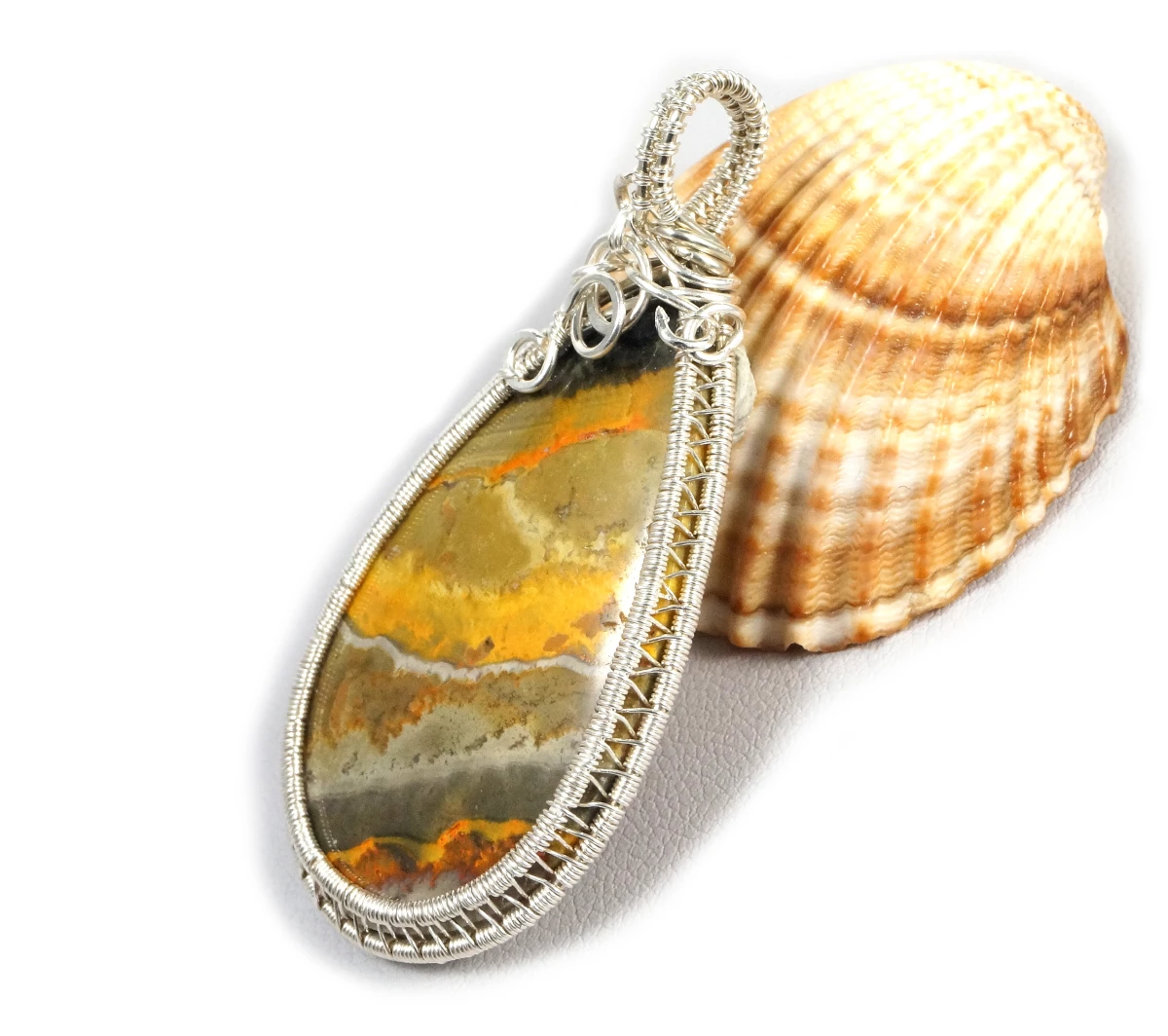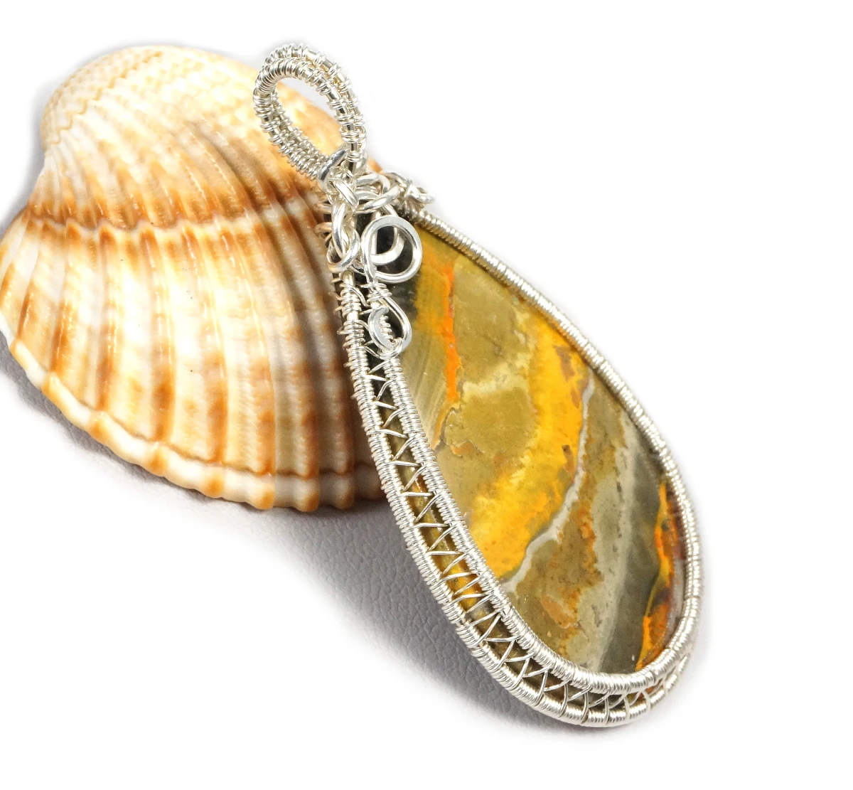 Bajeczny, misternie pleciony wisior z kaboszonem jaspisu bumbelbee w żółto szarym kolorze.