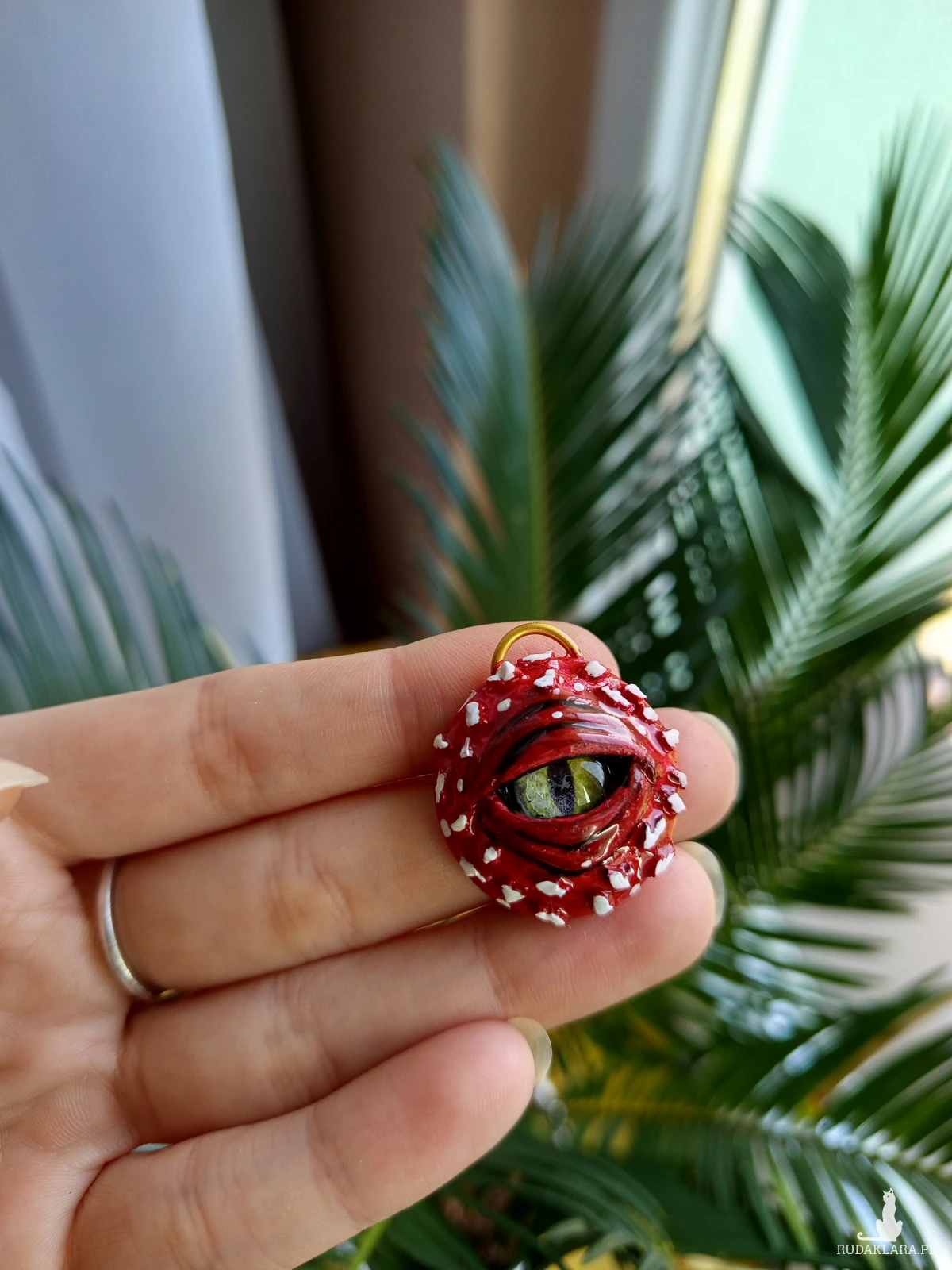 Ten niezwykły naszyjnik w kształcie kapelusza muchomora skrywa w sobie tajemnicze oko, nadając mu mistycznego i lekko niepokojącego charakteru. Rzeźba została ręcznie wykonana z glinki polimerowej i utrzymana w naturalnych barwach muchomora – czerwieni, bieli i subtelnych cieni inspirowanych leśnym runem.